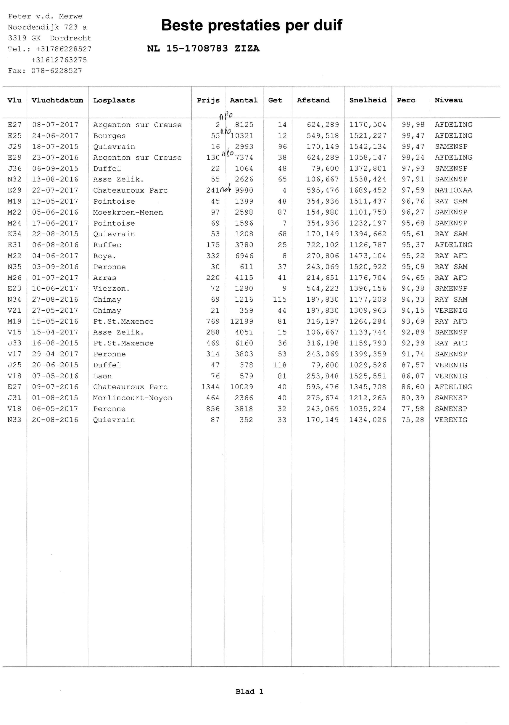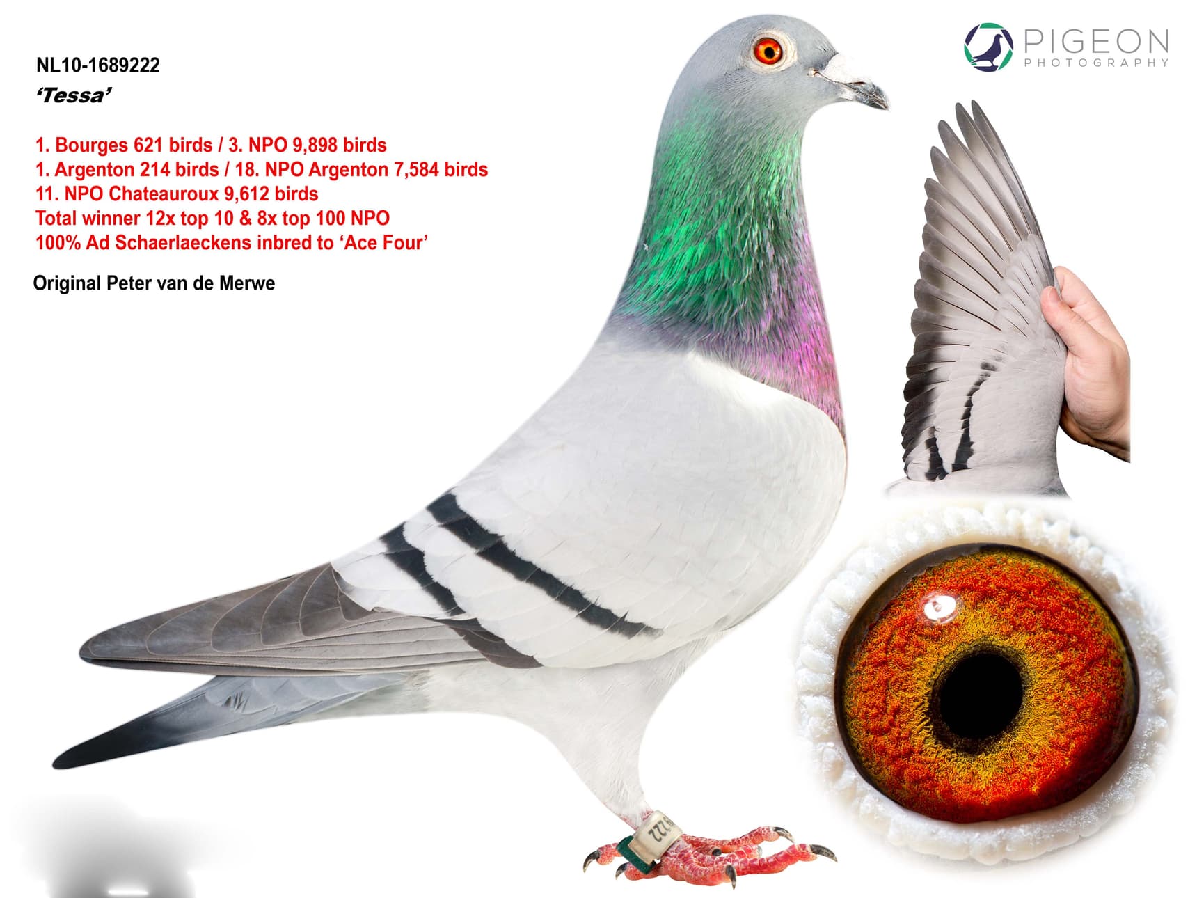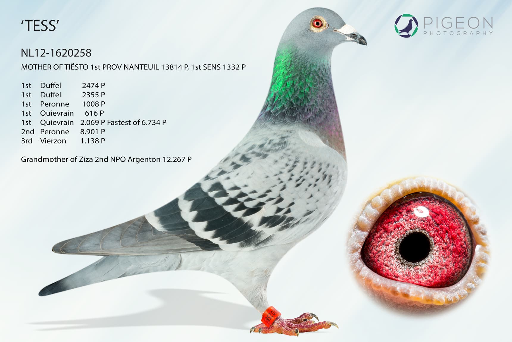 WON: 2nd NAT. ARGENTON 12,267b. (after loftmate) – 8th BOURGES 1,186b. – 55th NPO BOURGES 10,321b. – 16th QUIEVRAIN 2,993b. – MOTHER OF SEVERAL TOP BIRDS – MOTHER OF 2nd /8,125b. – DIRECT DAUGHTER OF “TIESTO” x “TESS”