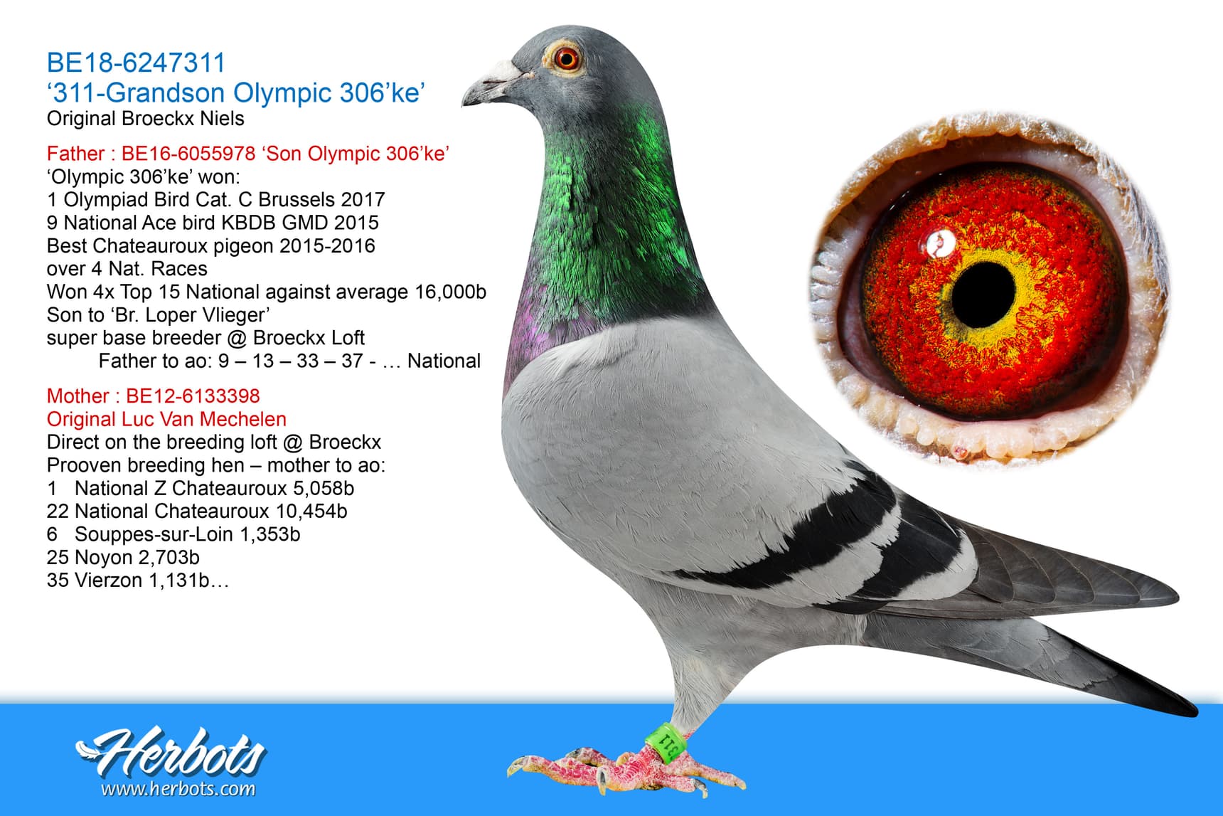 1/2 brother to :’15-821’1 National Z Chateauroux 5,058b - 22 National Chateauroux 10,454b - 26 Bourges 5,803b - 35 Vierzon 1,131b - 49 Vierzon 2,644b- 67 Melun 2,663b - 96 Chevrainvillers 4,216b - 3rd Best Belgium Pigeon Great Middle Distance