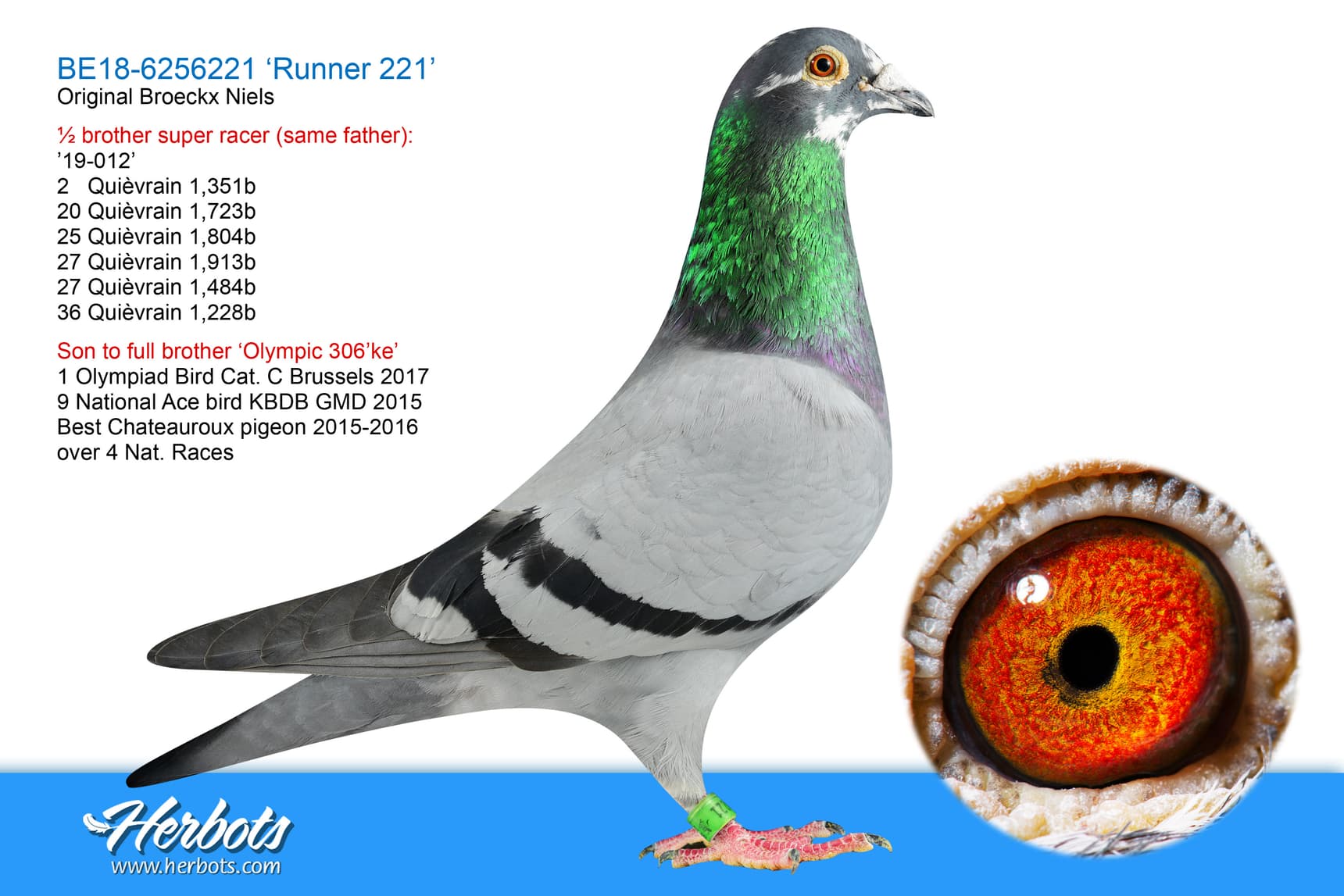 ½ brother super racer (same father):’19-012’: 2 Quièvrain 1,351b - 20 Quièvrain 1,723b - 25 Quièvrain 1,804b - 27 Quièvrain 1,913b - 27 Quièvrain 1,484b - 36 Quièvrain 1,228b - Son to ‘Energetic Runner’: Full brother ‘Olympic 306’ke’ : 1 Olympiad Bird Cat. C Brussels 2017