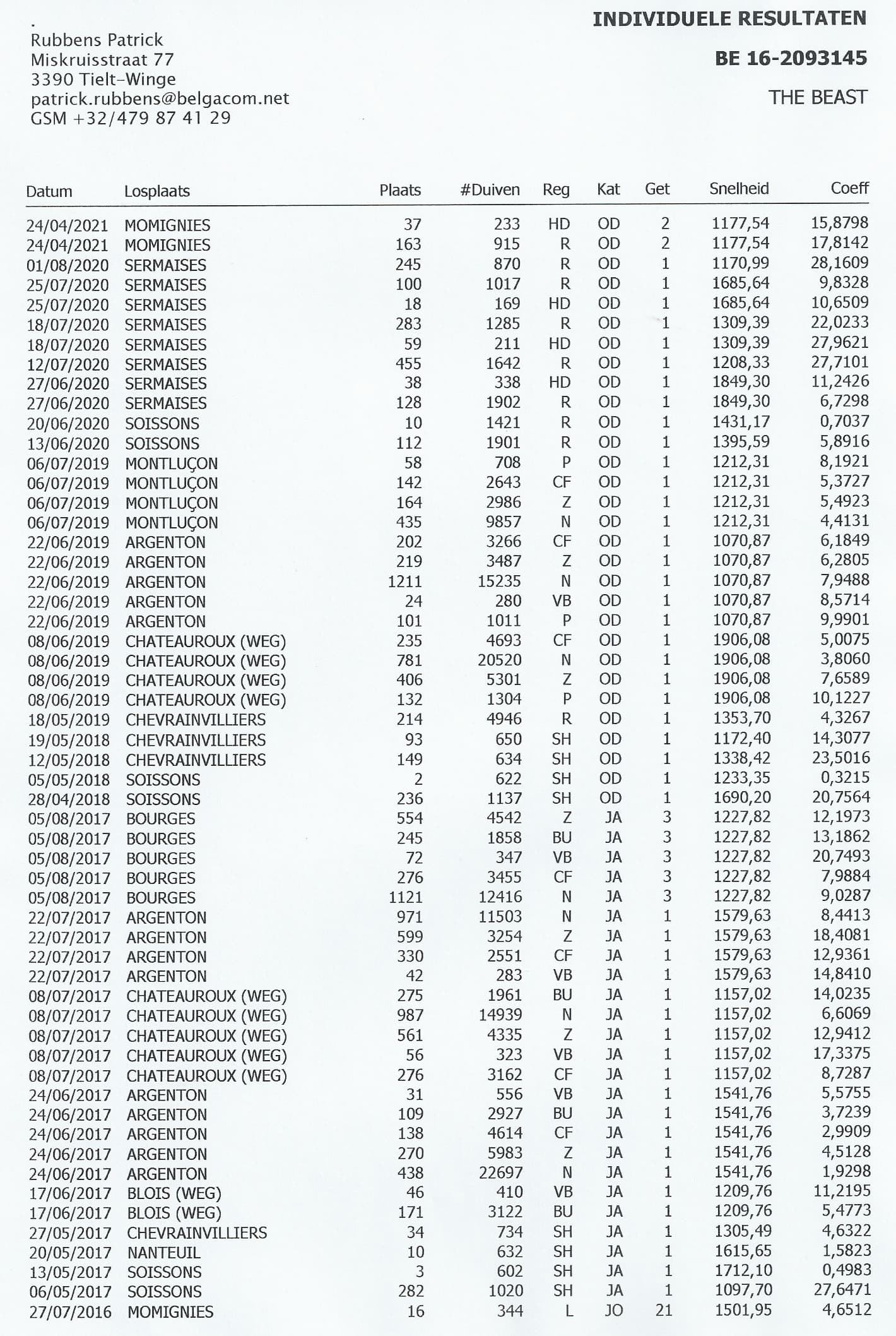 Won (no doubles) : 2nd Soissons 622b. - 3rd Soissons 602b. - 10th Soissons 1,421b. – 10th Nanteuil 632b. – 34th Chevrainvilliers 734b. - 214th Chevrainvilliers 4,946b. - 435th Nat. Montluçon 9,857b. – 438th Nat. Argenton 22,697b. - 781th Nat. Chateauroux 20,520b. – and so on
