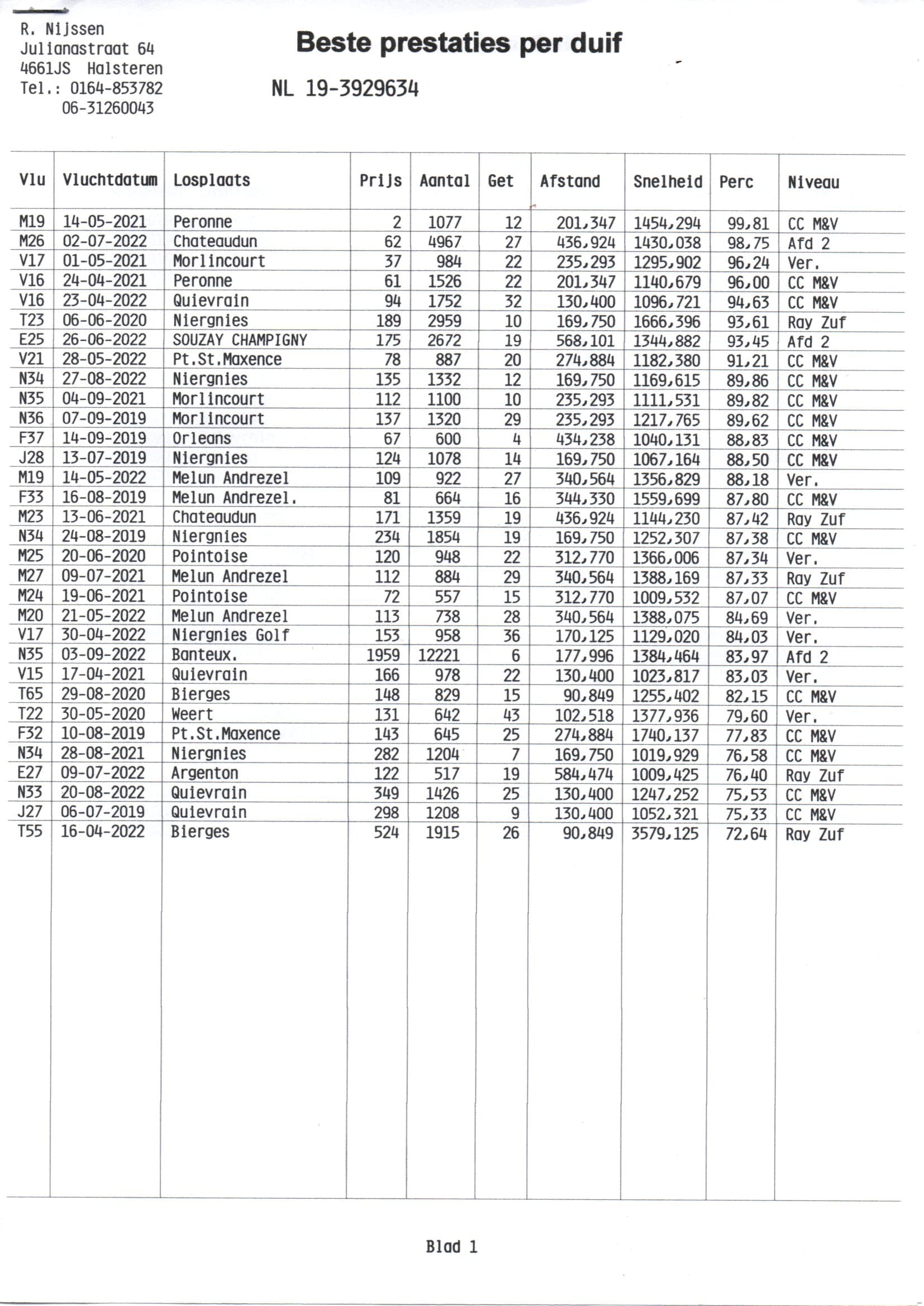 Nestligger   van de 19-  3929633 1e Orleans 225 duiven  ( 8e NPO Orleans 4234 birds )  434 km en 1e Melun 301 duiven