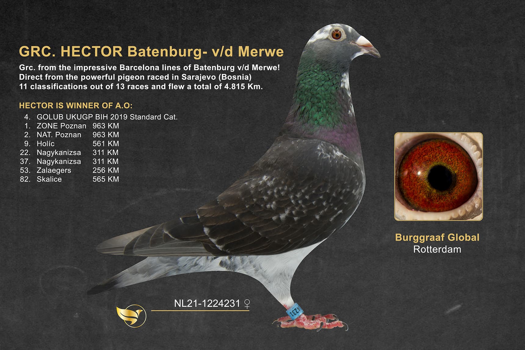 He is a exceptional bird, who won 2nd NAT. POZNAN 963 KM. Hector is a powerful pigeon raced in Sarajevo (Bosnia). Total 11 classifications out of 13 races and flew a total of 4.815 KM. After these performances he was purchased by Burggraaf Global to strengthen their breeding loft. Both parents are directy Batenburg v/d Merwe!