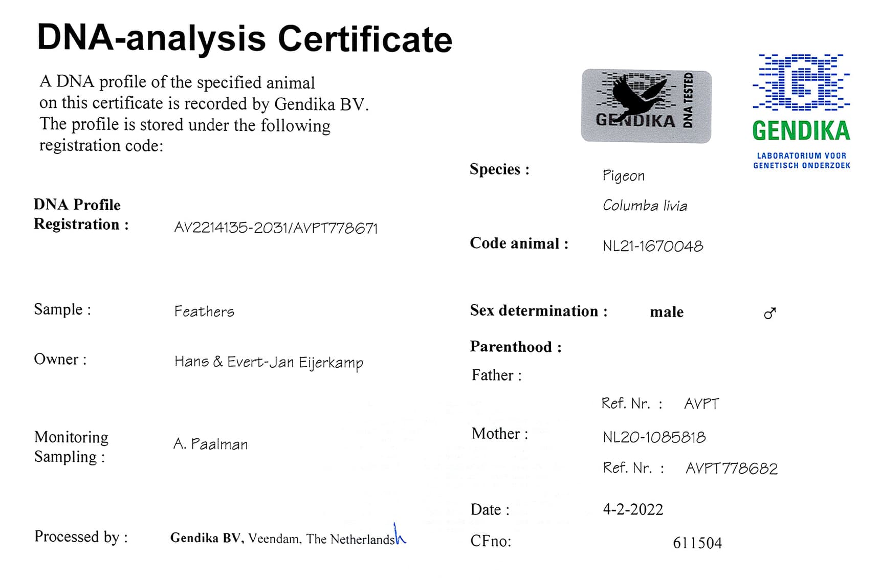 Direct son “Antar” (original Roeper W. – son “Der 269”) x “Daughter Jaguar 004” (duaghter Olympiad bird Brussels short distance ’17 – 5th Nat. ace KBDB short distance)