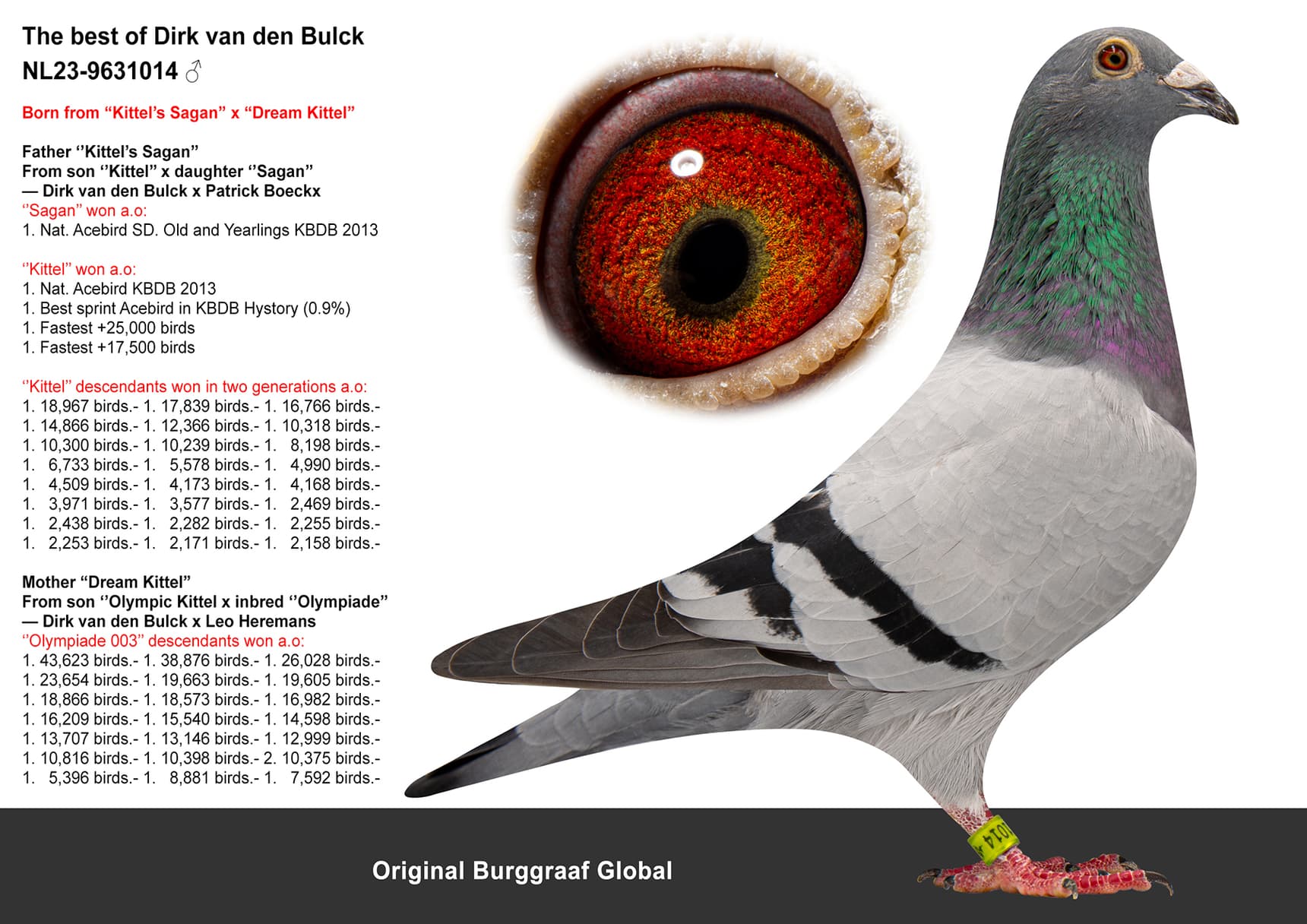Specially from the breeding loft of Burggraaf Global. This pigeon has not been raced!