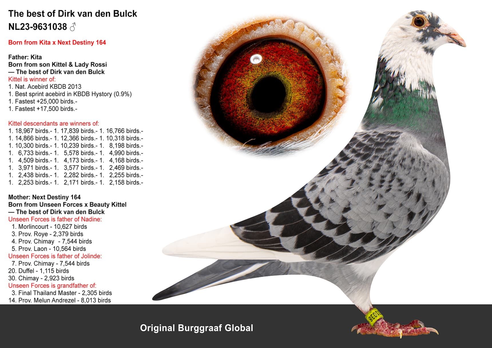 Specially from the breeding loft of Burggraaf Global. This pigeon has not been raced!