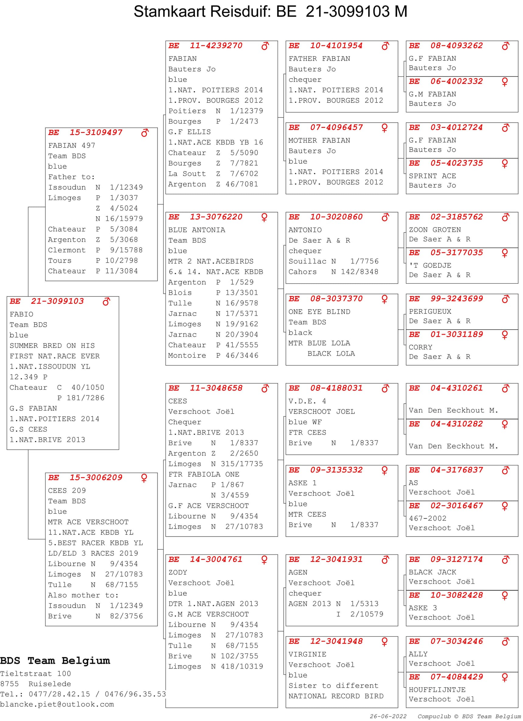 "Fabio" is of the smaller type and at the time of his victory had knocked 2 pins. It is a summer boy of 2021 which was only trained in his year of birth.   As preparatory races they flew this season 1 x Arras, 1 x Clermont, 1 x Fontenay, 1 x Chateaudun and 1 x Chateauroux. There is training 1 x per day, always in the evening.