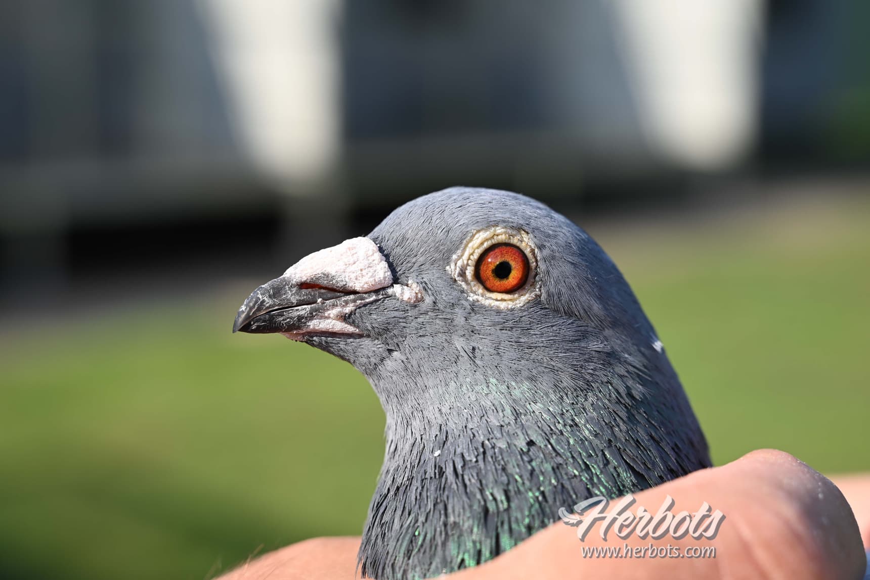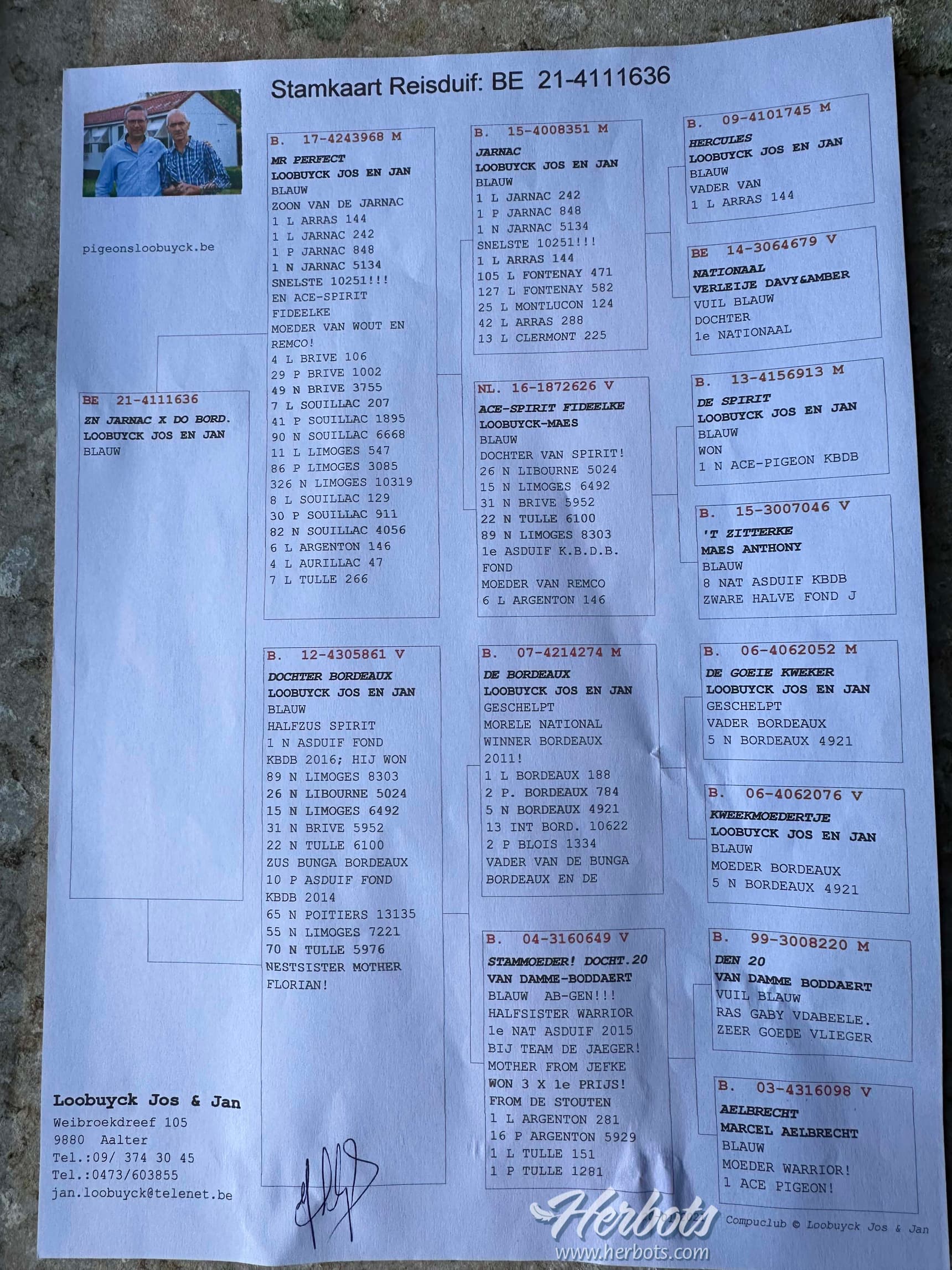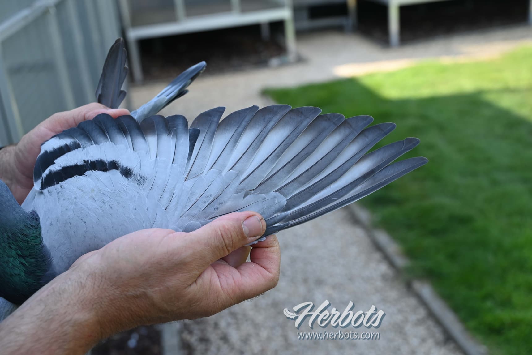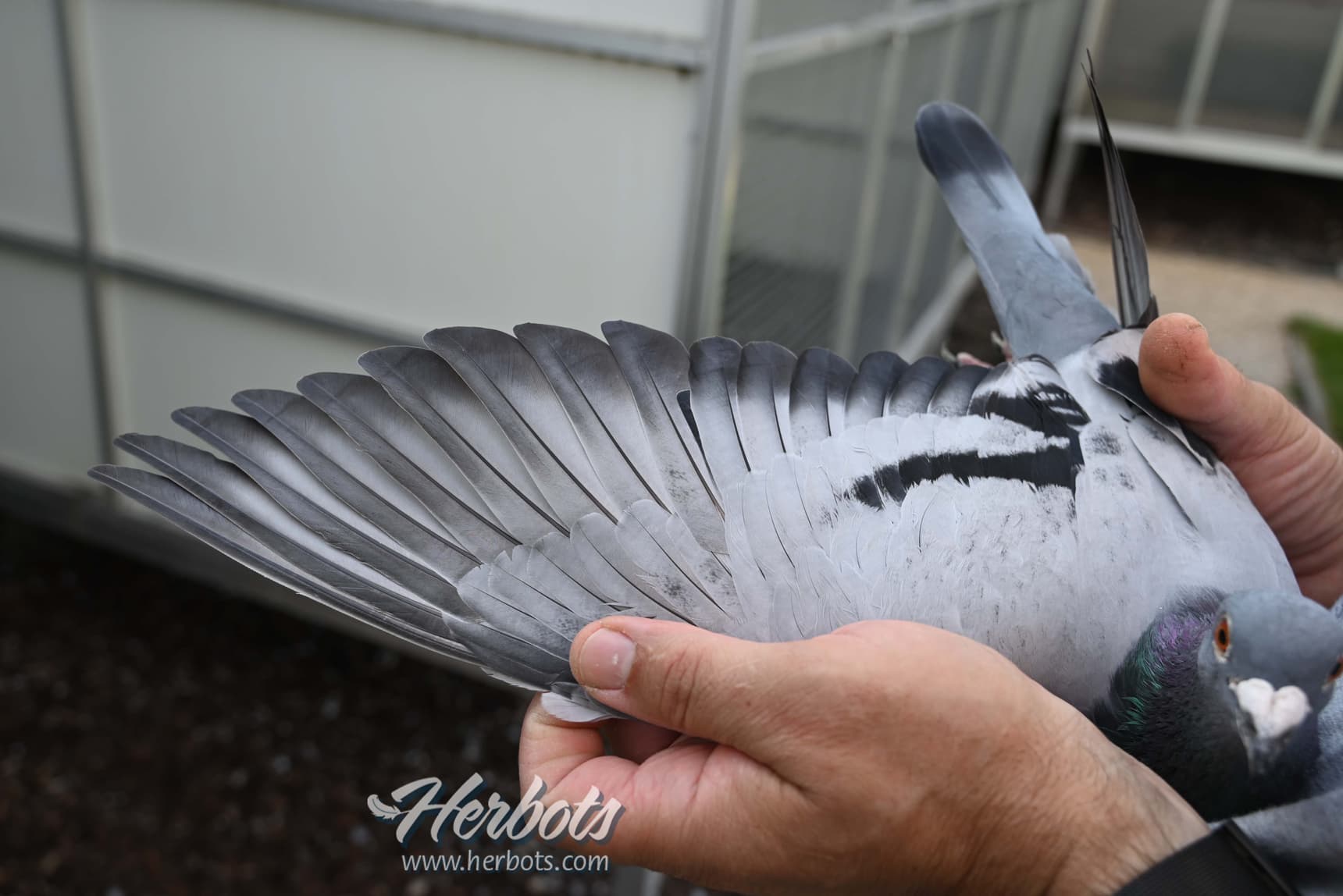 This time it is blue cock "B21-4111636", an original Loobuyck Jan and Jos cock that claims the biggest honour. "Unfortunately, I didn't see it coming" explains Gunther "I thought I still had time to feed the youngsters when suddenly I heard a pigeon fall on the aviary. On going outside I saw that it was a Bergerac kite. I couldn't believe my eyes.