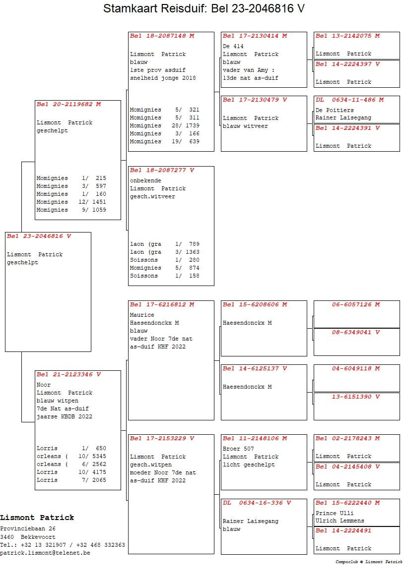 Cette femelle à carreaux est une fille du "682/20" qui a remporté 2 x 1er Momignies et est un fils du "148/18" 1 As pigeon provincial vitesse pigeonneaux RFCB. La mère de « 816/23 » est « Noor ». Elle est devenue 7e As Pigeon National demi-fond yearlings RFCB en 2022.