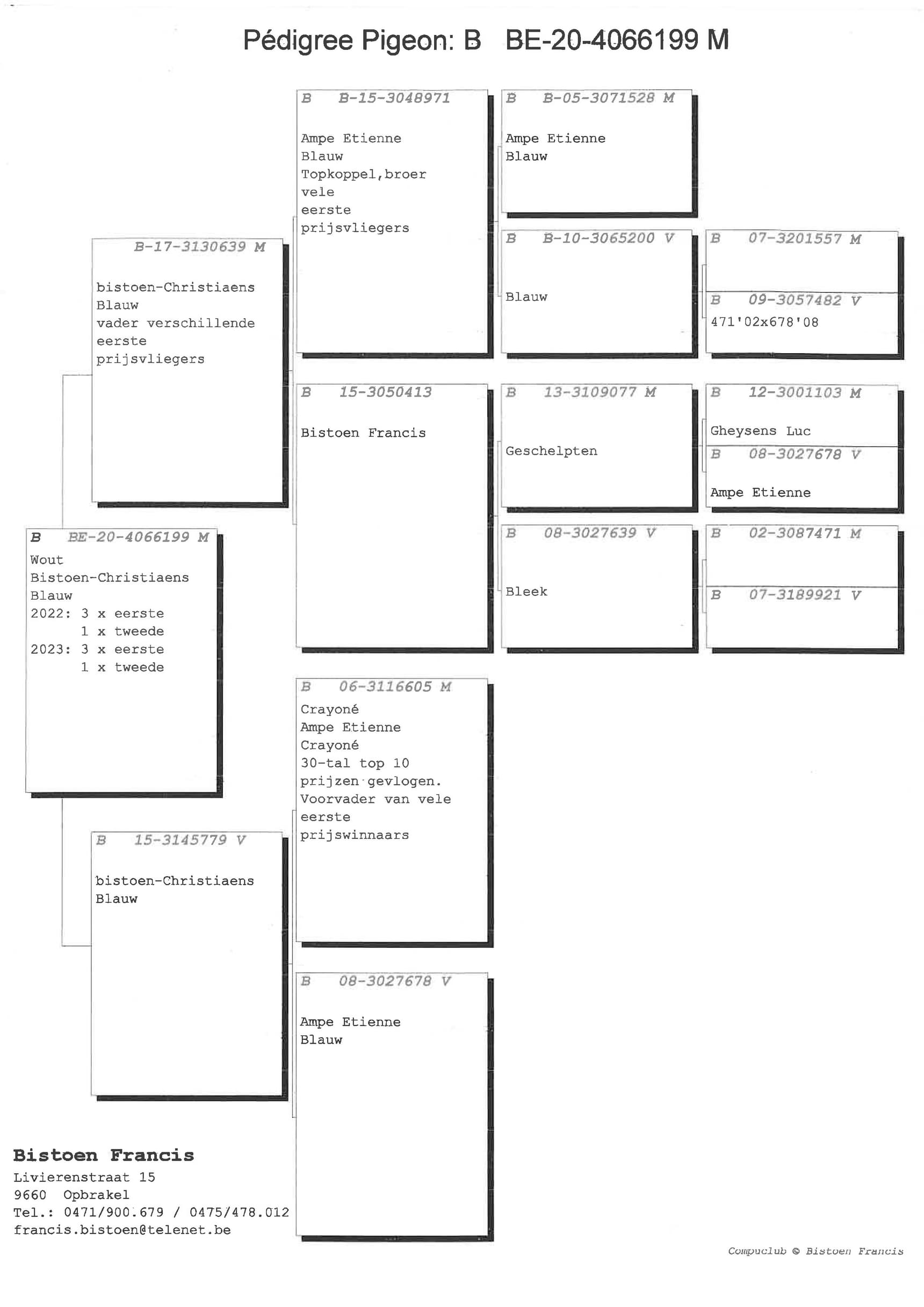Ce top mâle « Wout » s'est également imposé 1er contre 119 pigeons et 3ème contre 88 pigeons. Il a également gagné 3 x 1er et 1 x 2e la saison dernière. Il s'agit d'un zoo de « 639/17 » Etienne Ampe x Francis Bistoen x « 779/15 » Blauw Etienne Ampe. La colonie ici est dirigée par Francis Bistoen et son épouse Véronique Christiaens.