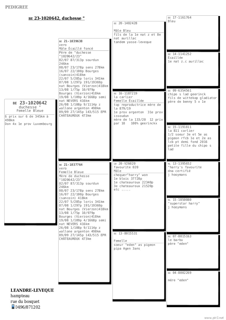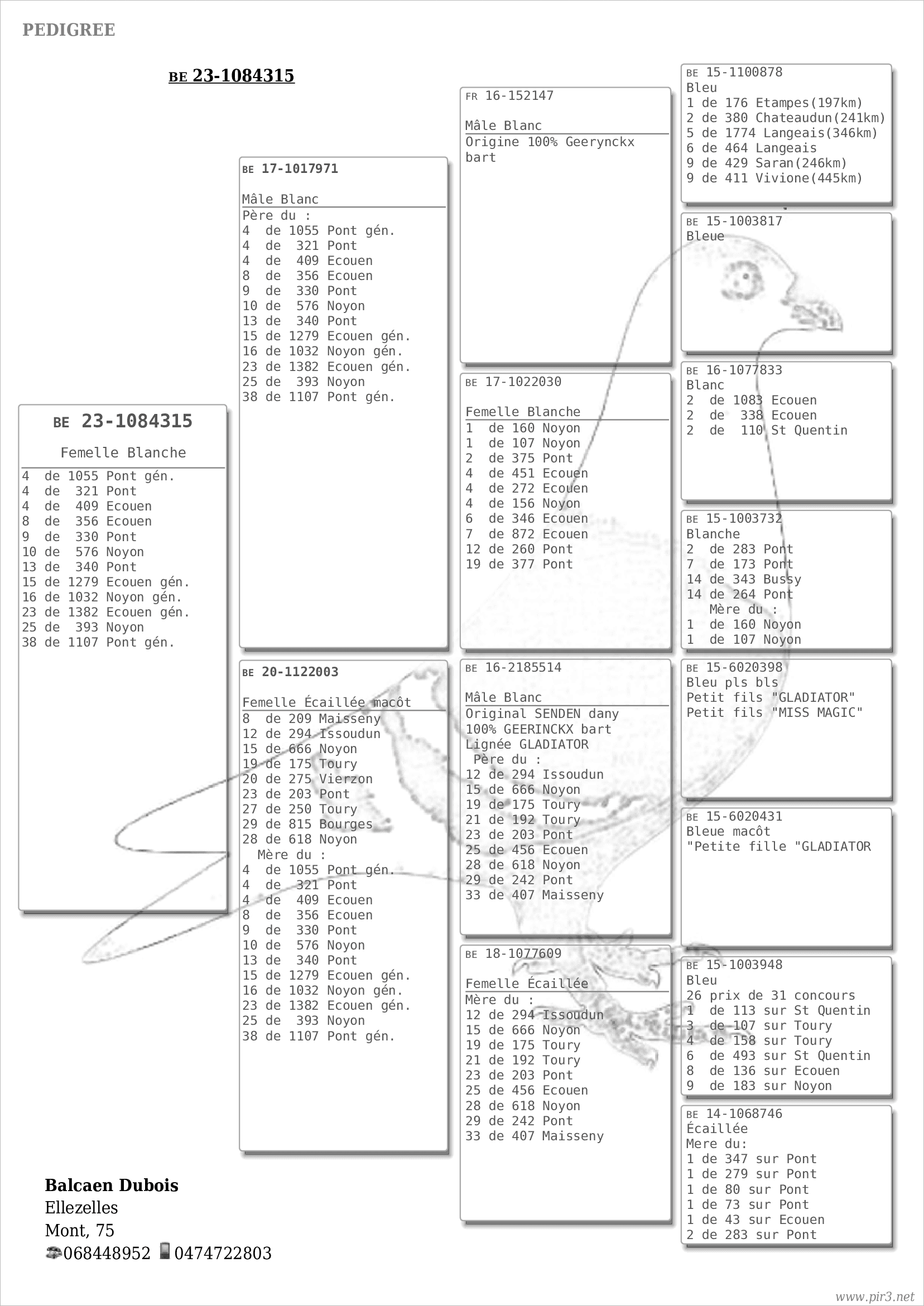 Cette femelle est une fille du « 971/17 » qui est à son tour un fils du « 030/17 » 2 x 1er Noyon et du « 003/20 » qui est issu d'un mâle de Danny Senden x sa propre espèce.