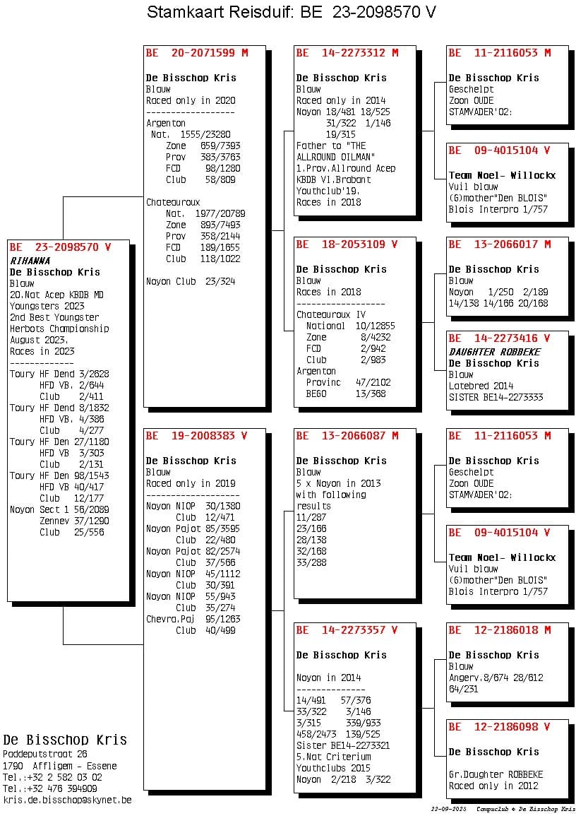 Cette jeune femelle « Rihanna » est devenue cette saison 20e As Pigeon National demi-fond pigeonneaux RFCB 2023. C'est une fille du "599/20" qui est un ½ frère du 1 As Pigeon Prov All Round Jeunes 2019 et du "109/10" qui a remporté le 10 National Châteauroux contre 12.855 pigeons. Sa mère est « 383/19 » qui a elle-même gagné 30 Noyon 1,380p - 45 Noyon 1,112p - 82 Noyon 2,574 - 85 Noyon 3,595p
