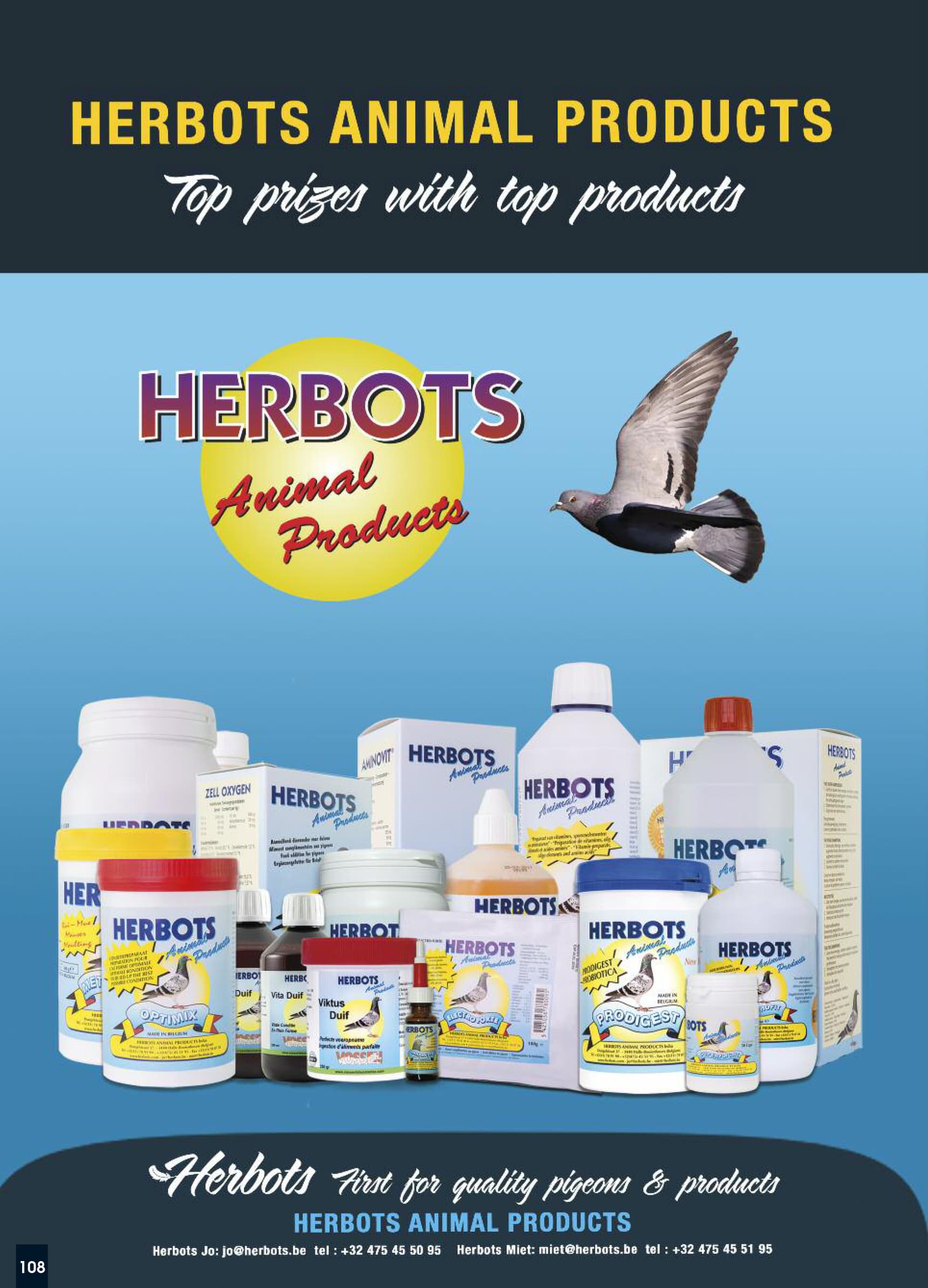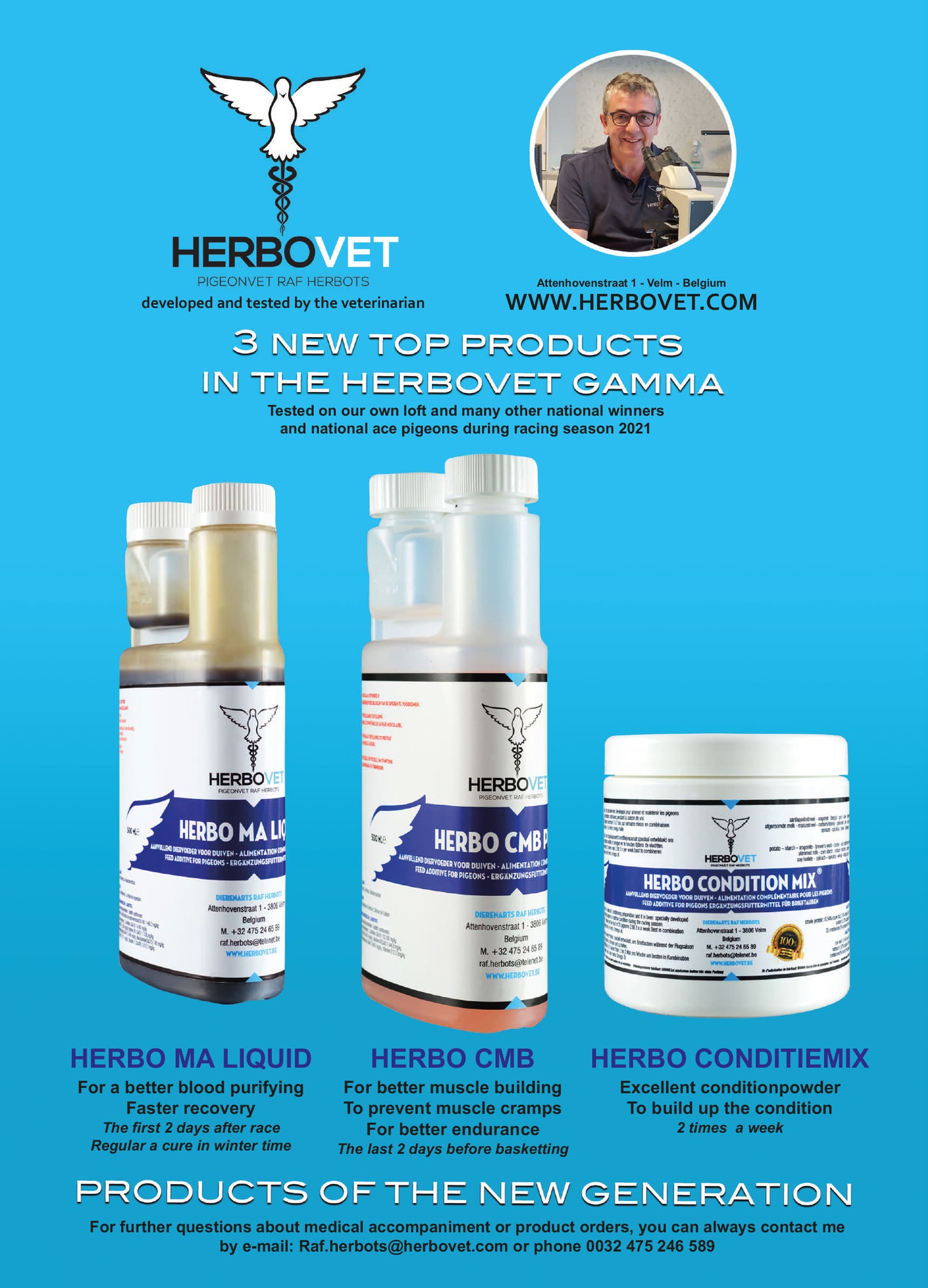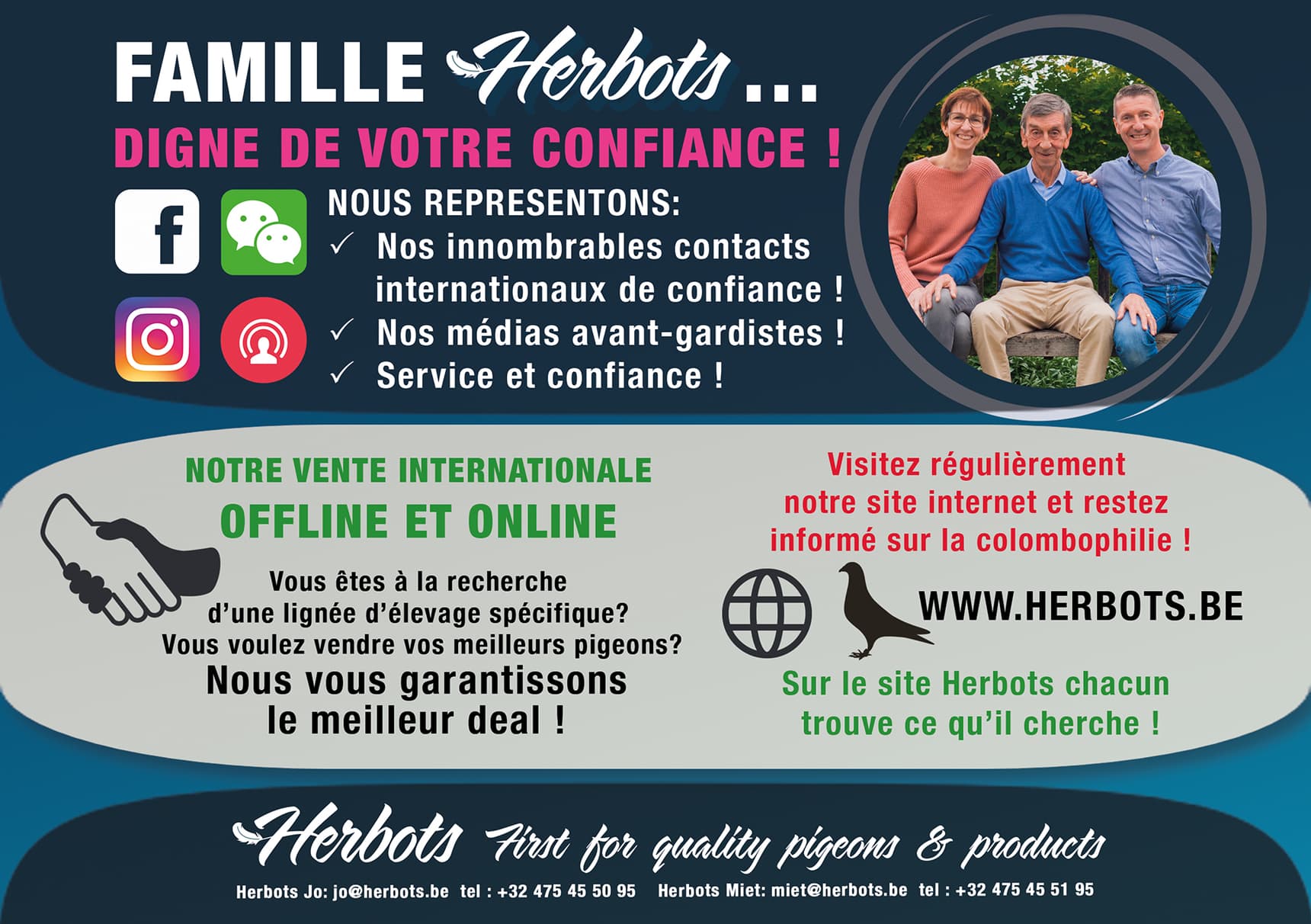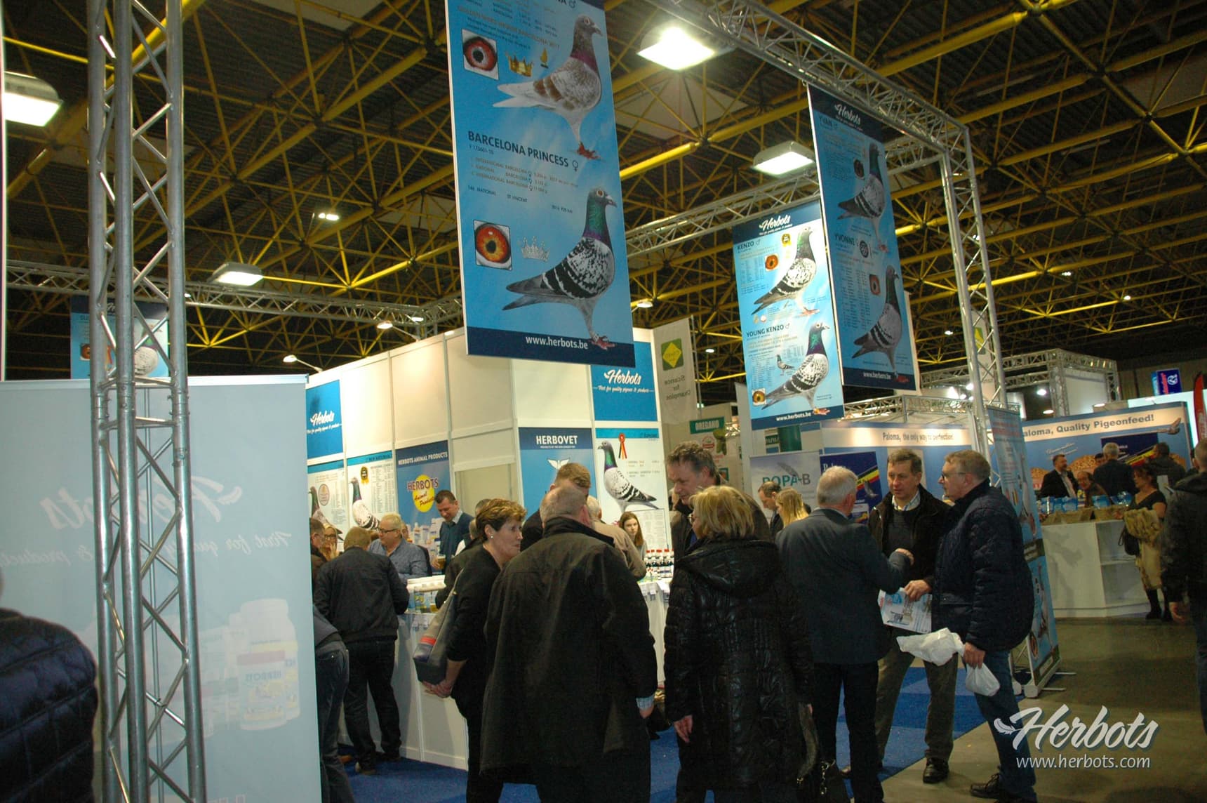 Comme toutes les éditions précédentes, la famille Herbots sera également présente avec un stand spacieux et l’équipe Herbots se fera un plaisir de vous offrir un verre. Vous pourrez y également emporter gratuitement notre catalogue de renommée mondiale « Racing to 2022 ». Si vous souhaitez des informations sur l’offre et/ou la vente des pigeons ou si vous souhaitez faire votre choix parmi la gamme complète de Herbots Animal Products et Herbovet…alors n’hésitez pas à visiter le stand Herbots (numéro 650). Miet, Jo, Raf et toute l’équipe Herbots sont prêts pour vous.