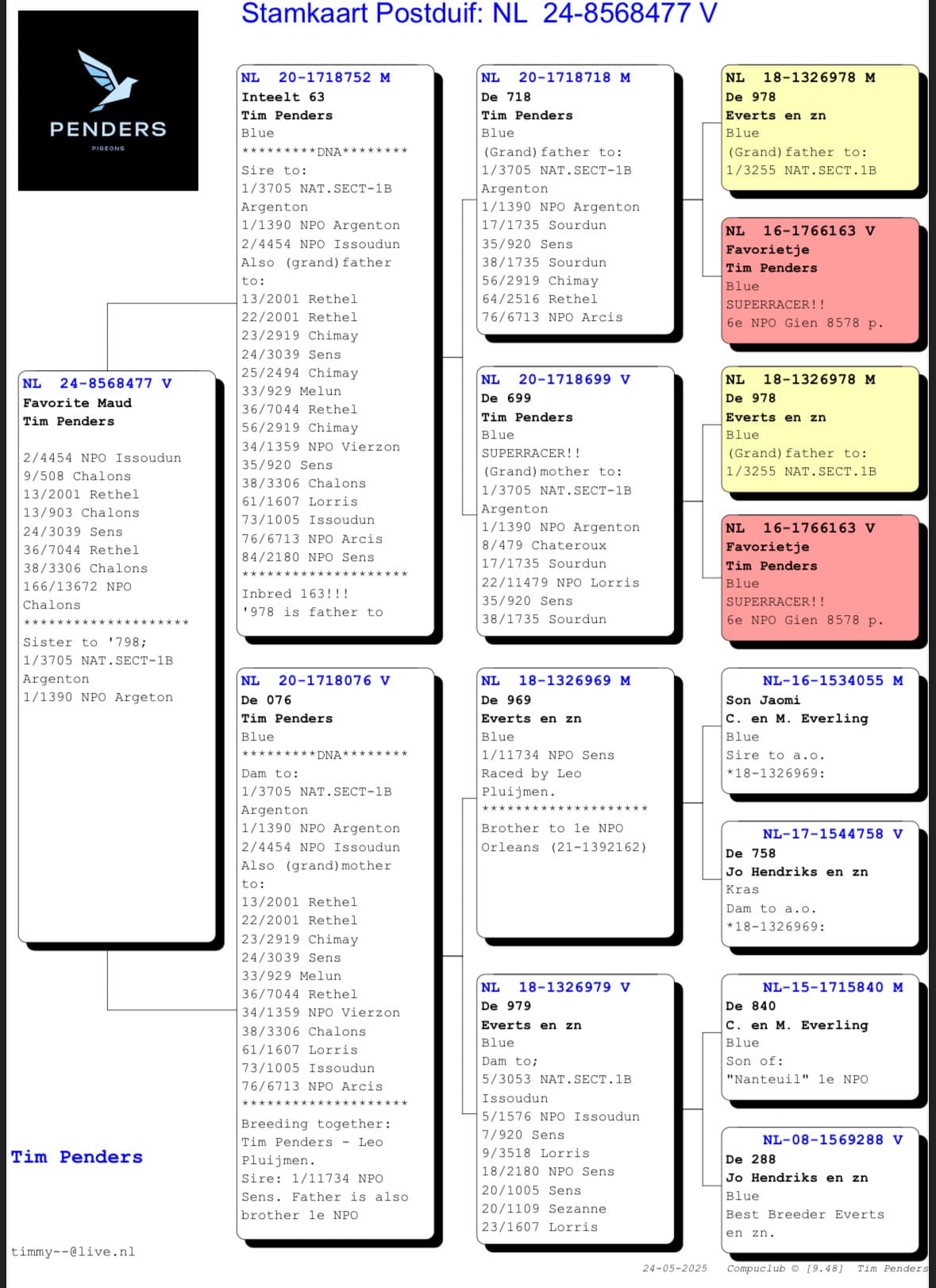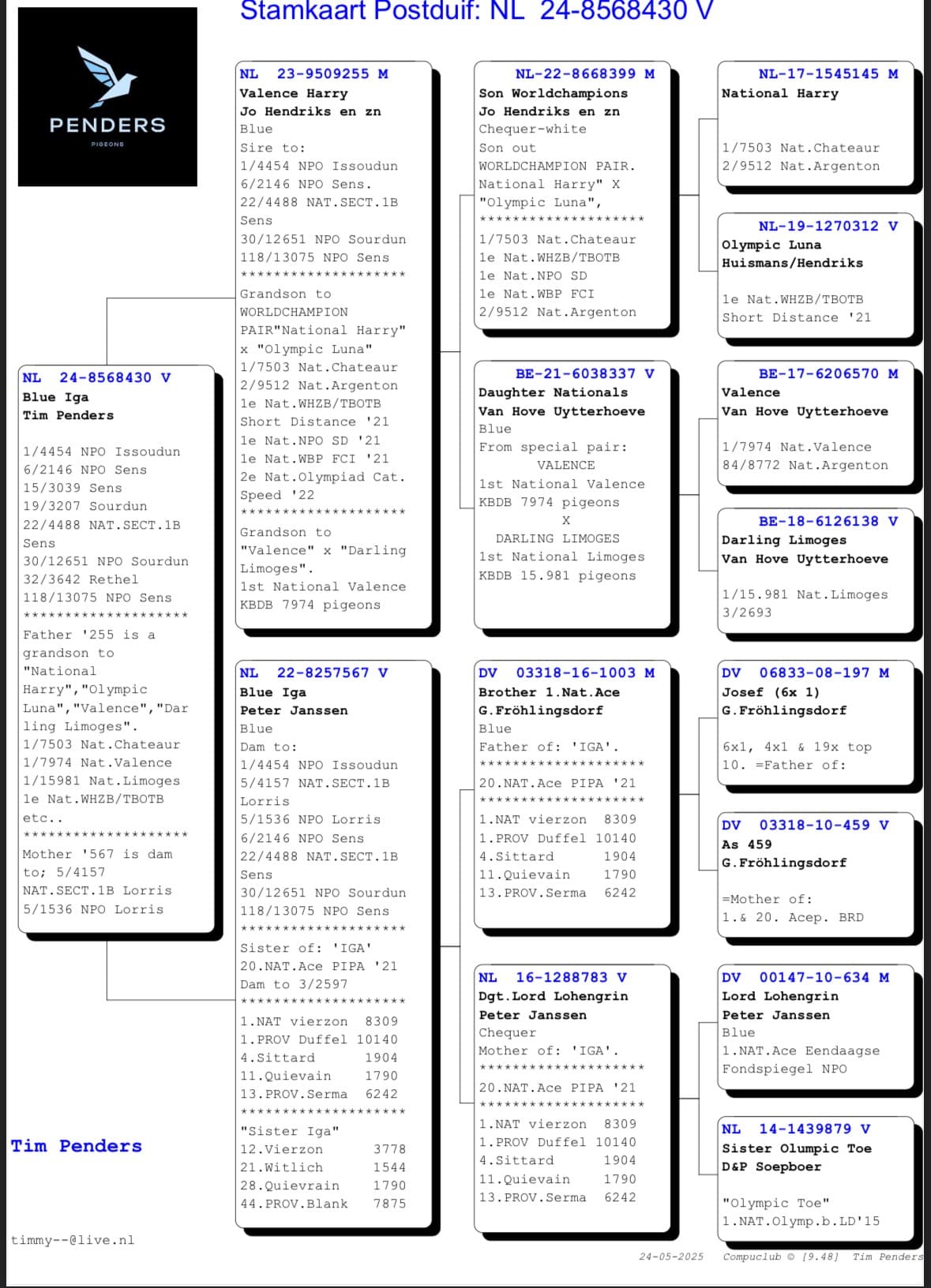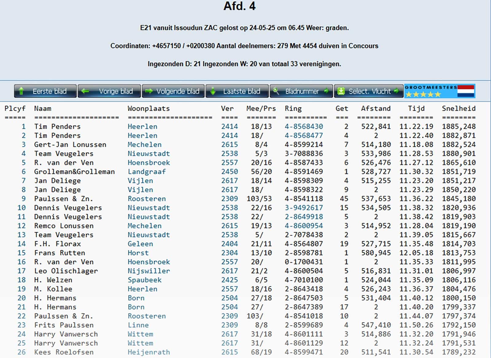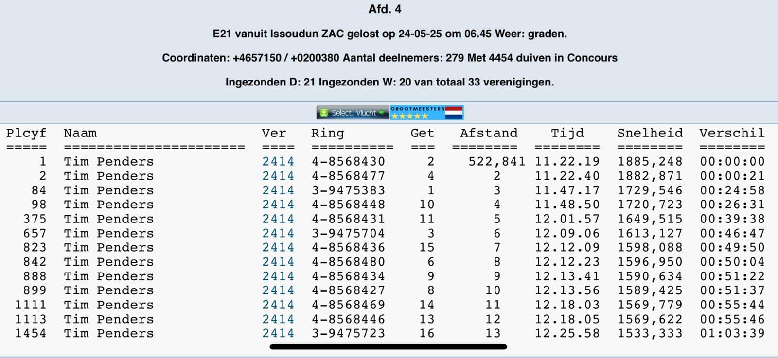 Le week-end dernier, Tim Penders a obtenu un excellent résultat à Issoudun 522km - 4454 pigeons division 4
