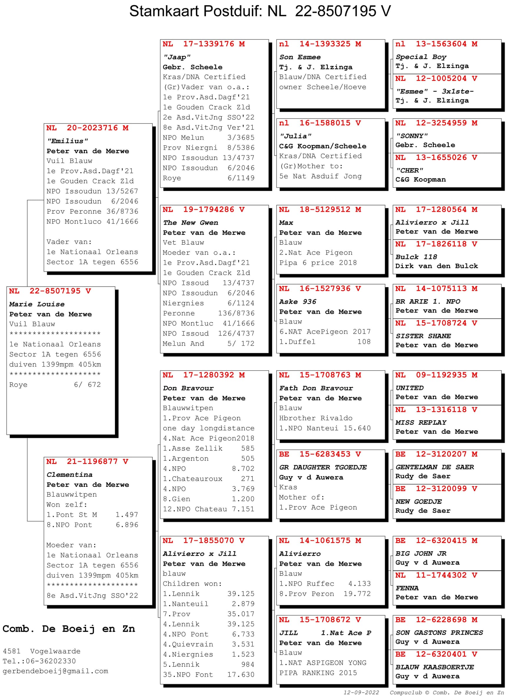 For the victory, hen "Marie Louise" was in charge. "Marie Louise" (NL22-8507195) covered the 405km at an average speed of 1,399.20 m/m. "Marie Louise" was basketed on a pair of youngsters about 10 days old. It had been four seasons since the youngsters participated in the flights in nesting position and lo and behold, now they get the 1st "big" victory for their owners.