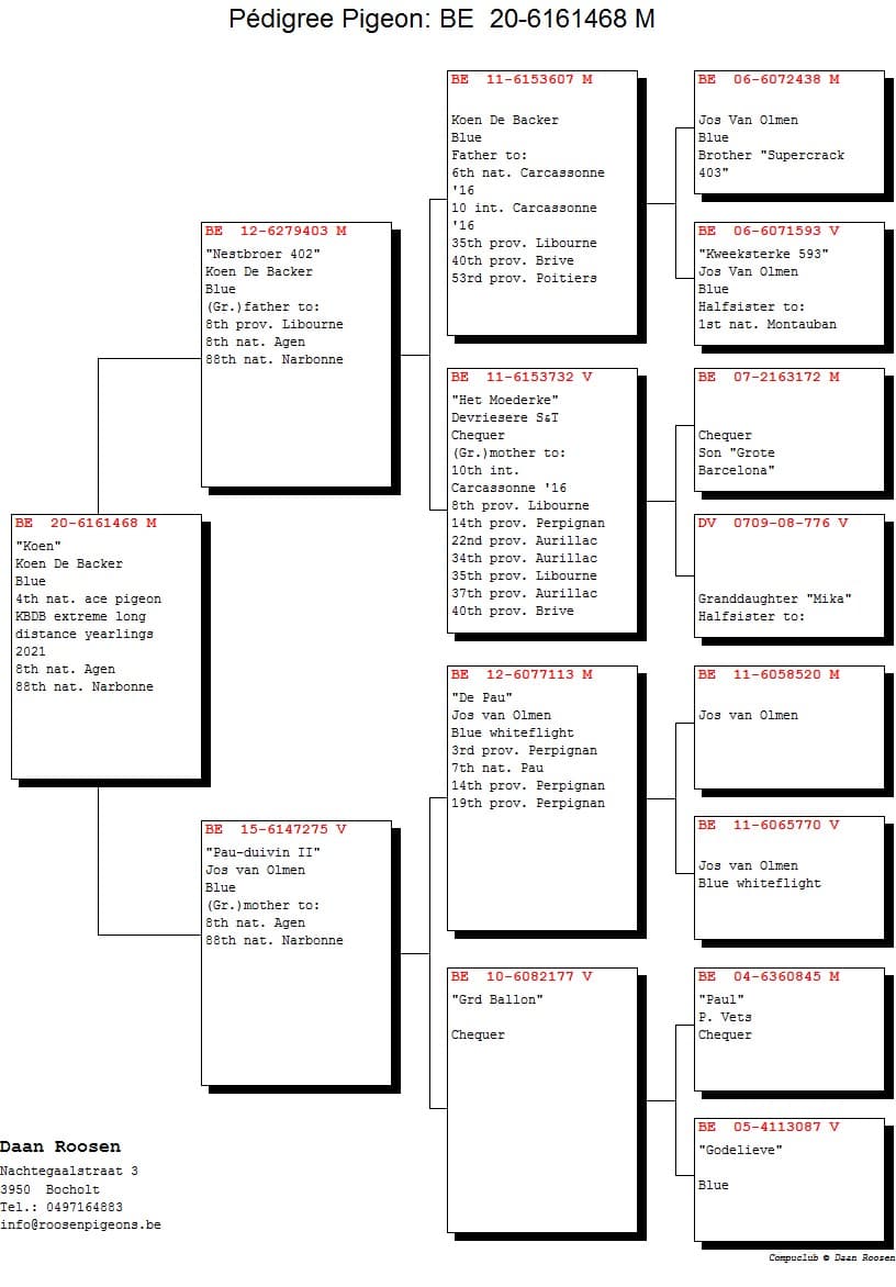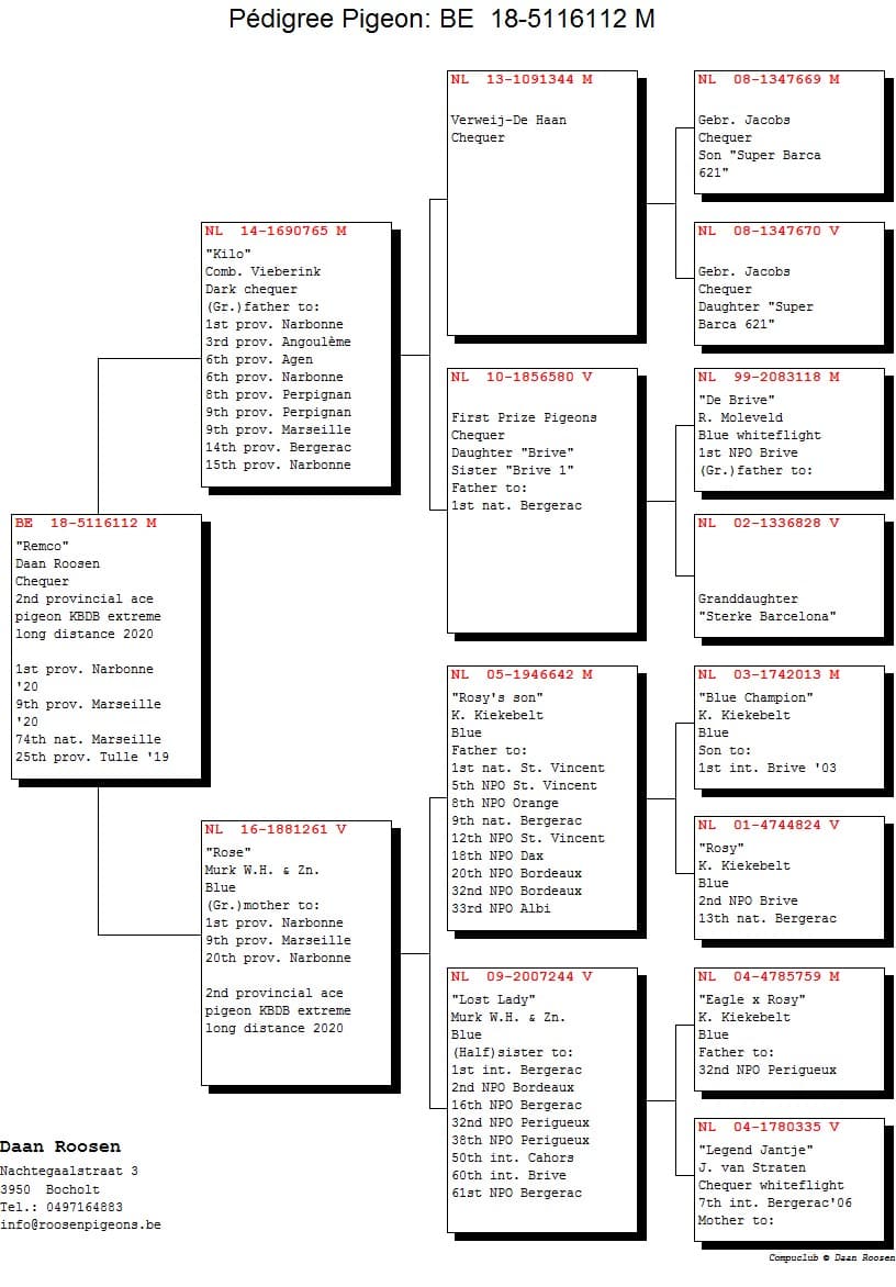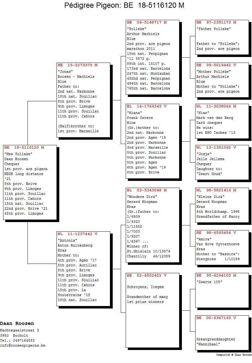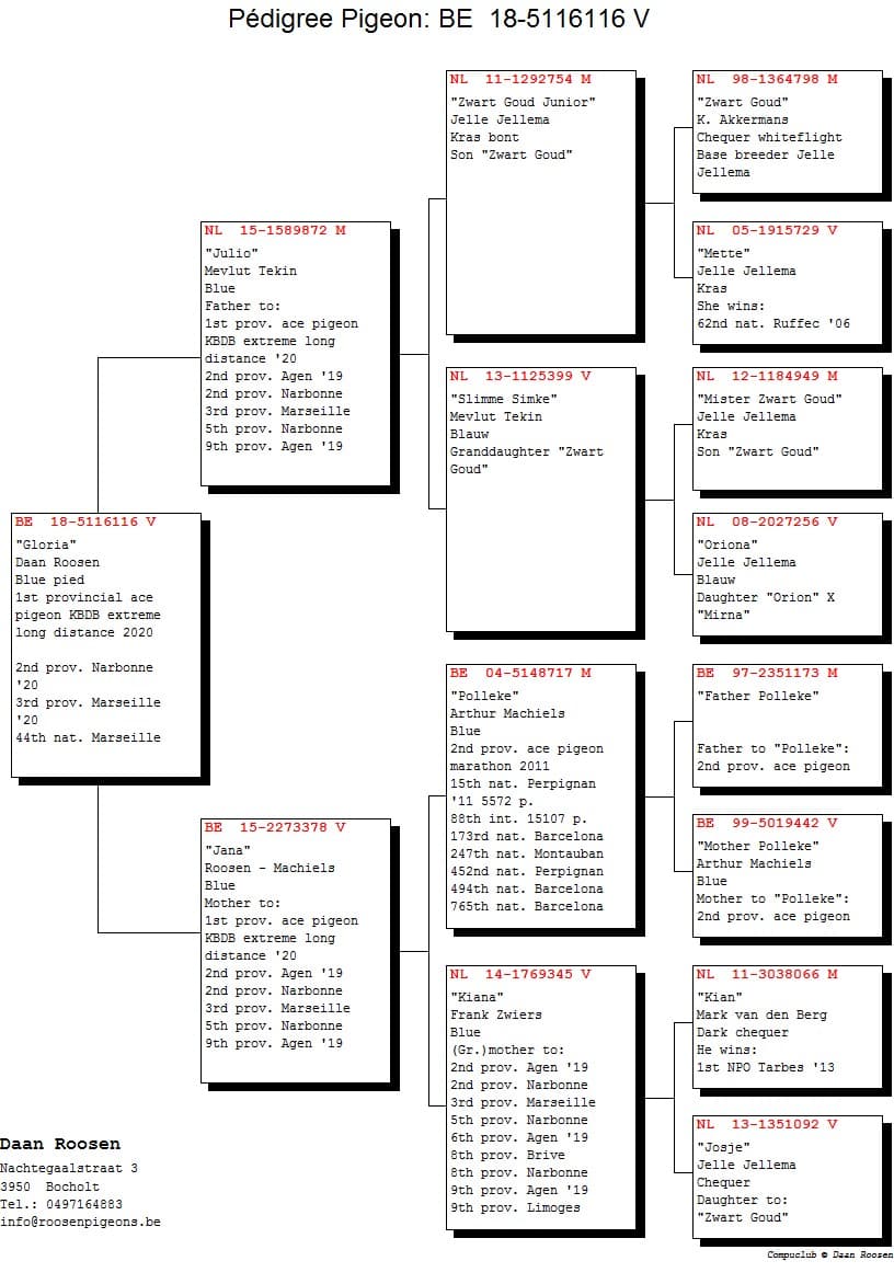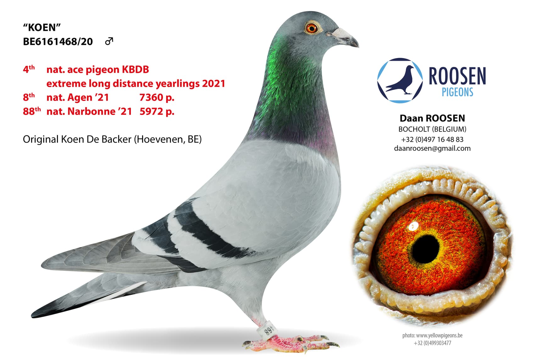 Mother BE 17-6026745 “Miss Hoevenen” Koen De BackerDaughter of “Ace” Piet De Vogel is son “Cahors” 1st Nat Ace pigeon ZLU 2012-2016 x “Blue 209” Eddy Didden is daughter “Supercrack 403” 3 x 1st provincial extreme long distance