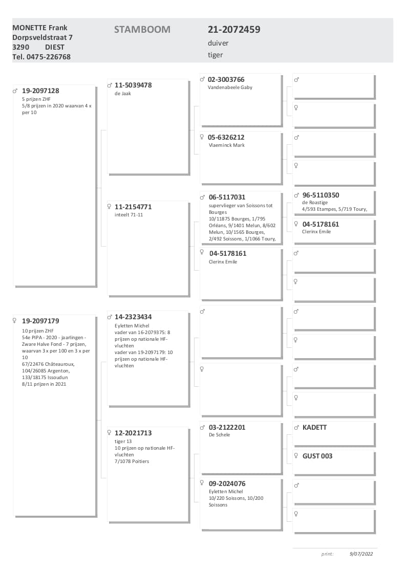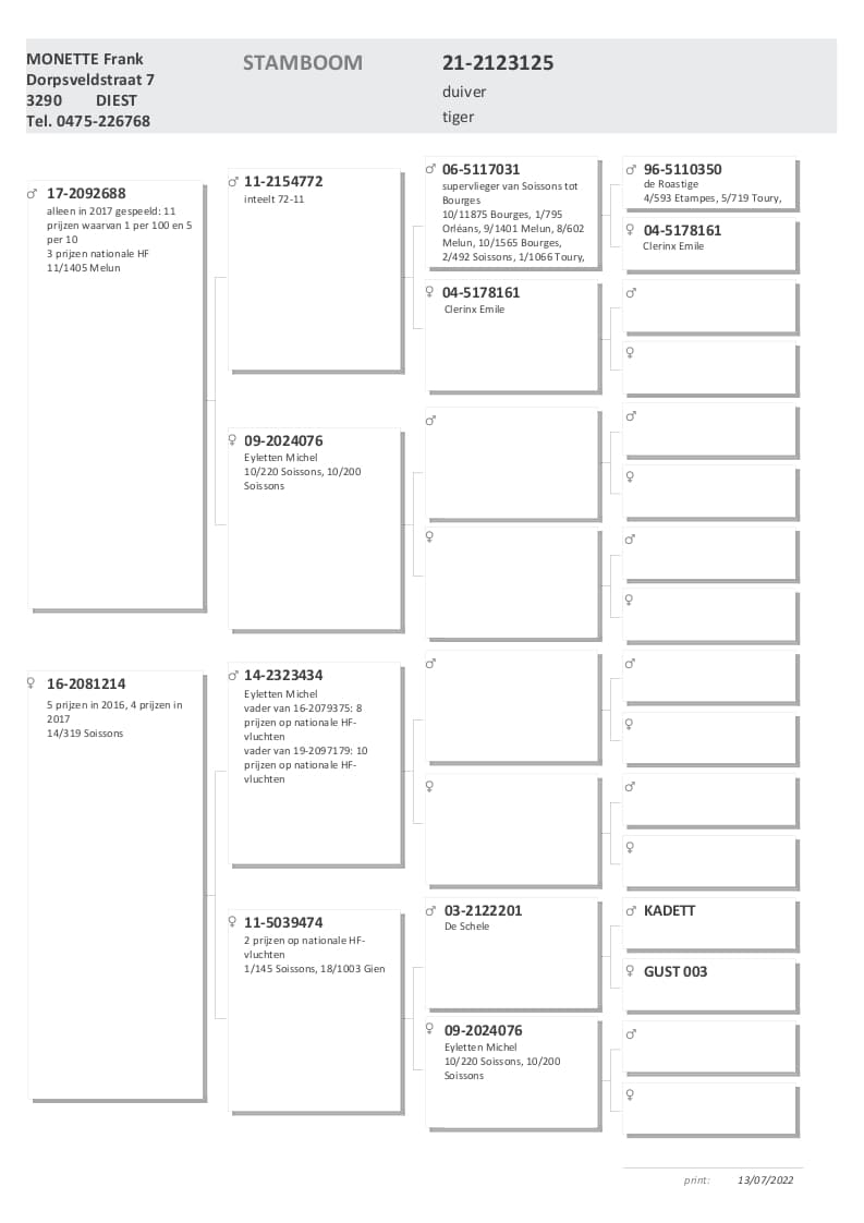 In the tough national race from Gueret, Frank Monette from Webbekom clocked 3 yearlings in the top 30 National against 12,208 pigeons. His first pigeon “459/21” won the 1st Provincial Gueret against 1,638 pigeons and won silver at National level. The other topper of this season “125/21” is also related to the first arrival and comes from a strong family.