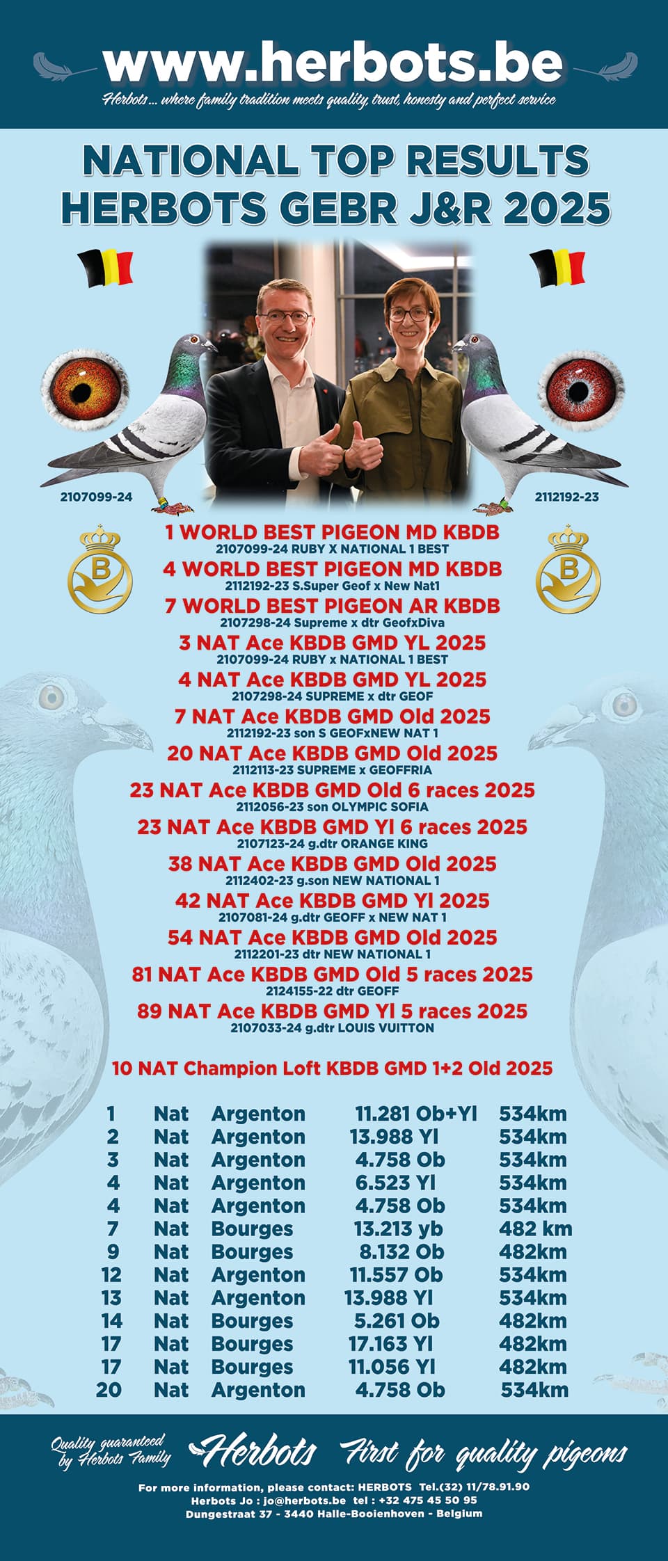 Nous suivrons avec grand intérêt les performances de la saison 2026. Il ne reste que 20 pigeons de l'équipe de 2025 (vieux et yearlings). Les autres ont été placés au colombier de reproduction ou sélectionnés parmi l'équipe. Espérons que la brillante équipe de jeunes pigeons de 2025 poursuivra sur sa lancée en 2026, chez les yearlings. Nous croisons les doigts pour eux ; toute l'équipe d'Herbots le mérite.