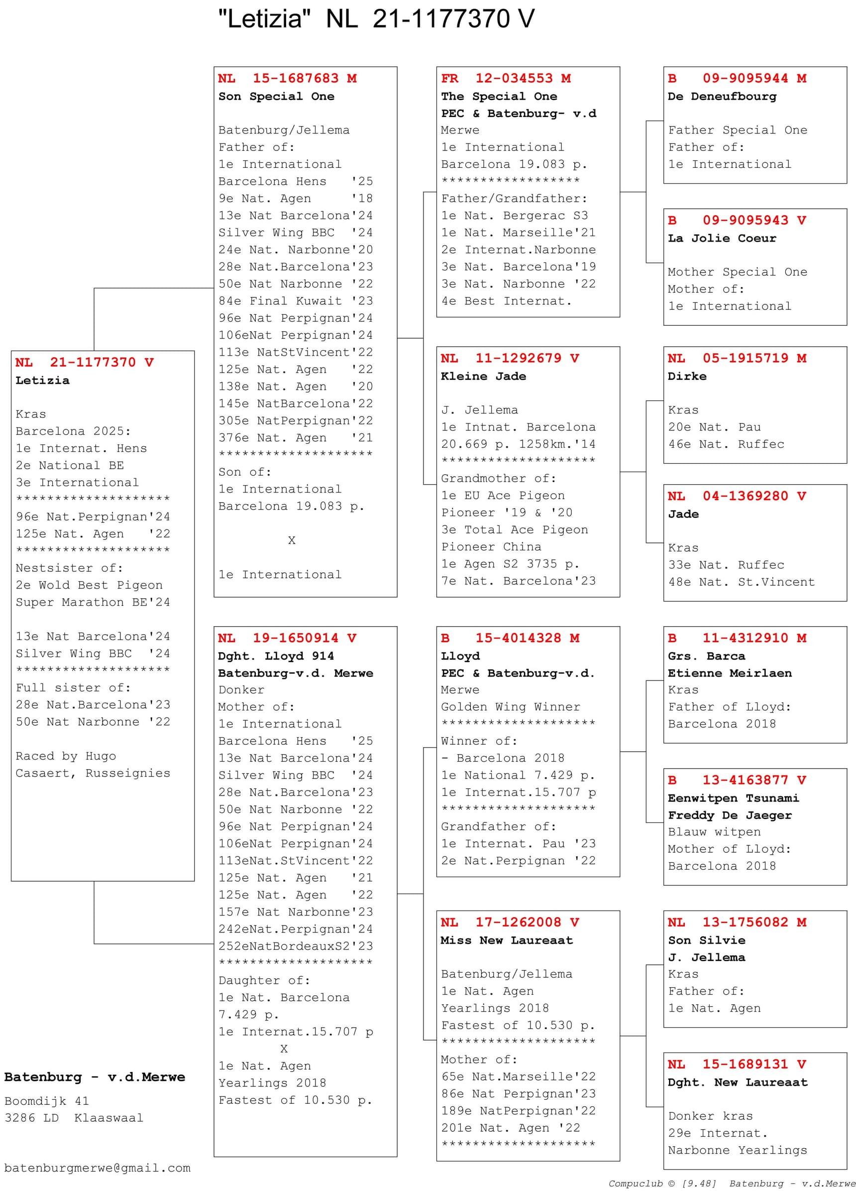 Hugo Casaert de Russeignies, remporte le 1er international (femelles) Barcelone contre 5.735 pigeons avec la femelle écaillée NL21-1177370 appelée ‘Letizia’ qui a parcouru, dans la chaleur, les 1025,85 kms de ce concours mythique, à la vitesse de 962,41 m/m. Elle s’est pointée à 7h39, tout en se classant également 2ème National (5.819P) et 3ème International contre 15.598 pigeons. Un véritable exploit pour cette femelle élevée par Hugo Batenburg-Van de Merwe (NL) qui a déjà gagné le 96ème Nat. Perpignan en 2024 ainsi que le 125ème Nat. Agen en 2022. Elle est aussi la sœur de nid du 13ème National Barcelone 2024, gagnante de l’aile d’argent 2024. Et comme vous pouvez voir dans le pédigrée, du sang royal coule dans les veines de cette championne. Lors de ce ‘dur’ Barcelone, Hugo Casaert est aussi le 1er amateur belge à classer 2 pigeons puisqu’il est figure à la 2ème et 14ème place nationale.