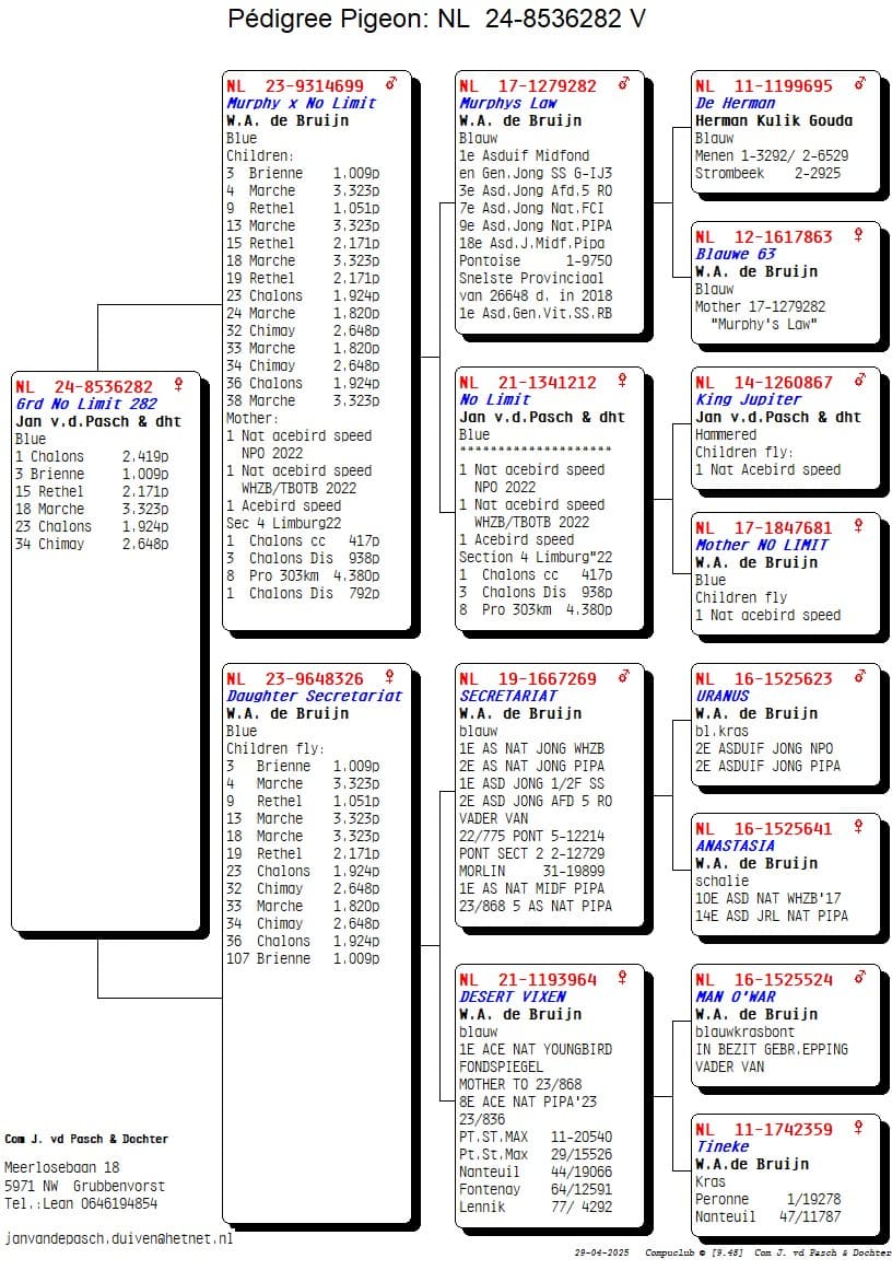Fille du super-éleveur « NL 19-269 » Secretariaat et a remporté elle-même 1 As Pigeon Nat jeune WHZB x « NL 21-964 » Desert Vixen a remporté 1 As Pigeon Nat fondspiegel jeune