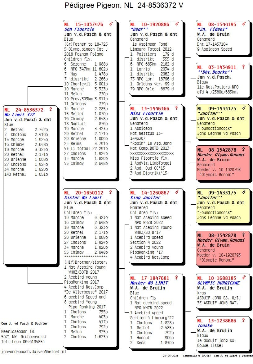 Fils de « NL 10-886 » Bear était 1er As Pigeon Limburg Fond x « NL 13-366 » Mlle Floortje est une fille du couple de base « Jupiter » x « Mère Olympic Ranomi »