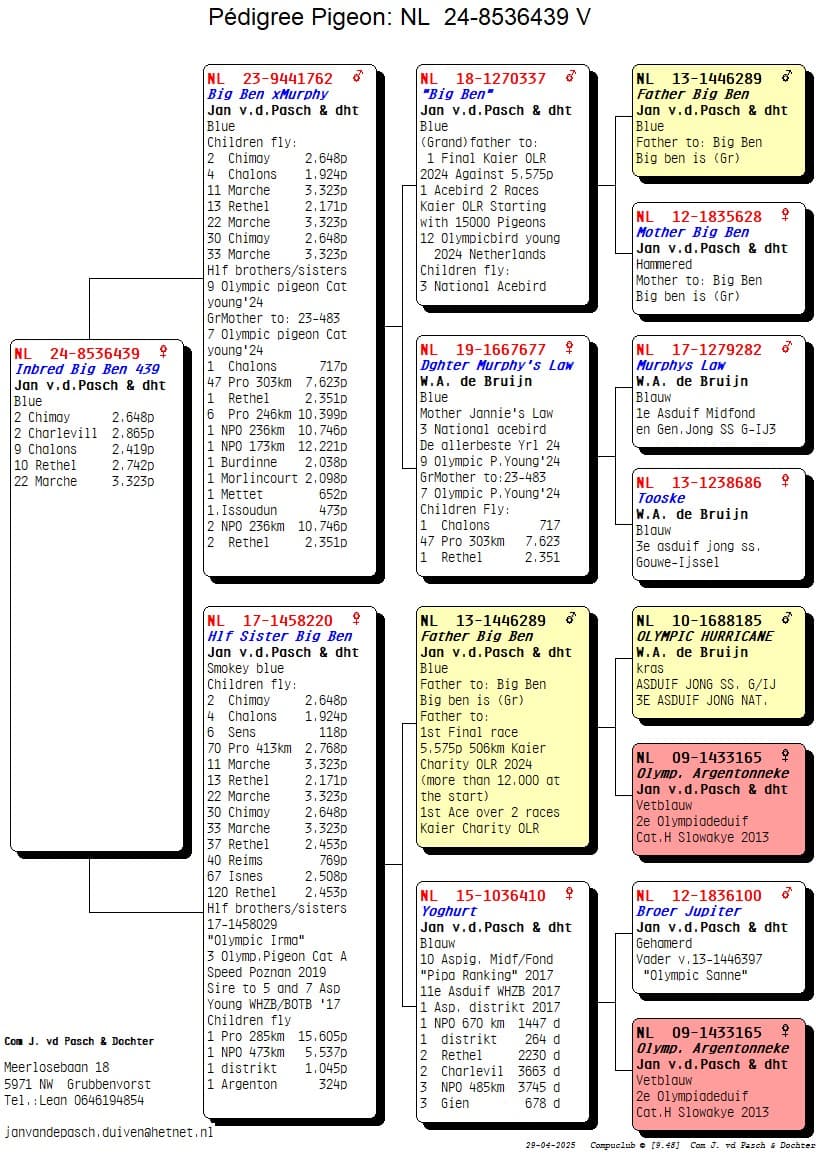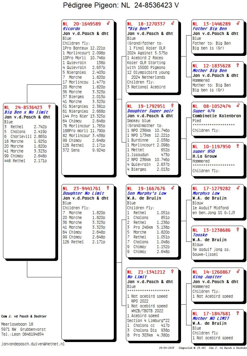 ½ frère de « Jannie’s Law » 3e As Pigeon National yearlings « De Allerbeste » 2024 9e Pigeon Olympique Cat.F Maastricht 2023