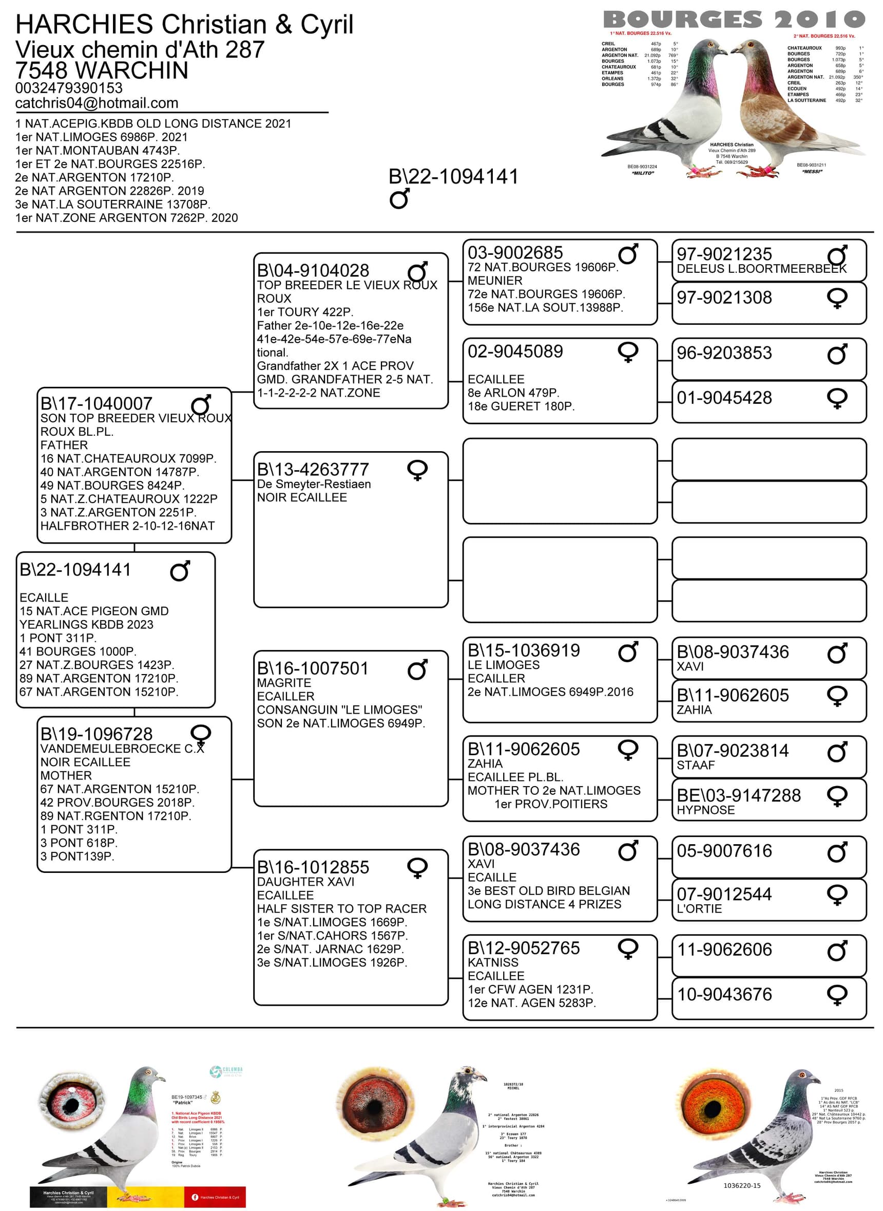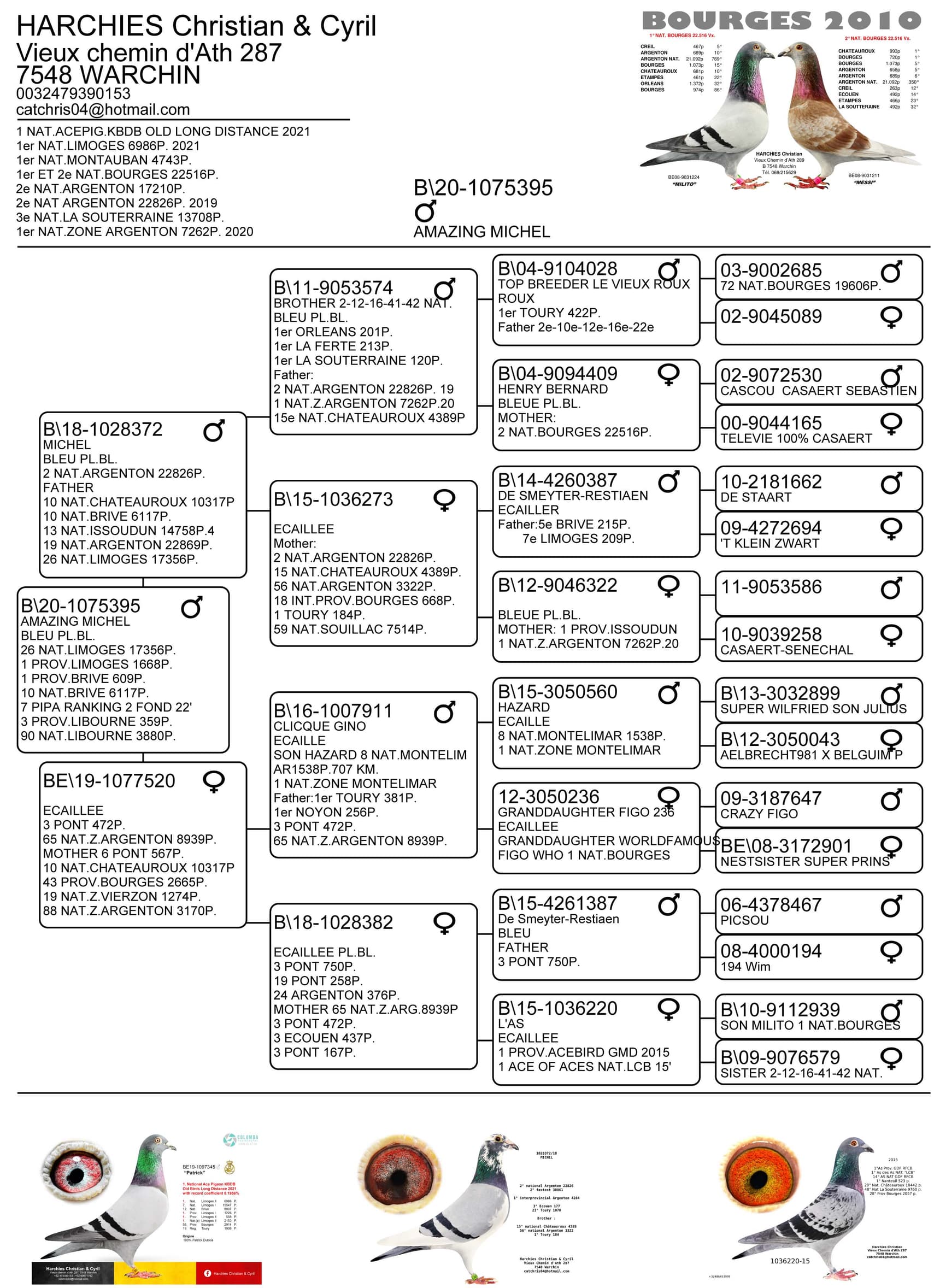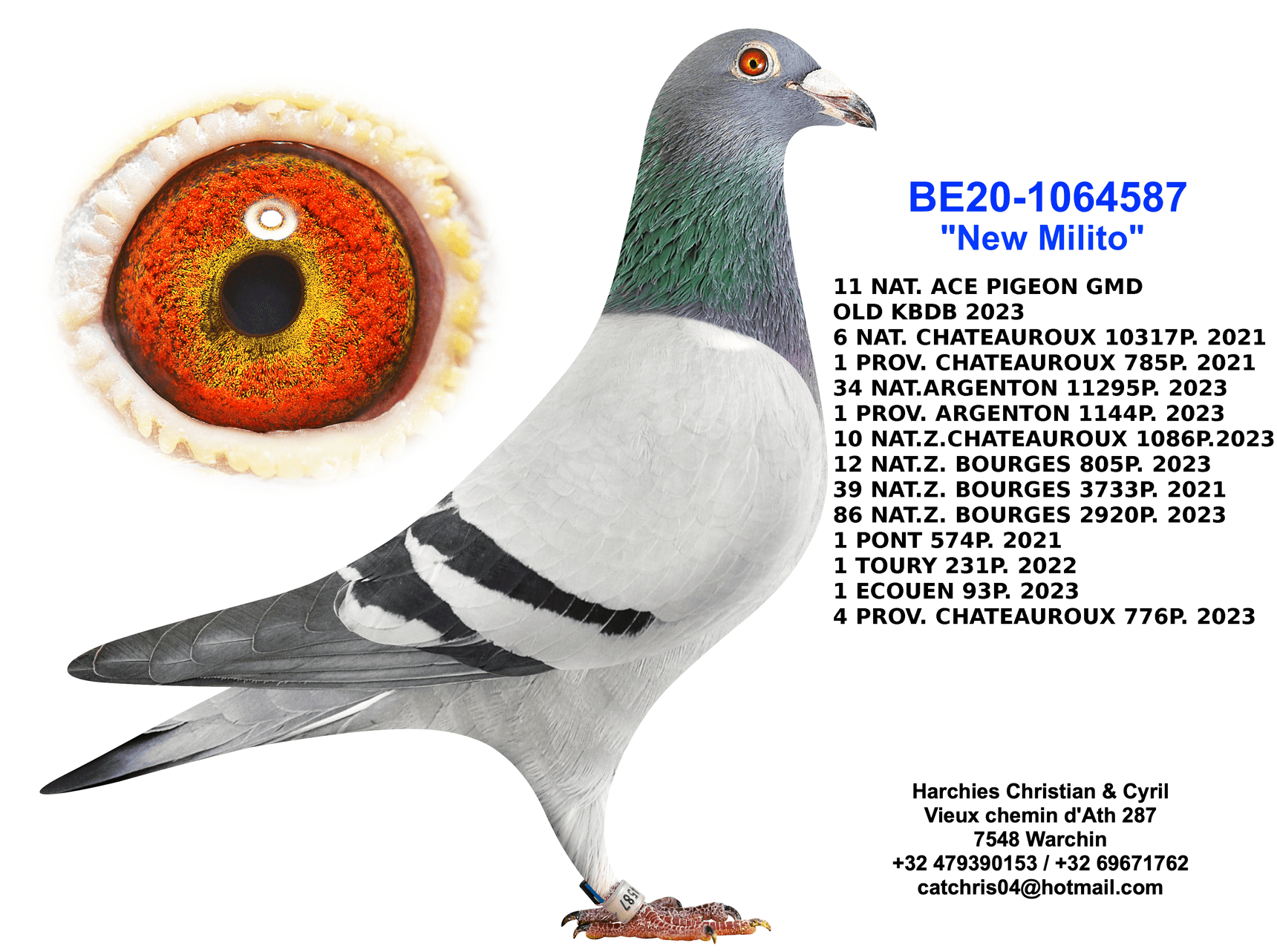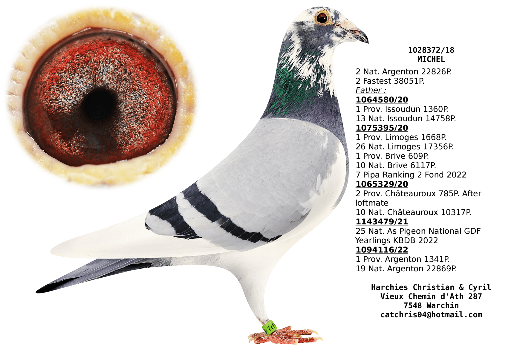 Avant la formation en 2021 du tandem composé de Christian et Cyril, le nom ‘HARCHIES’ était déjà bien connu en Belgique, car Christian, colombophilie depuis 1989, avait déjà réalisé le 1er national Montauban en 1996 ainsi que le 1er et 2ème National Vieux Bourges en 2010. De son côté, Cyril, passionné par le sport colombophile depuis la naissance, a pris sa 1ère licence en 2013, à l’âge de 10 ans et est passé tout près du 1er National en réalisant en 2019, le 2ème National Argenton dans 22.826 Yearlings, avec le pigeon BE18-1028372 (petit fils du ‘Vieux Roux’ de Christian), baptisé ‘MICHEL’, en souvenir du prénom de son grand-père aussi colombophile et décédé malheureusement en cette même année. ‘MICHEL’ BE18-1028372 est devenu, par la suite, un des meilleurs reproducteurs de la colonie. Cyril est donc la 3ème génération de colombophilie dans la famille ‘Harchies’.