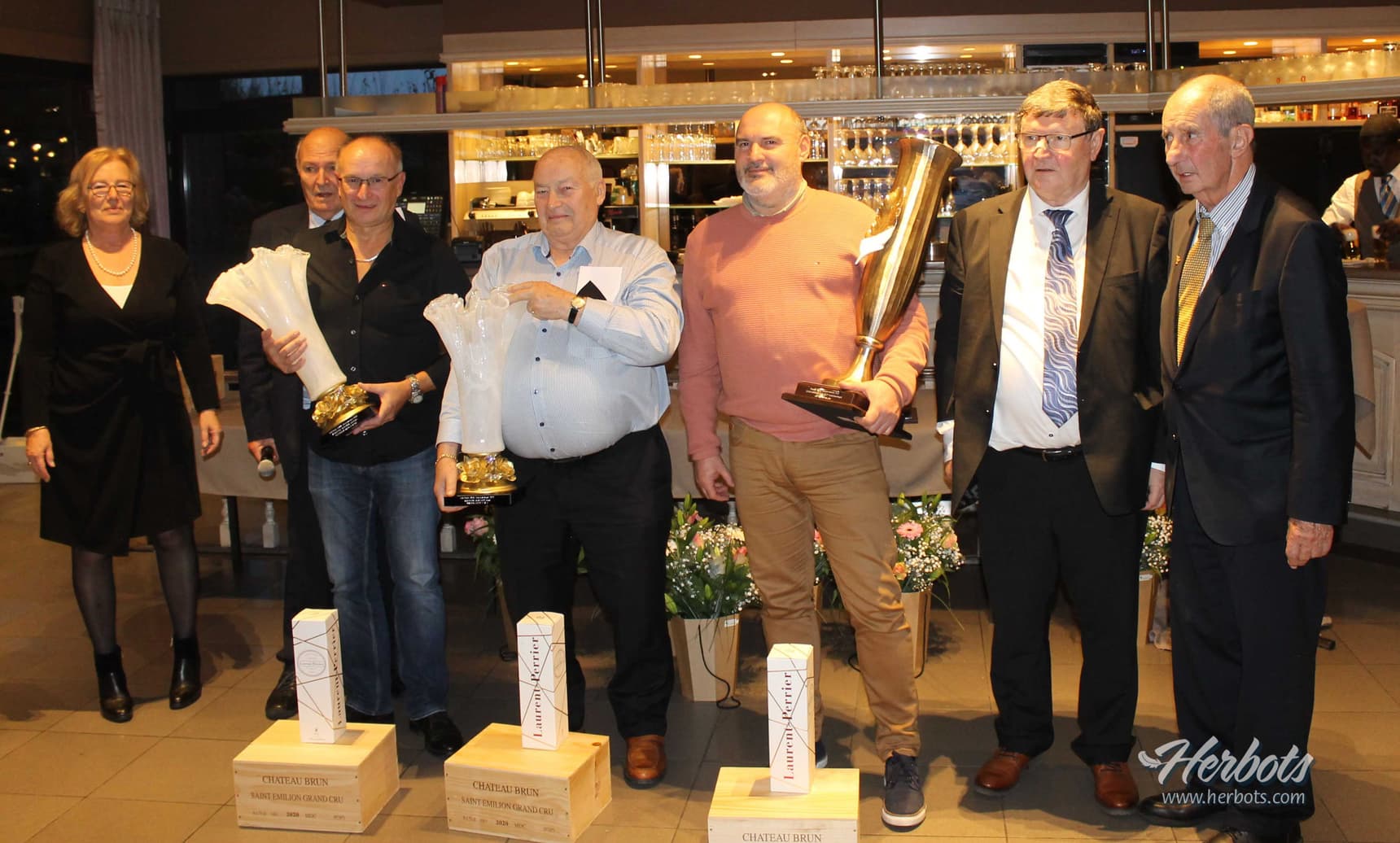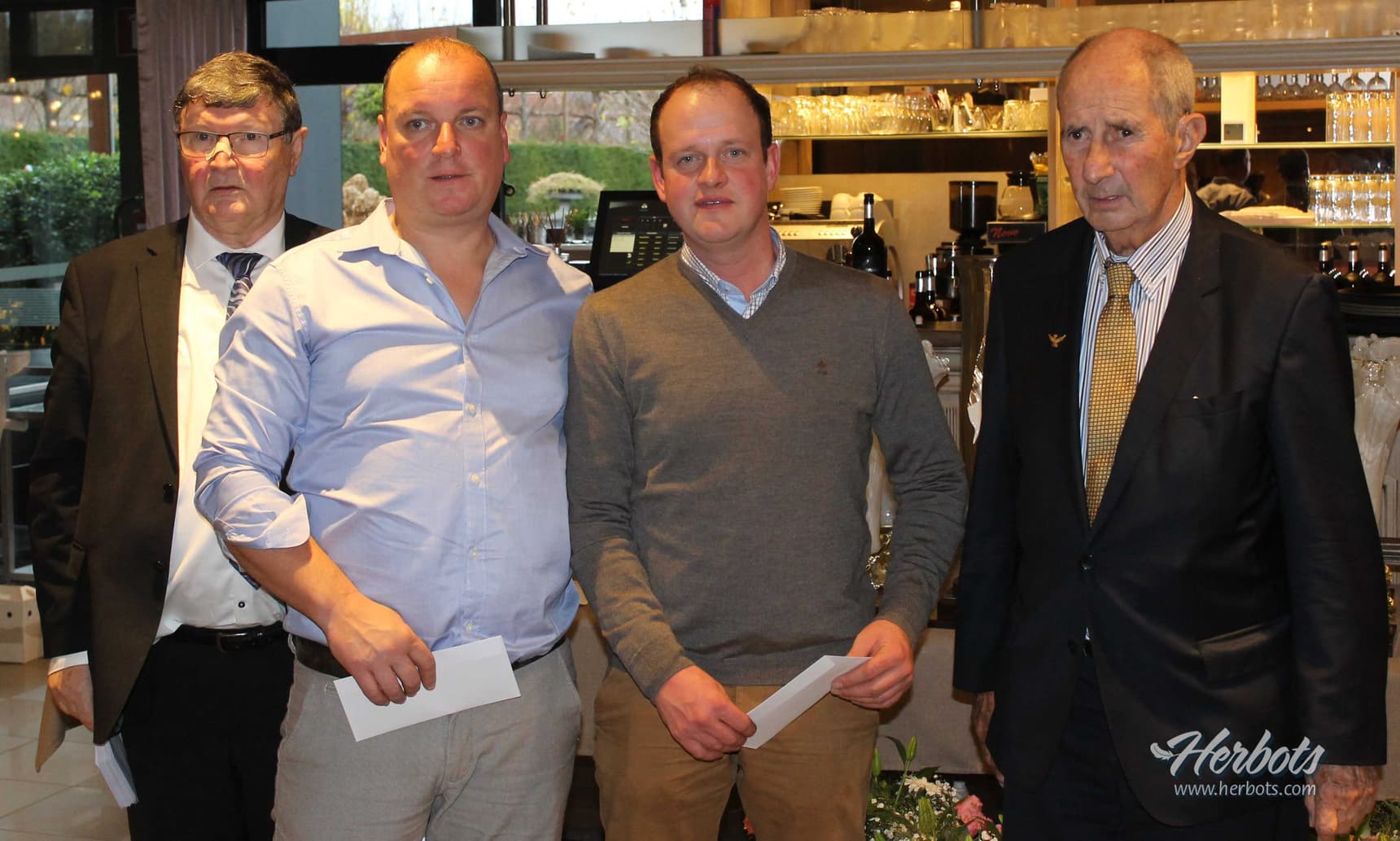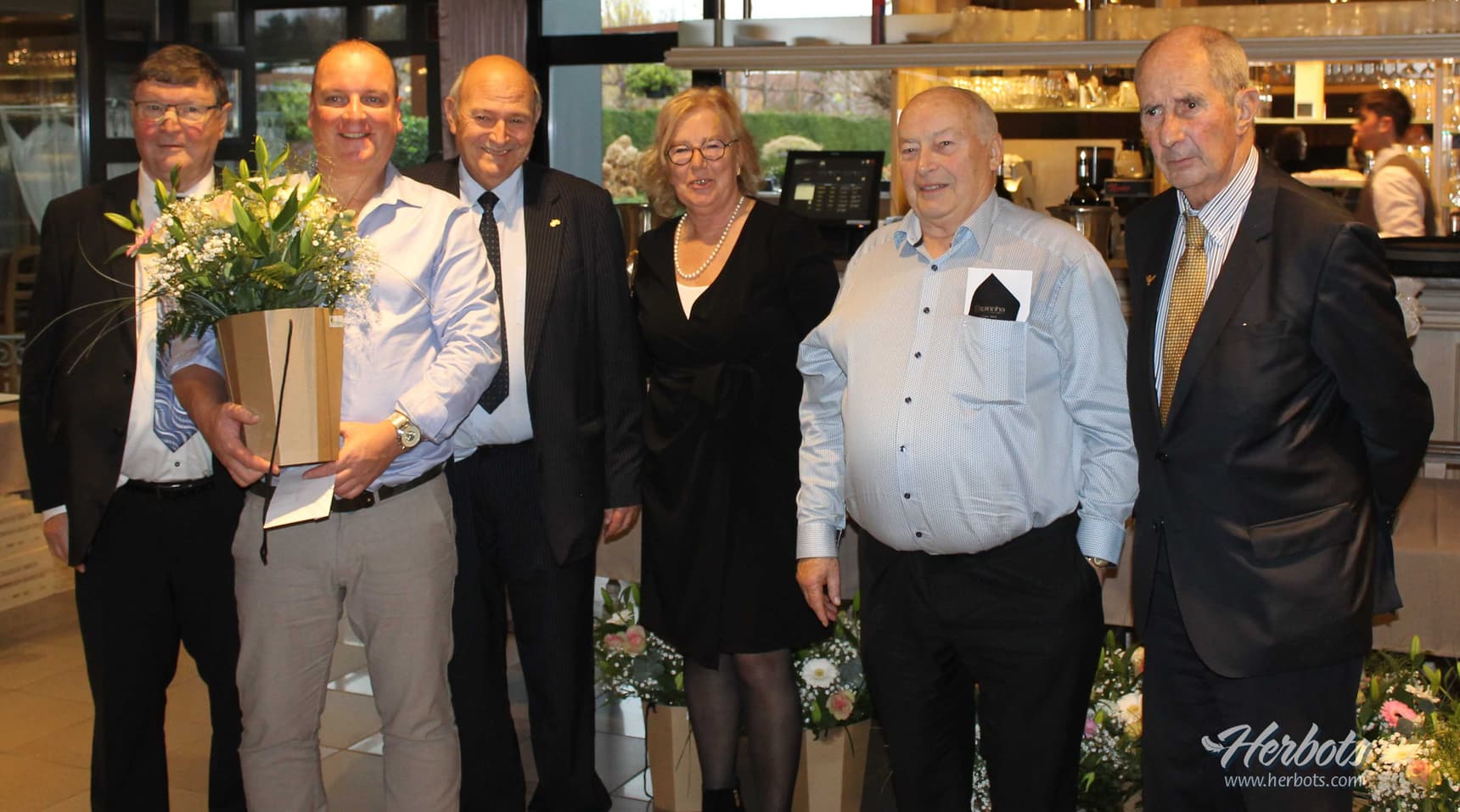 Voorzitter Daniël Aerens geflankeerd door zijn bestuursploeg (Mark De Backer, Geert De Clercq, Herman Roels) en zijn partner Hélène hadden voor een prachtig prijzenpakket gezorgd voor de winnaars en laureaten.