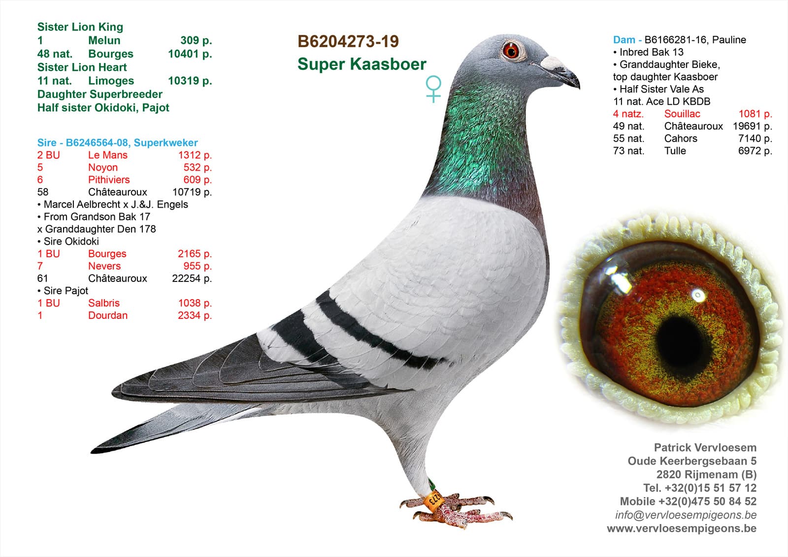 Everything goes according to plan for the colony of Patrick Vervloesem, after having won provincial Argenton, the following week it was again a hit from Valence with a top hen that flies far ahead in the province of Antwerp and comes in 5th nationally against 6,056 old birds. A week later and another win, this time from Issoudun where a yearling hen shines against 2,397 yearlings. It's going well, so just give it to them and they try to keep it in order. But time and again the line of “Super breeder 564” is present. The winner of Valence is a direct daughter of him, one of the last to be present in the racing loft and the winner of Issoudun is a great-grandchild of his. How 1 breeder can dominate the loft…. He certainly has not stolen his name.