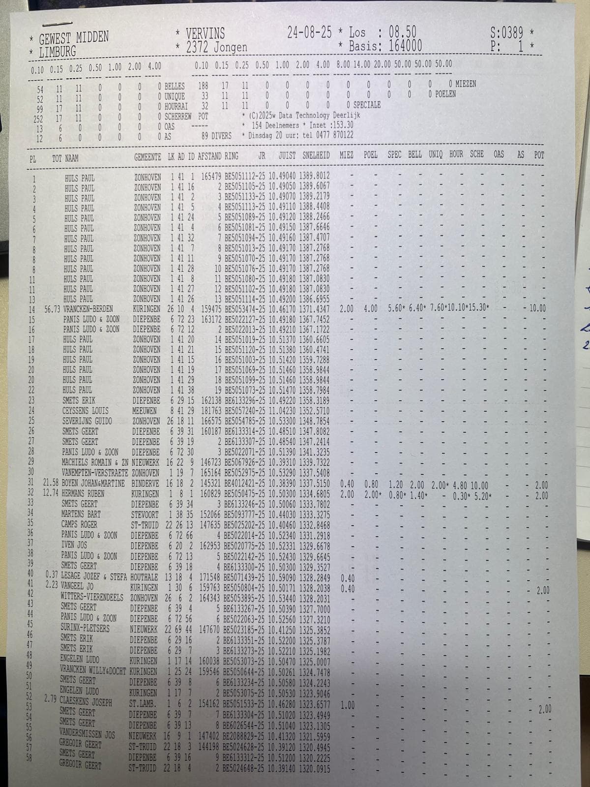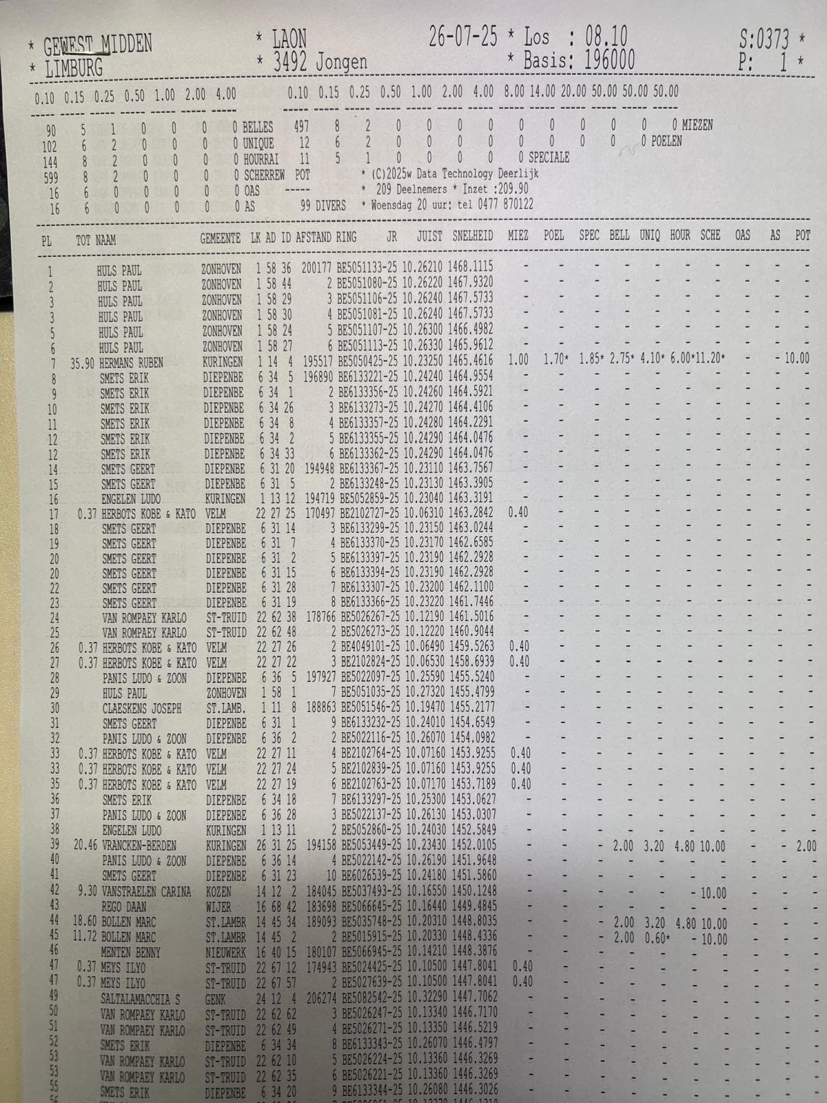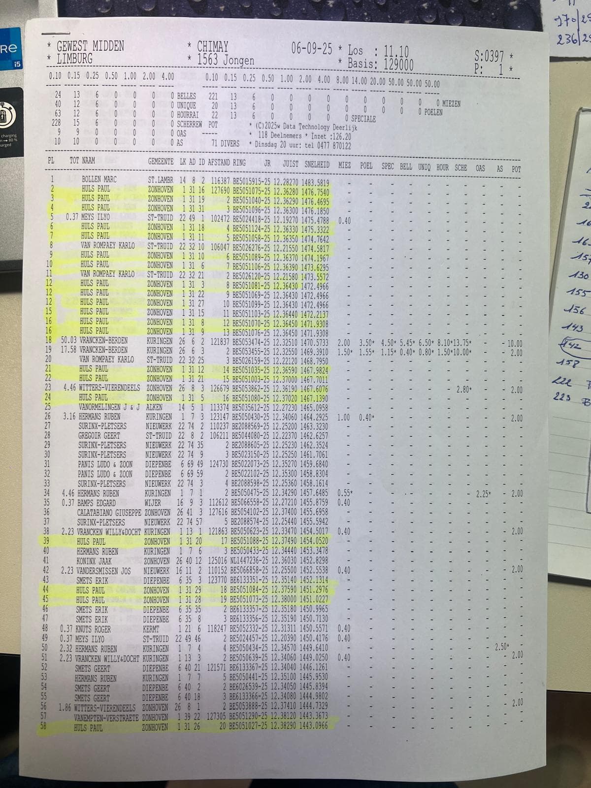 Mais les pigeons Huls ne sont pas seulement performants pour les autres colombophiles ; Paul sait aussi parfaitement comment dominer la concurrence. « La preuve est là », dites-vous… Eh bien, que pensez-vous des résultats de la célèbre course « Kom Op Tegen Kanker » ? À l'échelle provinciale, 7 543 jeunes pigeons ont été lâchés, et le nom de Huls Paul a remporté pas moins de 11 prix ! Un exploit rarissime, voire inédit, en Belgique.