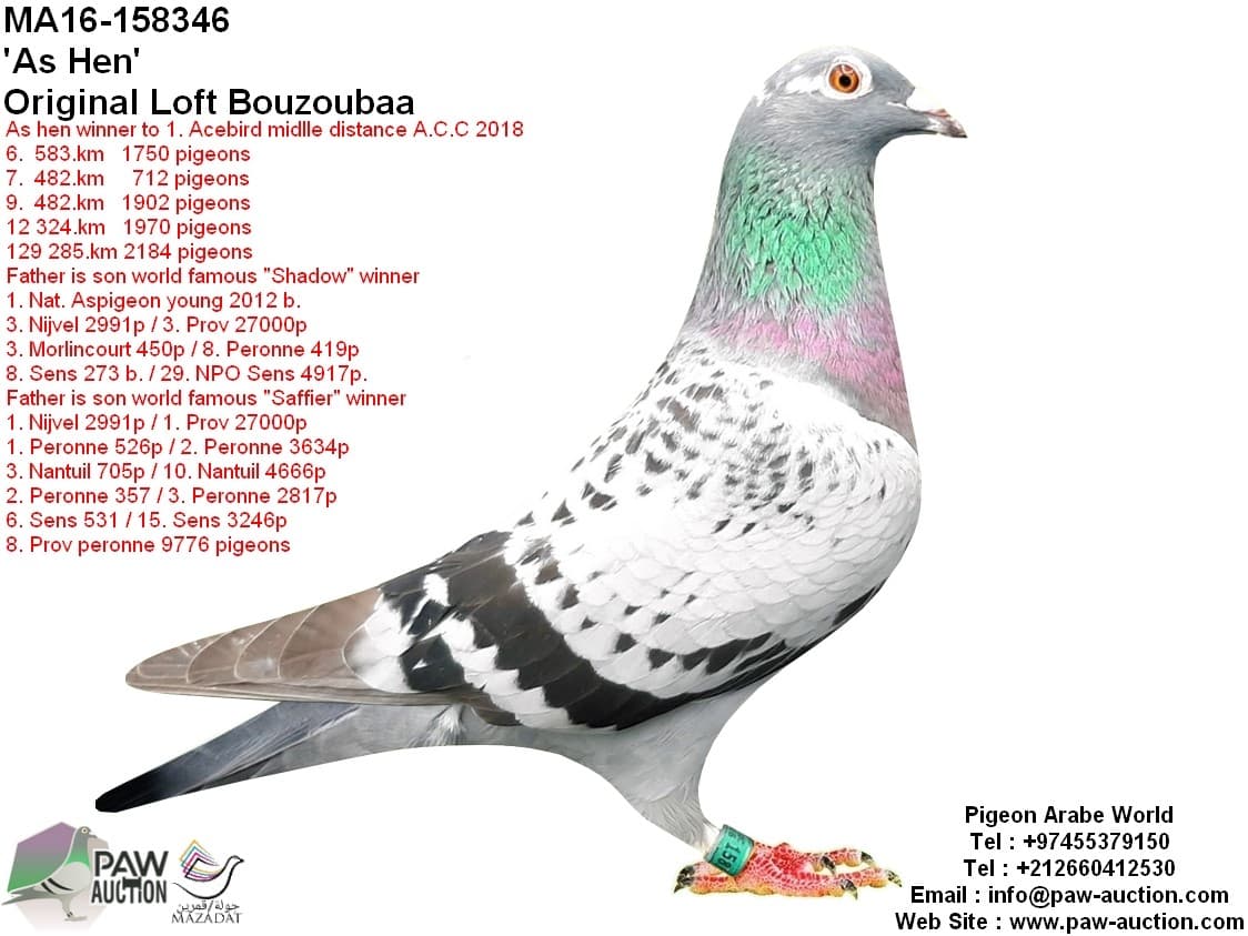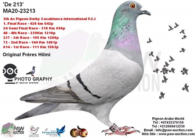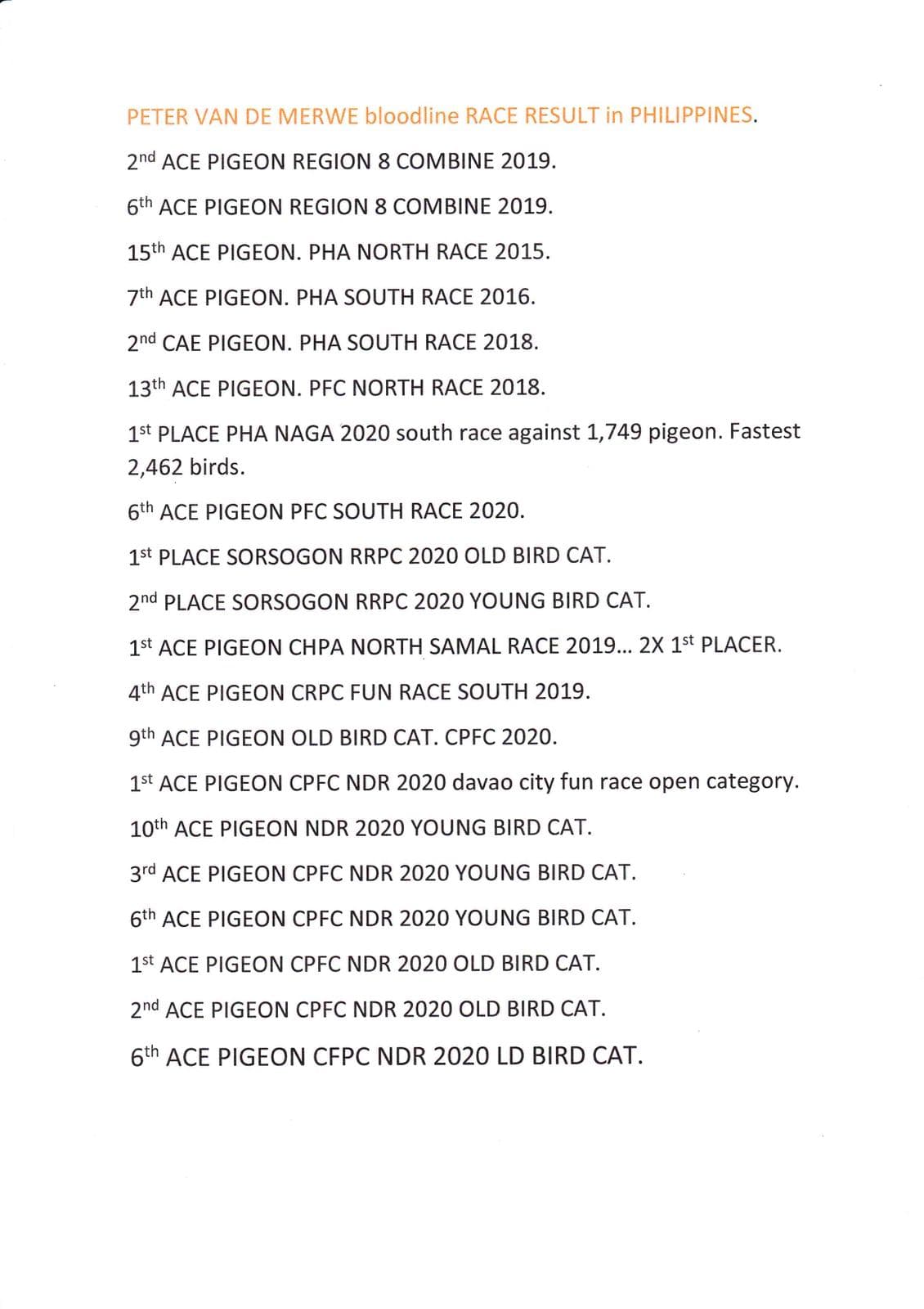2019 FCI VAC One Loft Race Headwind, hot weather with speed 1100m/m with another 4 pigeons came together and won 3rd prizes. The 6th pigeon came after almost 5 minutes later from 632 pigeons 315 km... His mother original Peter van de Merwe