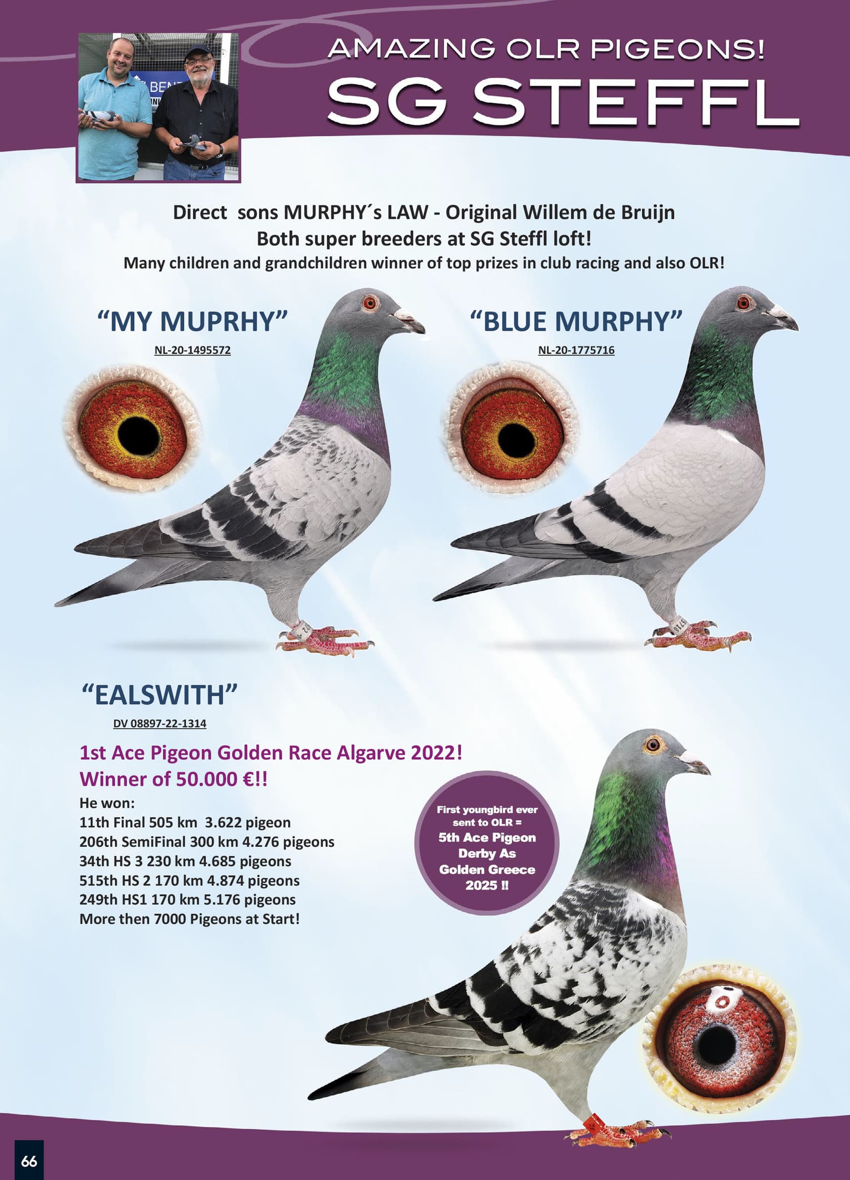 - NL-20-1495572 « MY MURPHY », fils direct de MURPHY'S LAW Willem de Bruijn. Il est le père de « Wimbledon », Champion Régional 2024, du Champion Régional Yearling 2024 23-398, et des pigeons 25-8499 et 25-8455, respectivement 1er et 2e Meilleurs Jeunes Pigeons 2025 au sein du Club et de l'Association Régionale. - « Fille Kristof » (née Willem de Bruijn), mère du 1er As Pigeon (Association Régionale) 2025 et du 2e As Pigeon (Association Régionale) 2025.