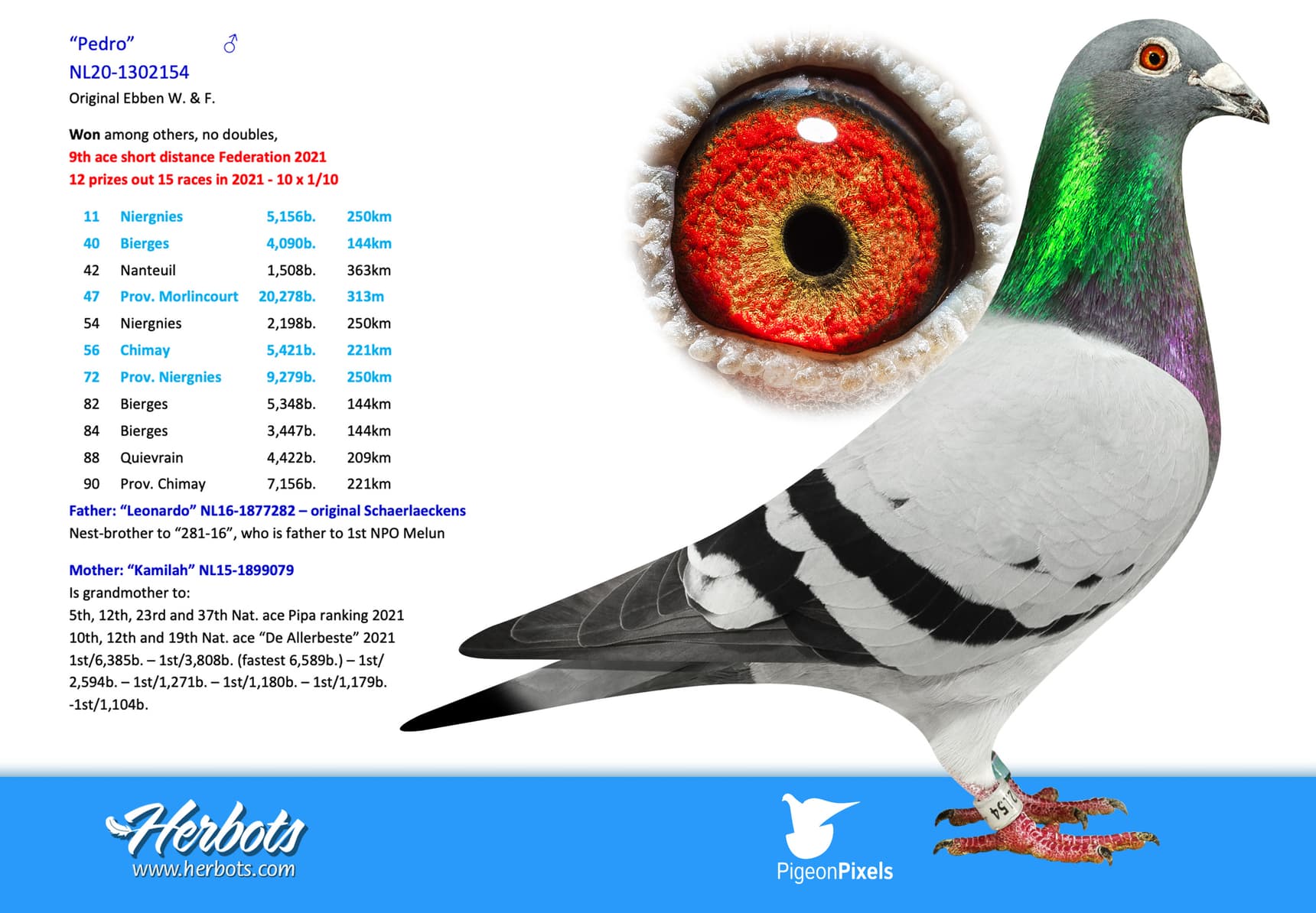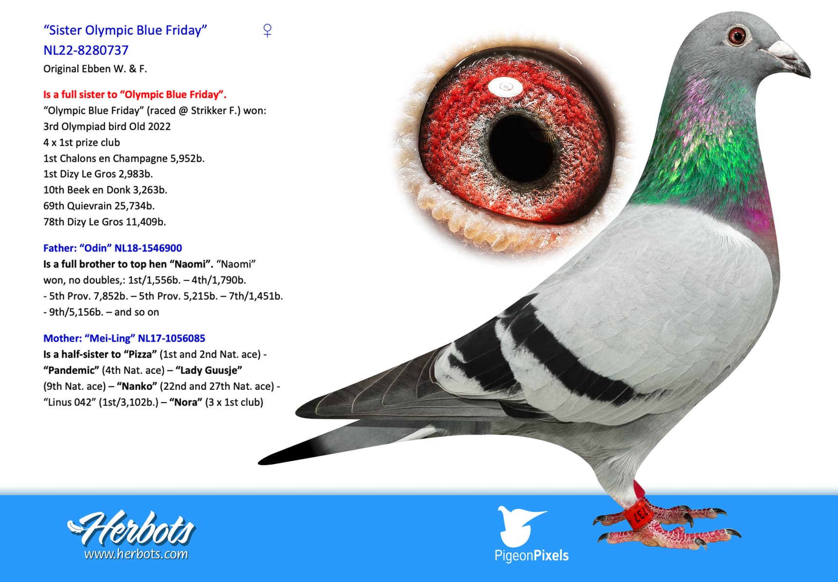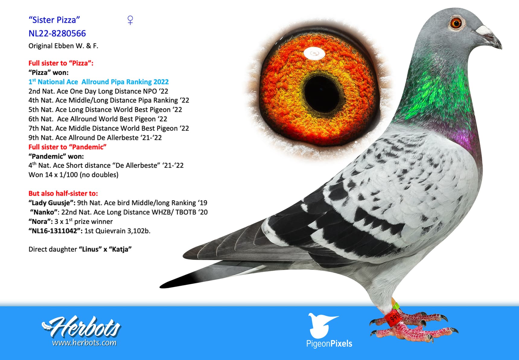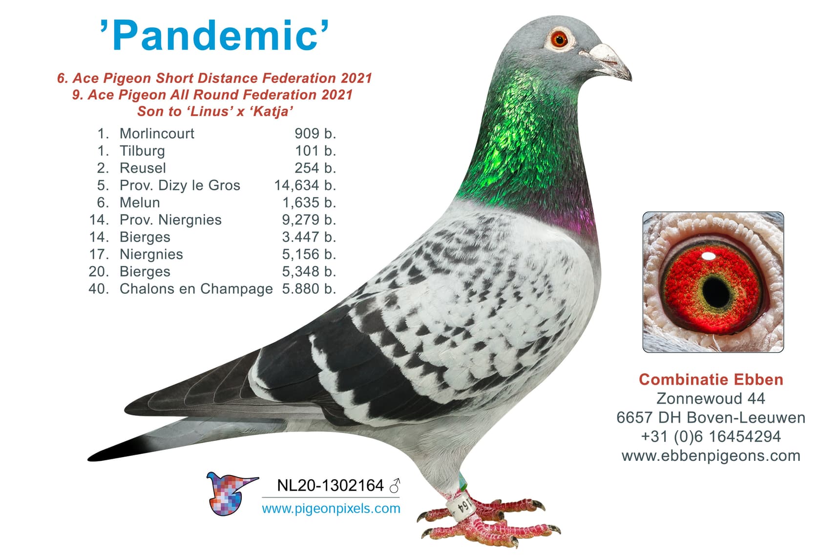 'Pandemic' is a son to NL16-1310994 'Linus' mated to NL15-1875429 'Katja'. 'Pandemic' is still in the racing loft of Combination Ebben, Boven-Leeuwen, and won 11 x 1:100 up till 21.05.2022: