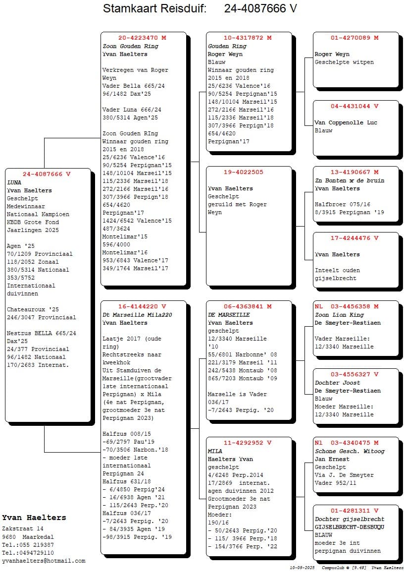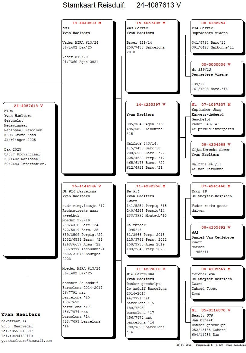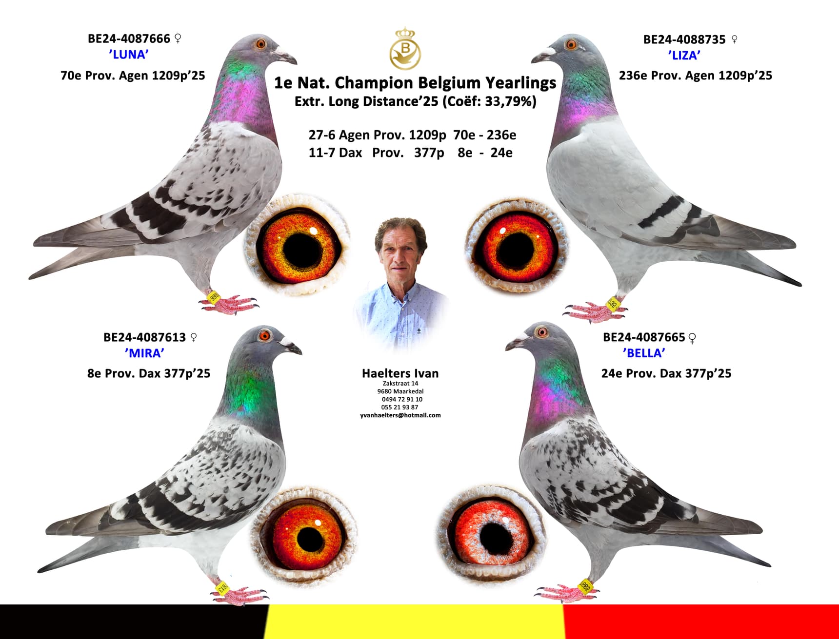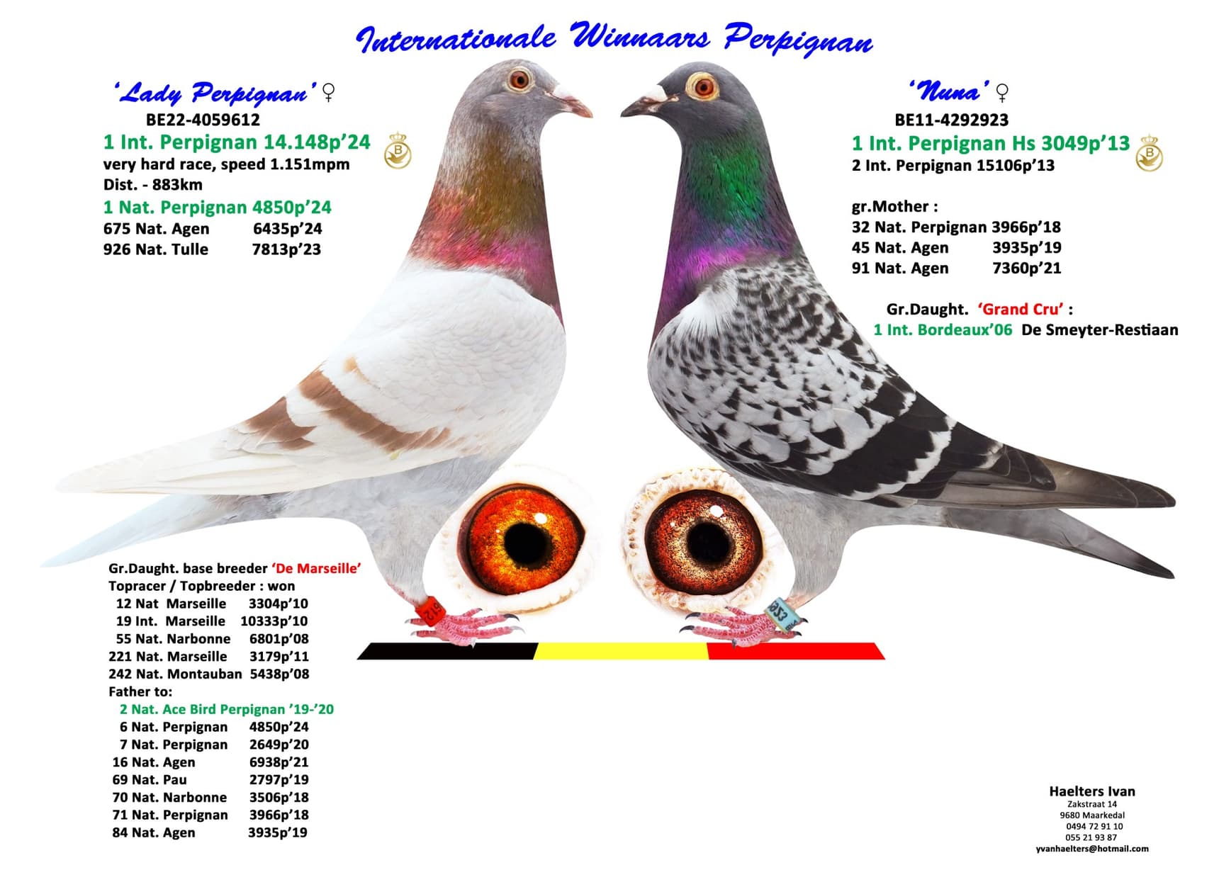 Accouplée à Mira, elle était également en période de reproduction. Elle s'est classée parmi les 100 meilleures au niveau national. Du côté paternel, sa lignée est un fils de Gouden Ring Waasland de Roger Weyn (également propriétaire des pigeons d'Yvan), accouplé à une fille de Marseille (12e national Marseille), elle-même accouplée à Milo (4e national Perpignan). Une lignée riche de pigeons champions nationaux, chacun ayant prouvé sa capacité à briller dans les compétitions les plus exigeantes.