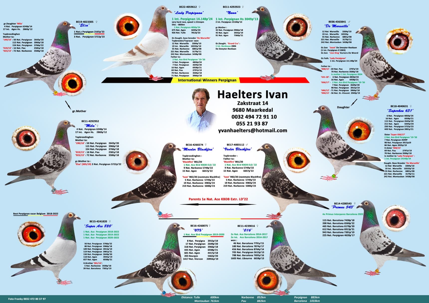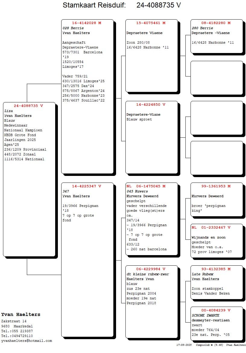 Cette femelle a réalisé une superbe performance lors d'une course exigeante à Dax. En période de reproduction, sa position au nid a permis d'exprimer pleinement son potentiel. Son père est issu d'un croisement entre notre ancienne lignée et un mâle de l'ancien tandem Depraetere-Viaene de Maarkedal. Du côté maternel, on retrouve notre ancienne lignée avec une touche De Smeyter-Restiaen.