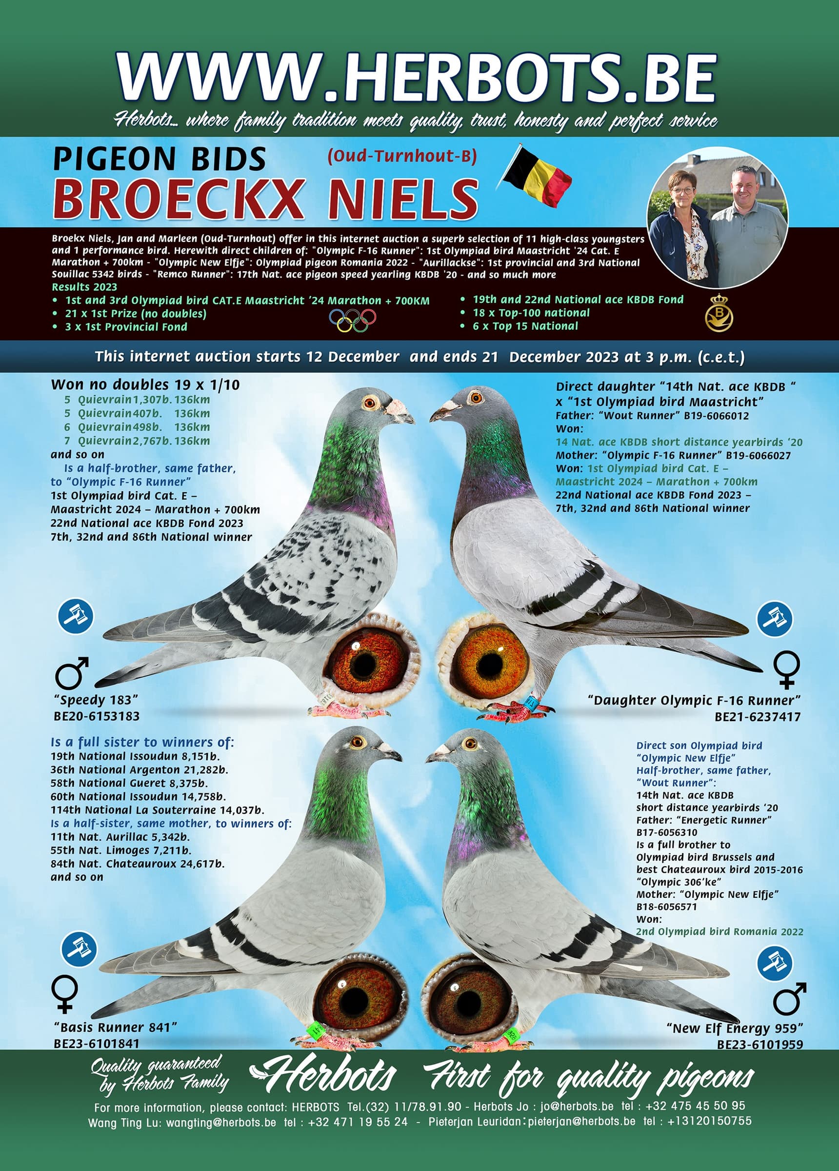 Broekx Niels, Jan and Marleen (Oud-Turnhout) offer in this internet auction a superb selection of 11 high-class youngsters and 1 performance bird.
