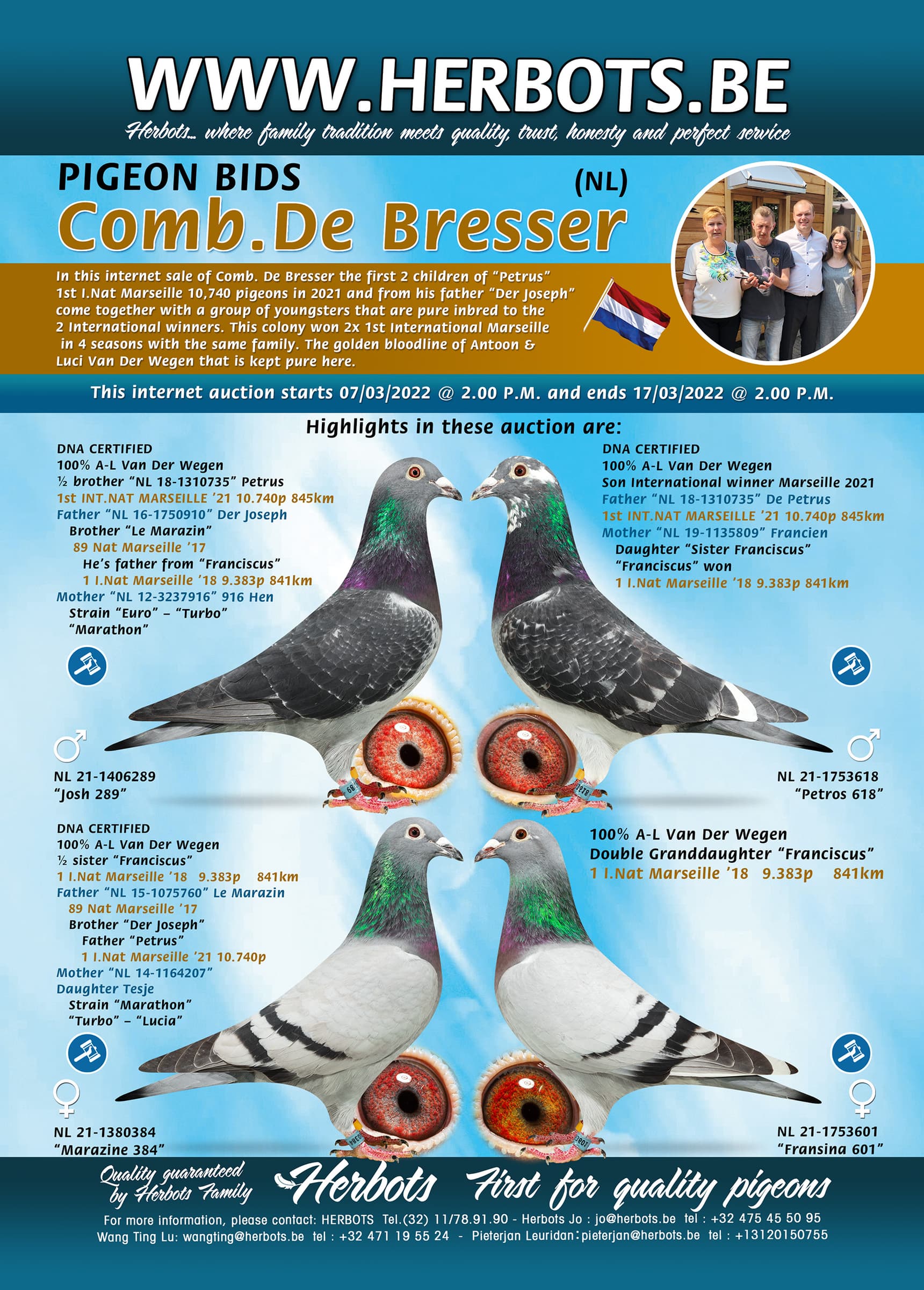In this internet sale of Comb. De Bresser the first 2 children of “Petrus” 1st I.Nat Marseille 10,740 pigeons in 2021 and from his father “Der Joseph” come together with a group of youngsters that are pure inbred to the 2 International winners. This colony won 2x 1st International Marseille in 4 seasons with the same family. The golden bloodline of Antoon & Luci Van Der Wegen that is kept pure here.