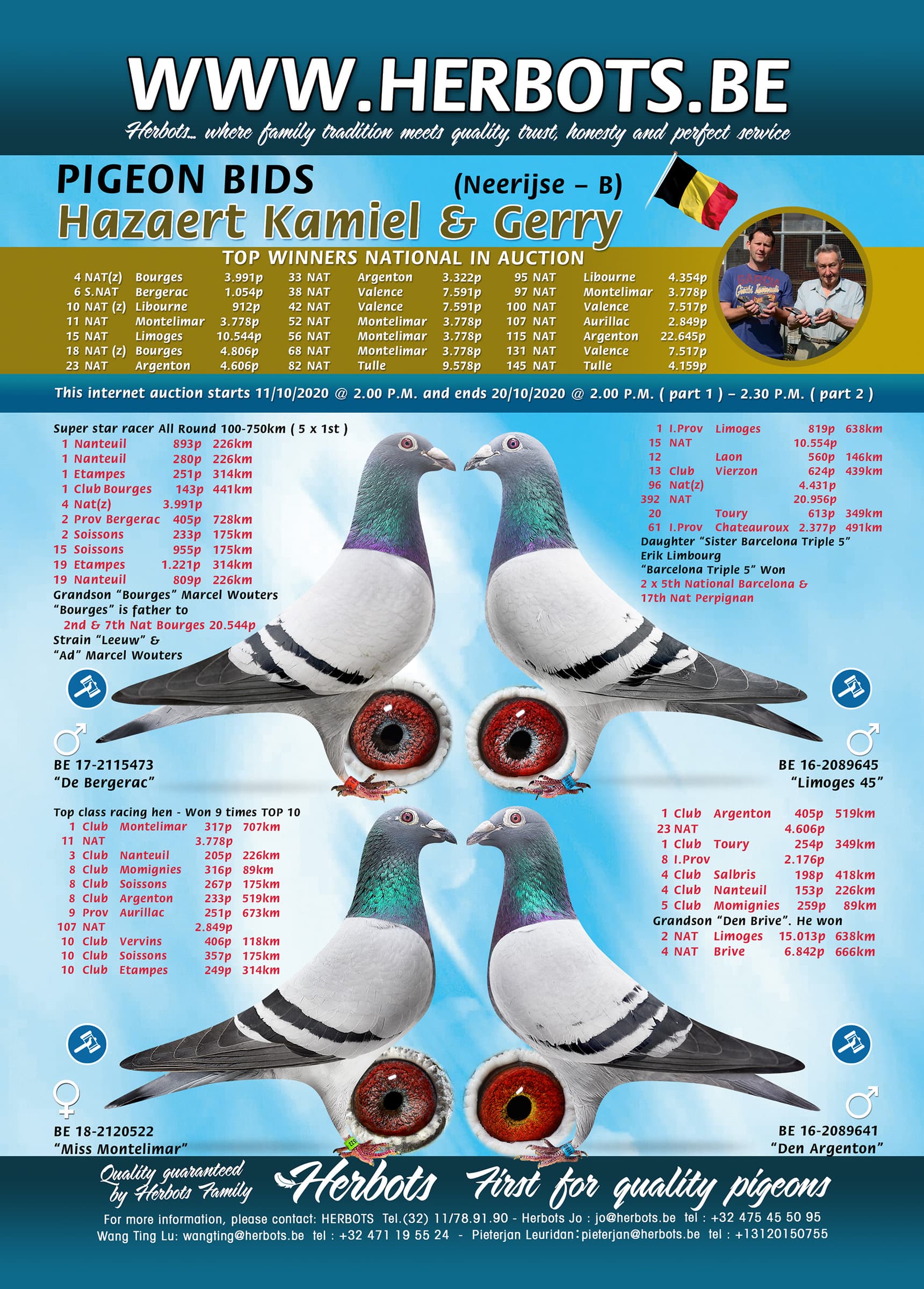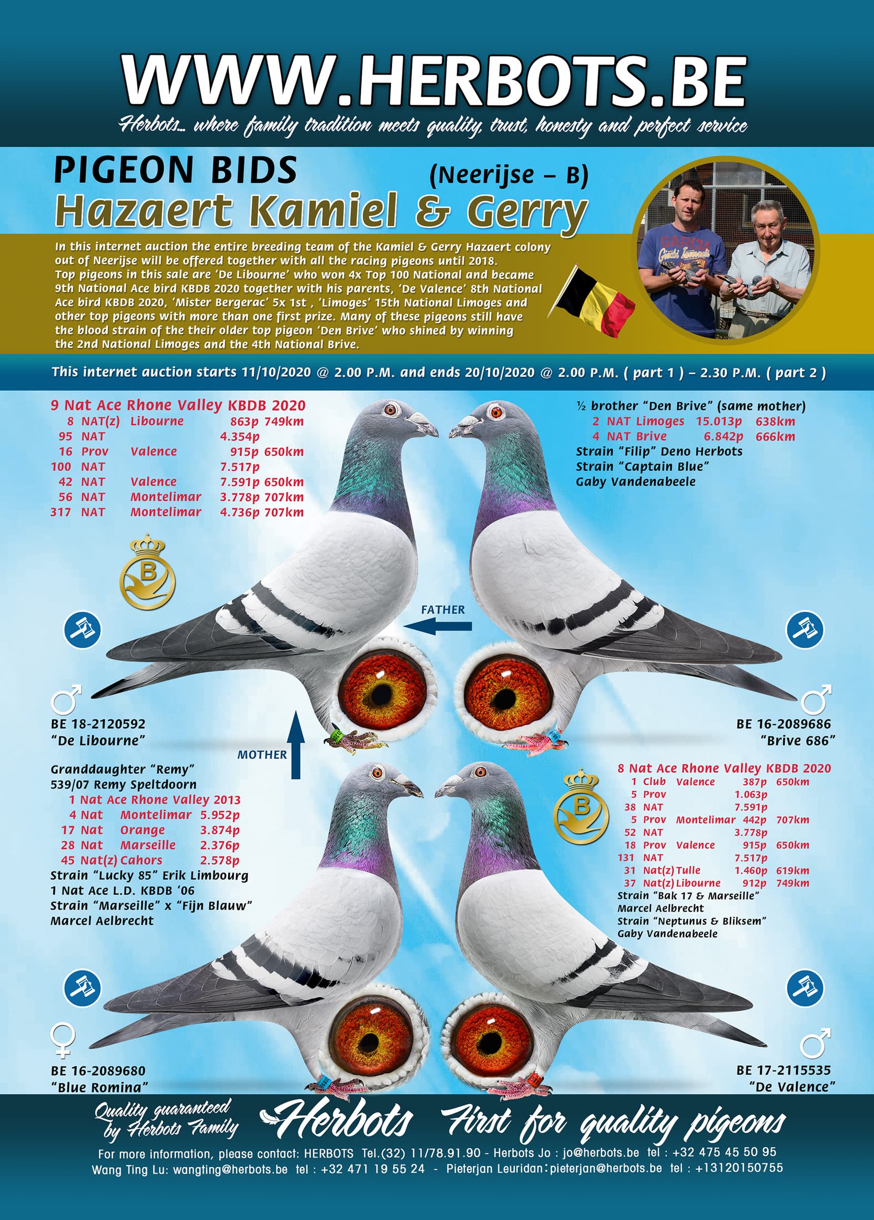 Lors de cette vente aux enchères, toute l'équipe d'élevage de la colonie Kamiel & Gerry Hazaert de Neerijse sera offrées, ainsi que tous les pigeons de compétition jusqu'en 2018. Les meilleurs pigeons de cette vente sont 'De Libourne' qui a gagné 4x Top 100 National et est devenu 9ème As National KBDB 2020 avec ses parents, 'De Valence' 8ème As National KBDB 2020, 'Mister Bergerac' 5x 1er , 'Limoges' 15ème National Limoges et d'autres pigeons avec plus d'un premier prix. Beaucoup de ces pigeons ont encore la souche de sang de leur ancien pigeon de tête 'Den Brive' qui a brillé en gagnant le 2ème National Limoges et le 4ème National Brive.