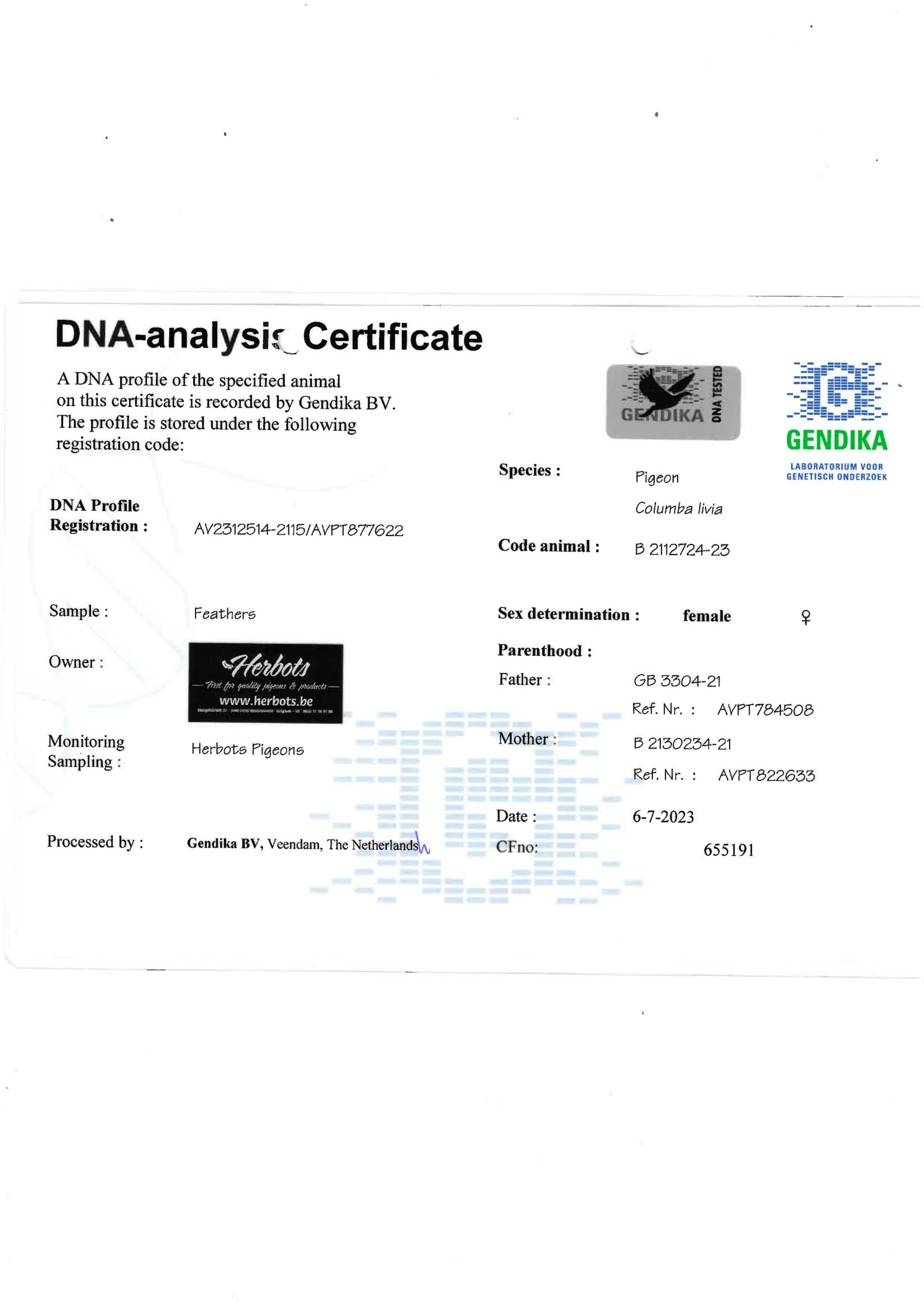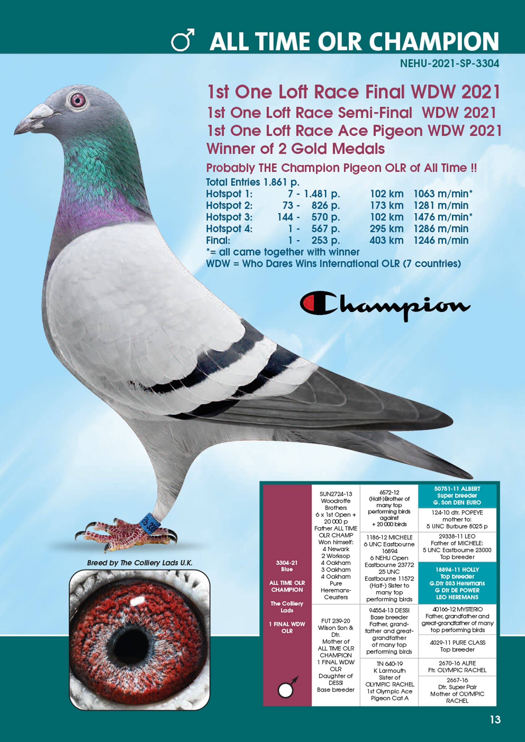 Direct daughter “New Nationaal I” x “B17-2140106” (won 1st Vierzon 621b. – 5th St. Aubin 315b. – 6th Chateauroux 721b. – 12th Vierzon 4,407b. – 29th Bourges 4,454b. – 29th La Ferte 1,583b. – 32nd Argenton 2,178b. – 39th Tulle 1,335b. – 61st Bourges 2,481b.)
