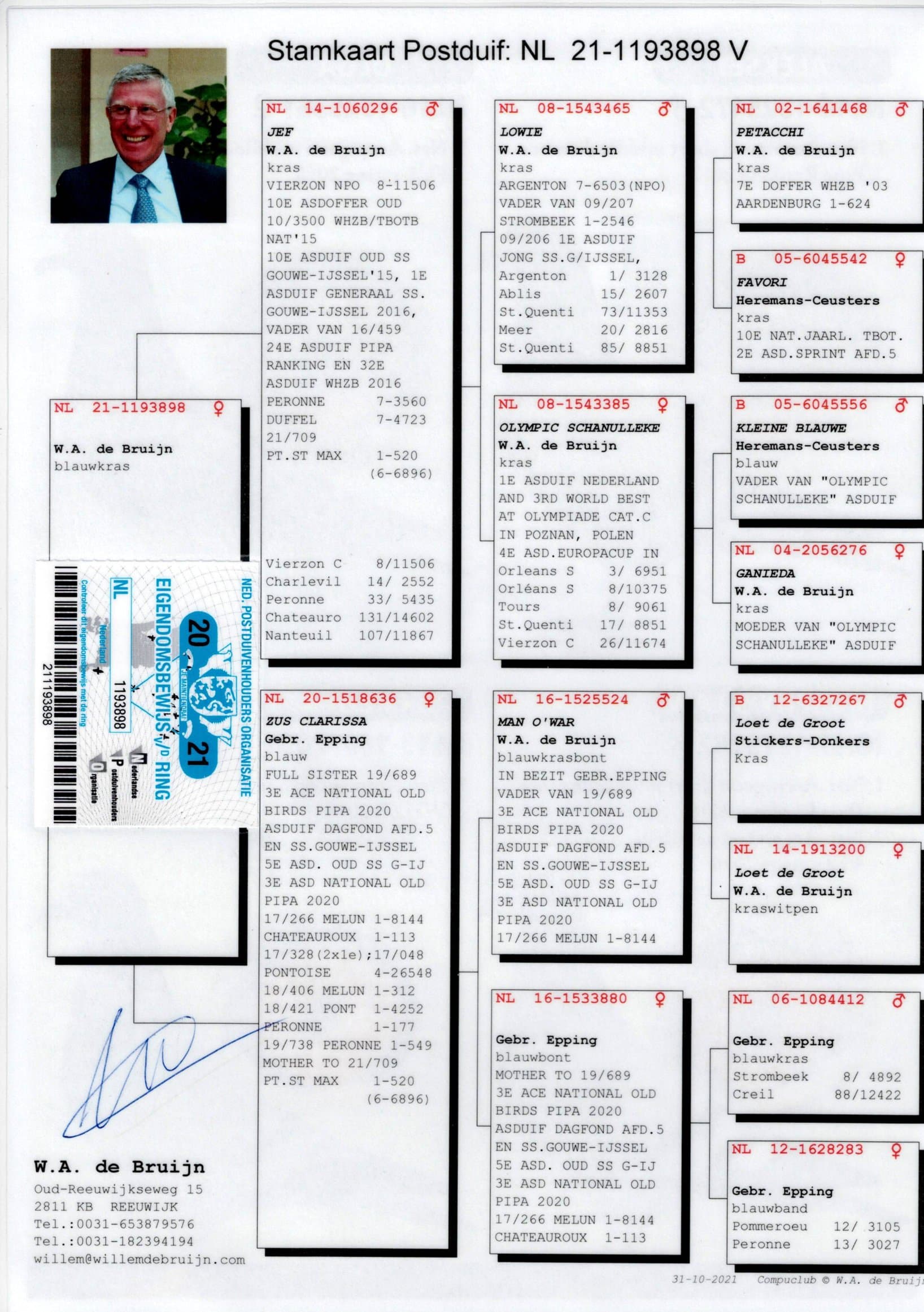 Direct daughter “Jef” (won 8th/11,506b. – direct son “Olympic Schanulleke”) x “Zus Clarissa” (full sister 3rd Nat Ace bird)
