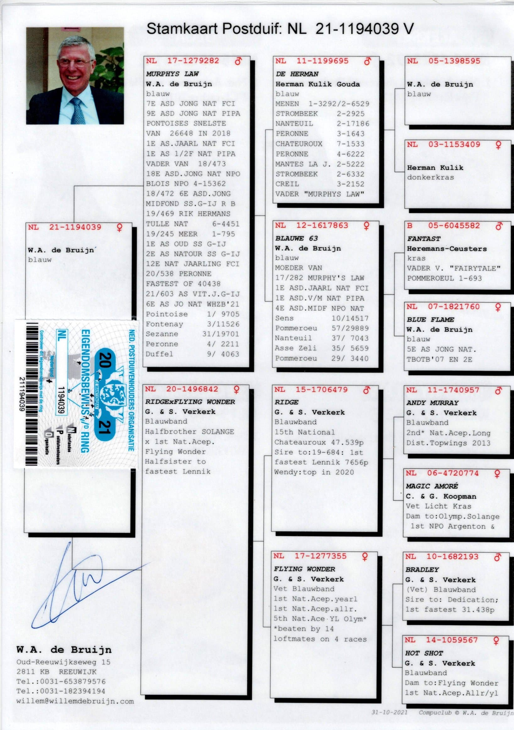 Éleveur : 100% WILLEM DE BRUIJN 纯威廉迪布恩血统