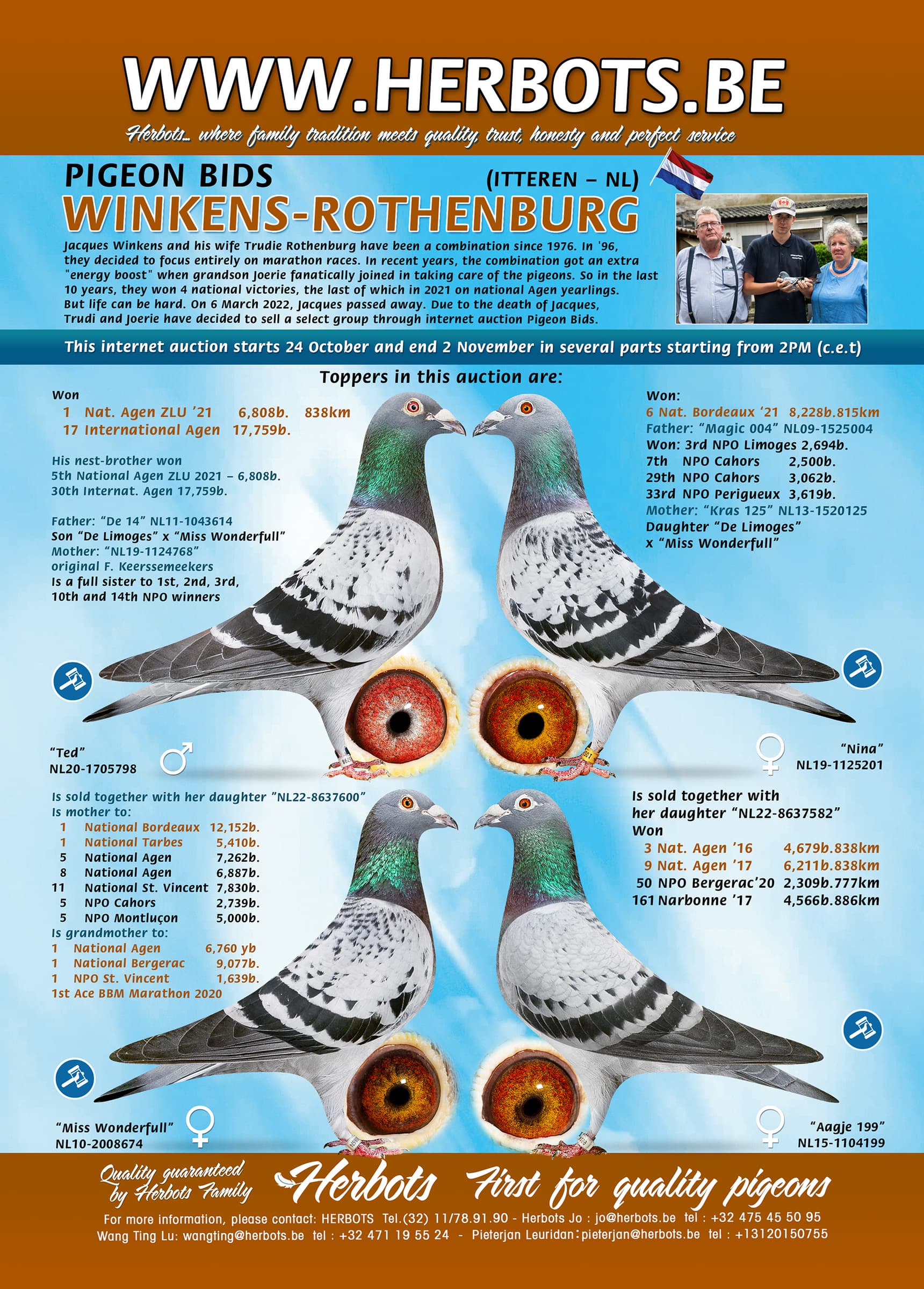 Won 1st Prov. Limoges 1,279b. and is father to “Lotte” (1st Nat. Bordeaux ’14) and “Floortje” (1st Nat. Tarbes ’15)