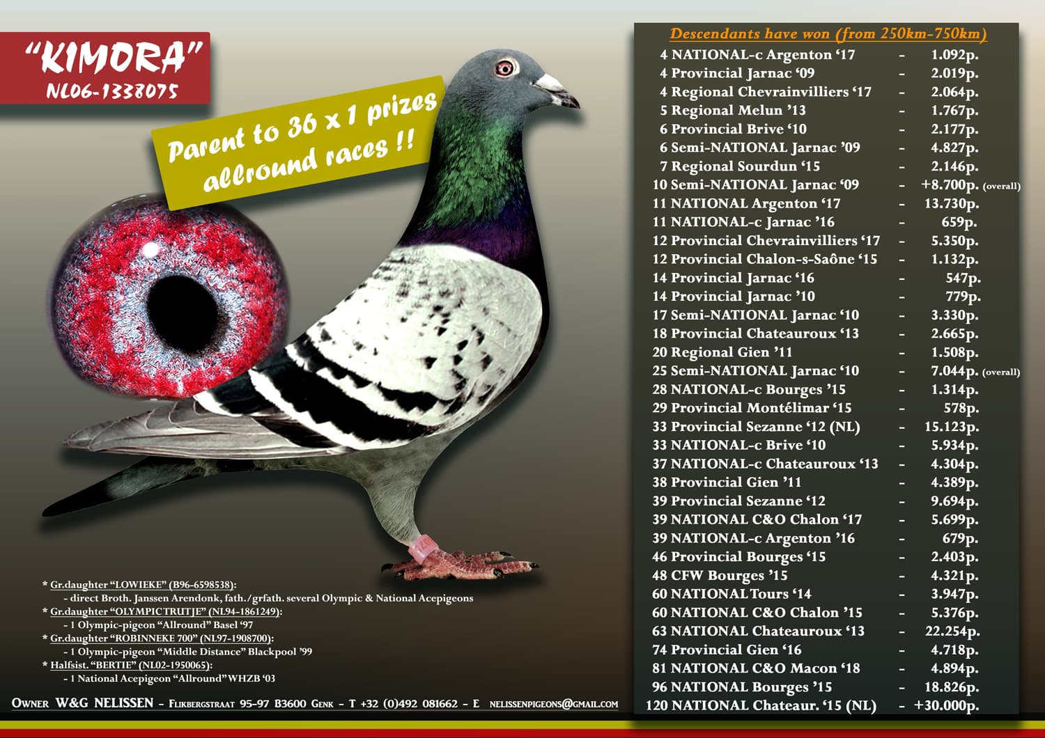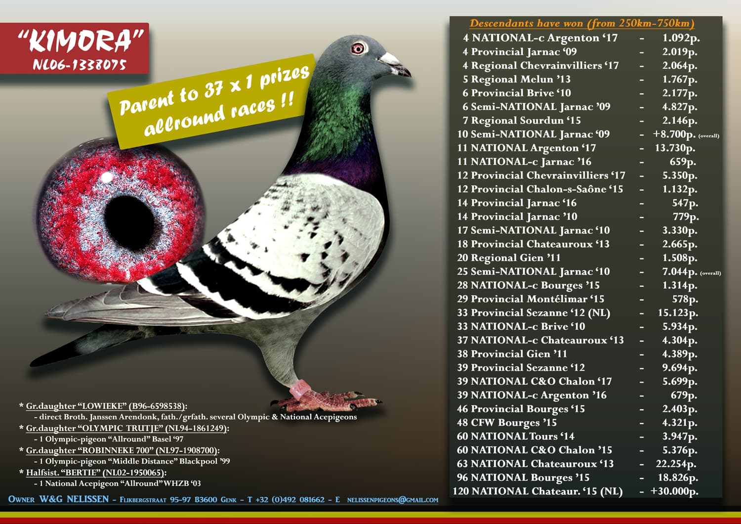 mother is inbred 'KIMORA' (parent to 37 x 1st & several NAT. topresults)