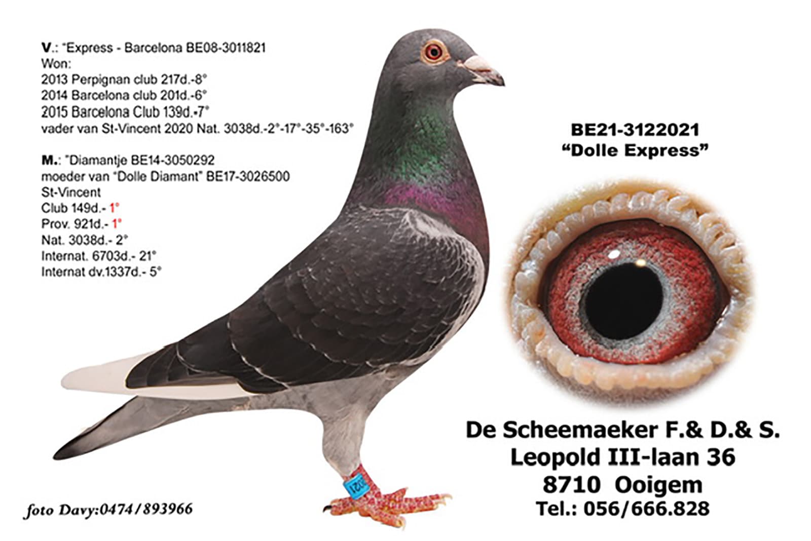 Father is ""EXPRESS BARCELONA": 6+7 Club Barcelona, Mother is "DIAMANTJE": mother of "DOLLE DIAMANT": 1 Prov. St.Vincent