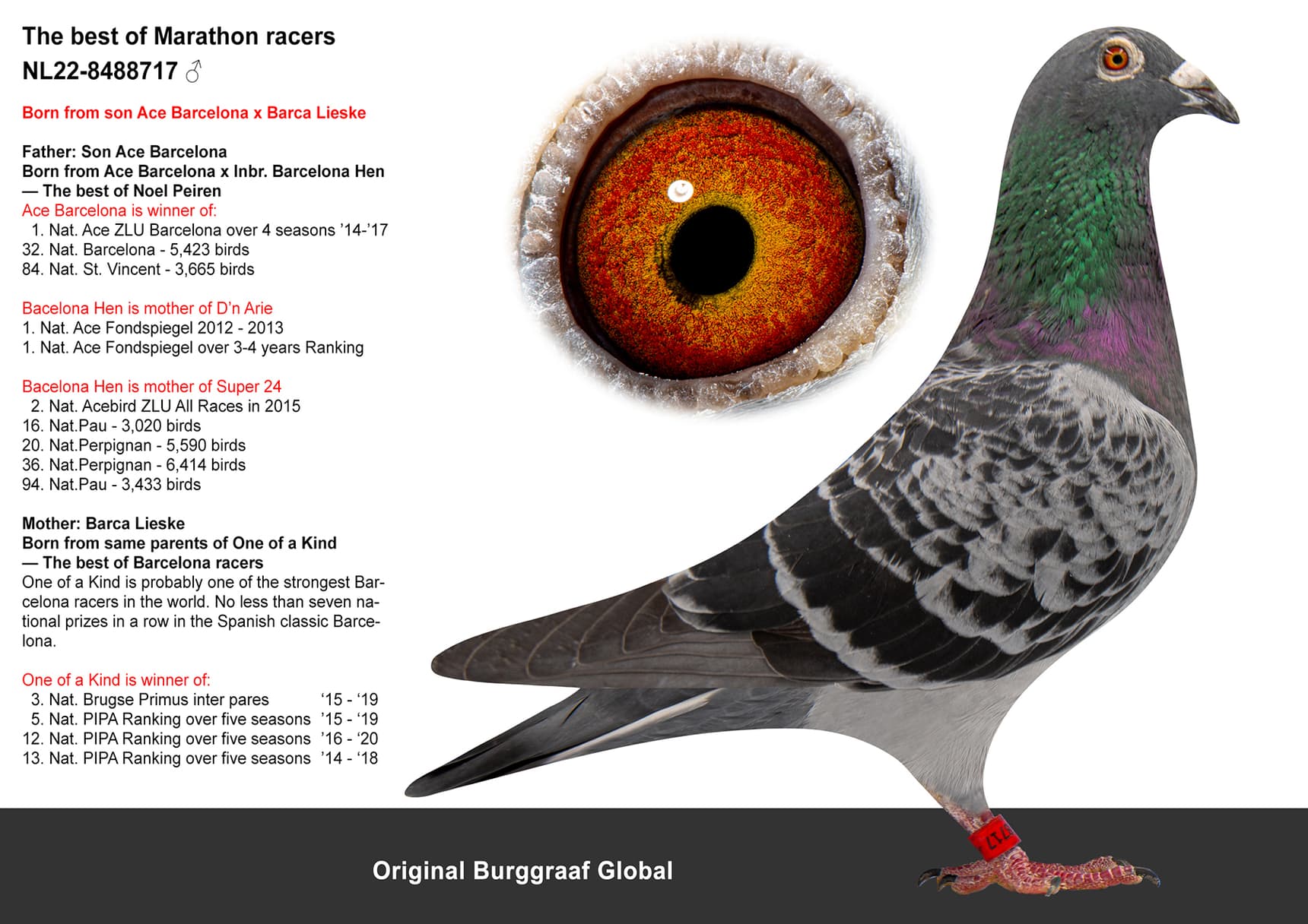 An exceptional bird, who won seven national prizes in a row in the Spanish classic Barcelona. With in his genes: ‘De Donkere Barcelona, De Pijl, Figo, Arnold, De Barcelona, Barcelonake & Barcelona II (brother BARCELONA I)’  this pigeon has a very strong DNA profile.