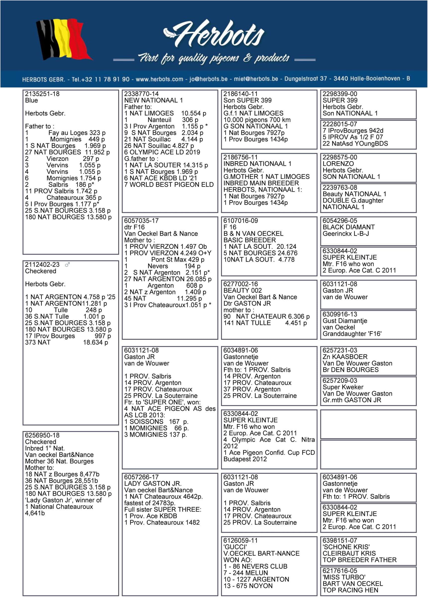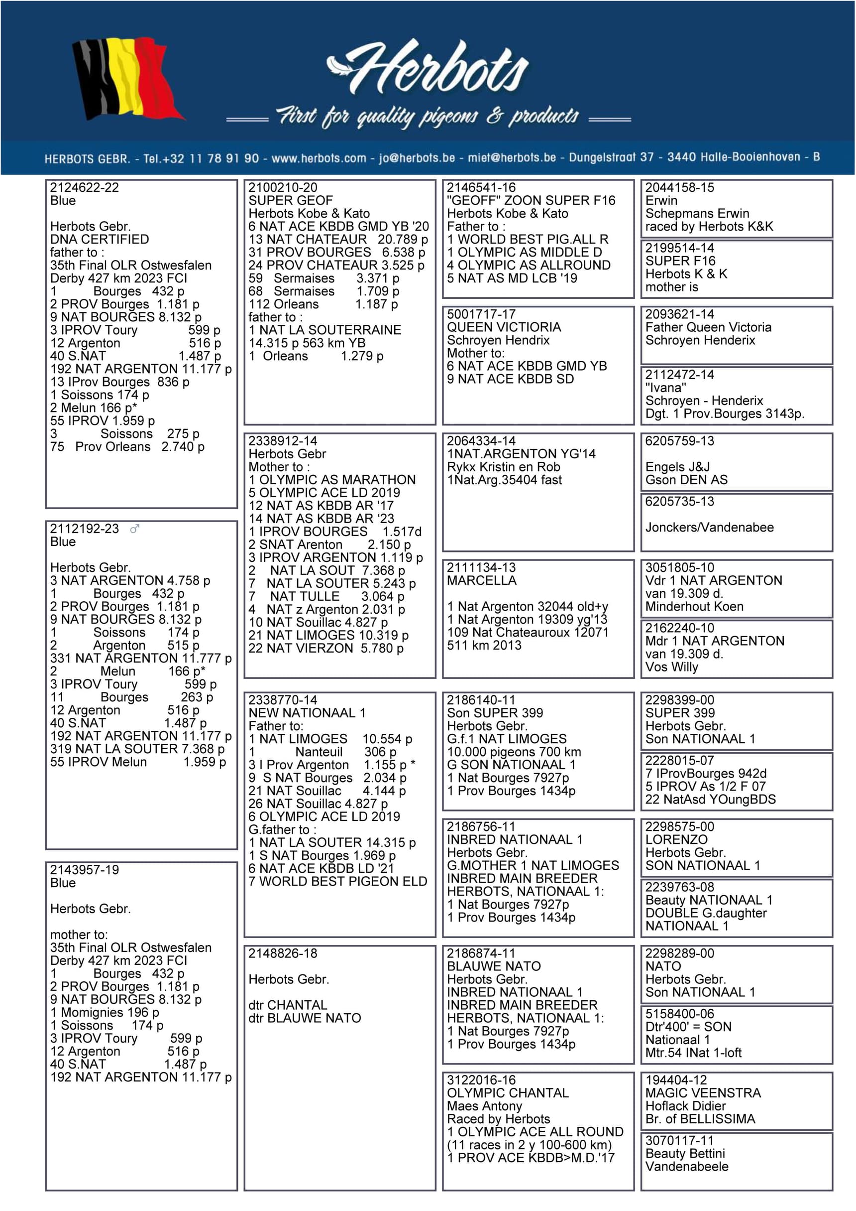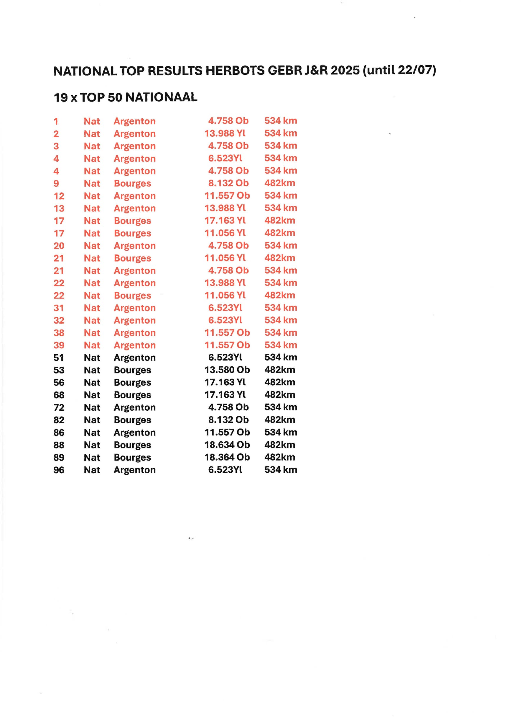 Avec encore plusieurs concours nationaux à venir pour les vieux et les yearlings, et vu l’état de forme actuel dans les colombiers Herbots, nous avons hâte de voir quels résultats vont encore tomber du ciel de Halle-Booienhoven dans les semaines à venir.