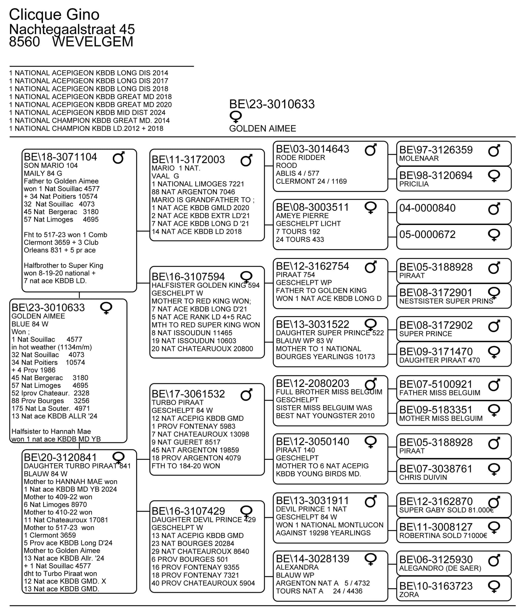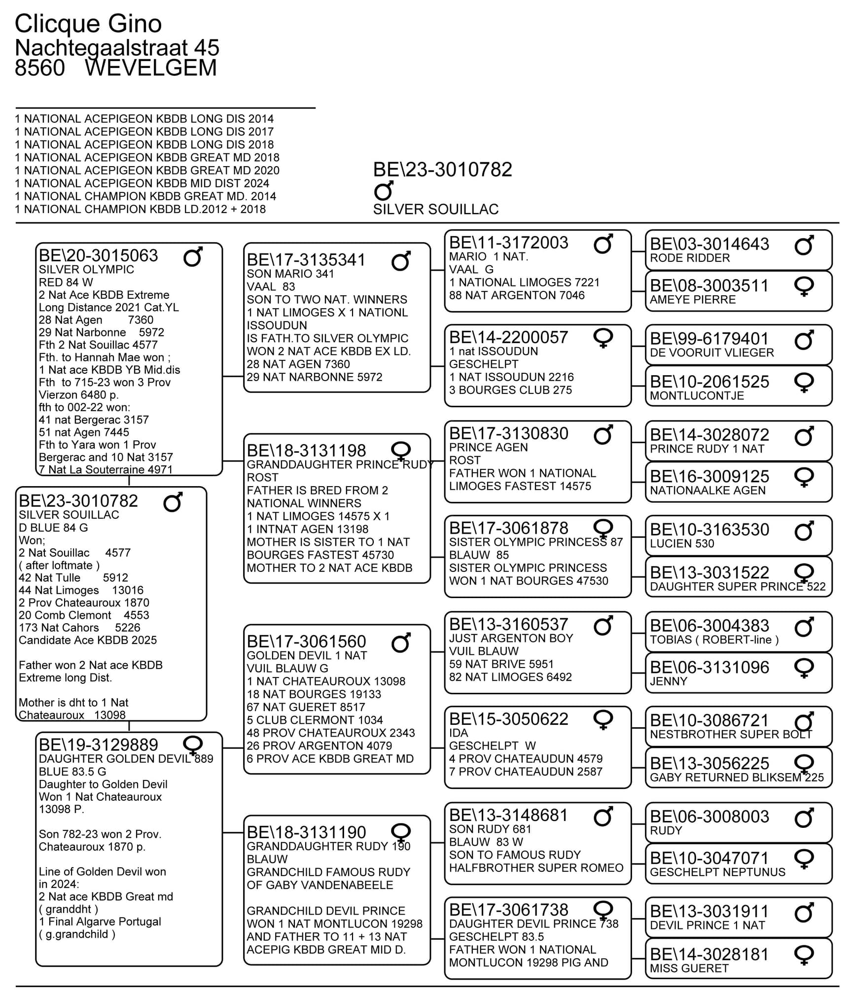 Gino, sa fille Laura et son fils Jasper enchaînent les titres de pigeon as national, les championnats KBDB nationaux et les victoires nationales. L’année dernière, ils ont remporté le titre de 1er Champion National ½ Fond Jeunes Pigeons, et un article détaillé à ce sujet est disponible sur le site Herbots.