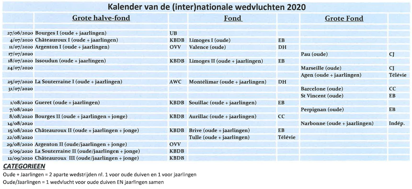 1. Kalender van de (inter)nationale wedvluchten 2020 (bijgevoegd)