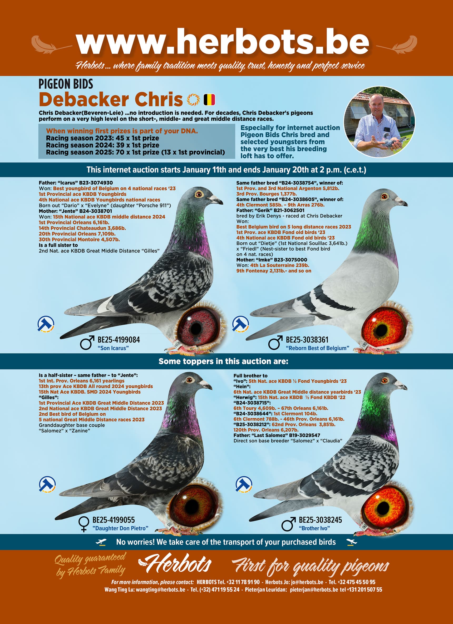 Chris Debacker selecteerde voor internet verkoop Pigeon Bids een top groep van duiven geboren uit het allerbeste wat zijn kolonie te bieden heeft.