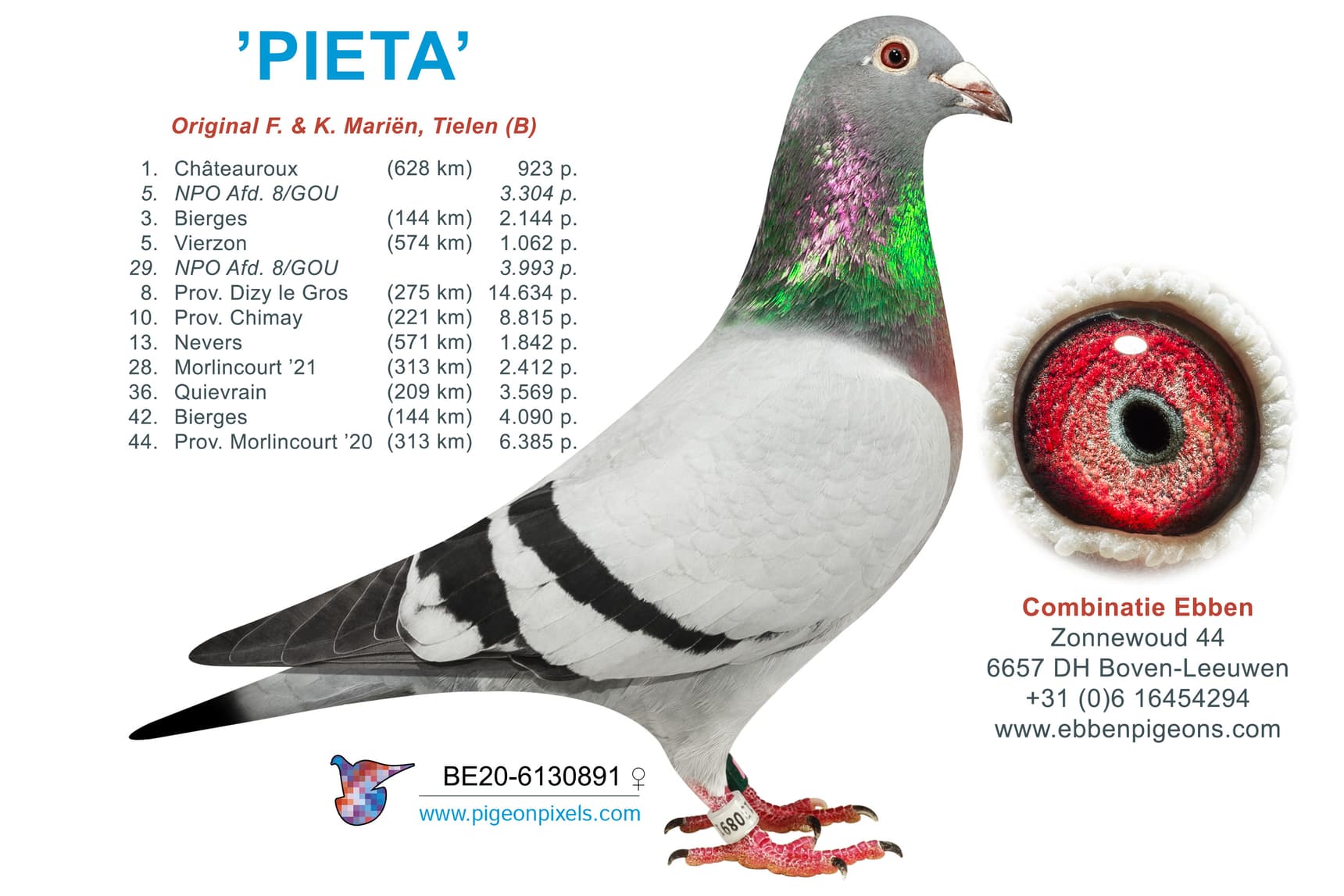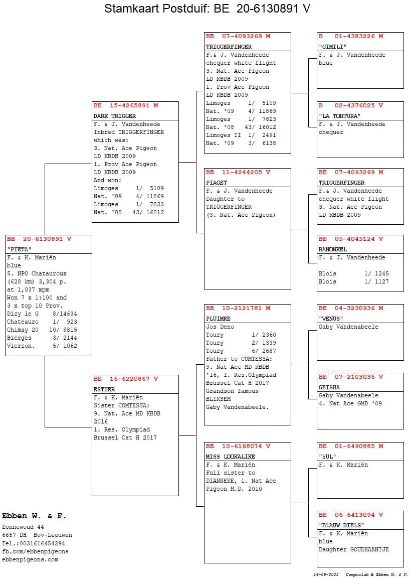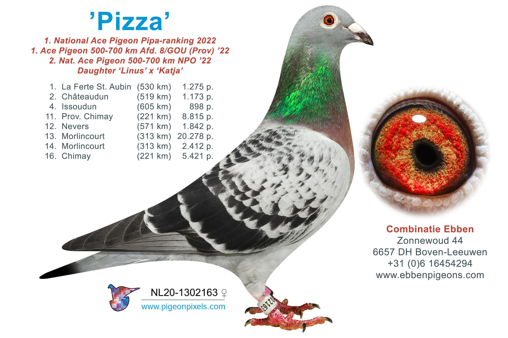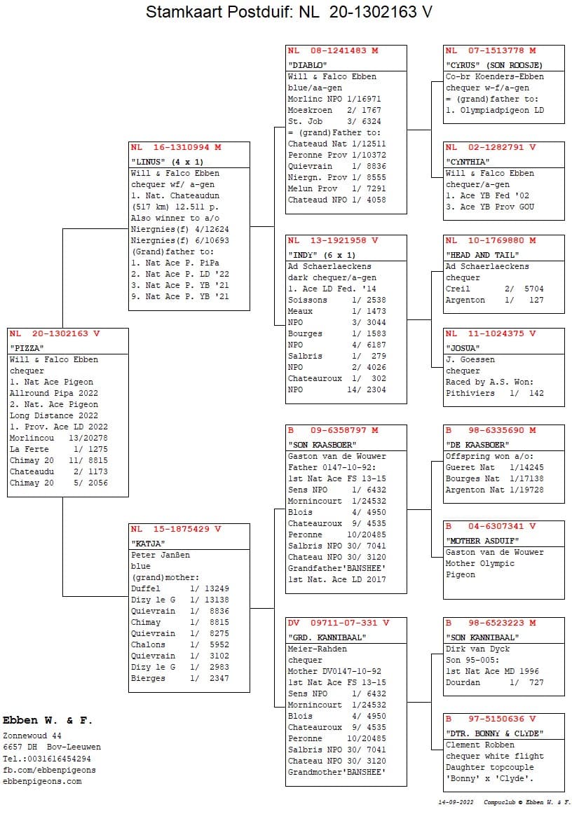 Wat een luxe moet het zijn om over zulke zeldzame toppers te beschikken. “Pizza”NL20-1302163, een super duivin met een uniek palmares (zie foto). Geen wonder dat deze duivin zo sterk presteert want ze is het resultaat van de perfecte mix tussen “Linus” en “Katja”