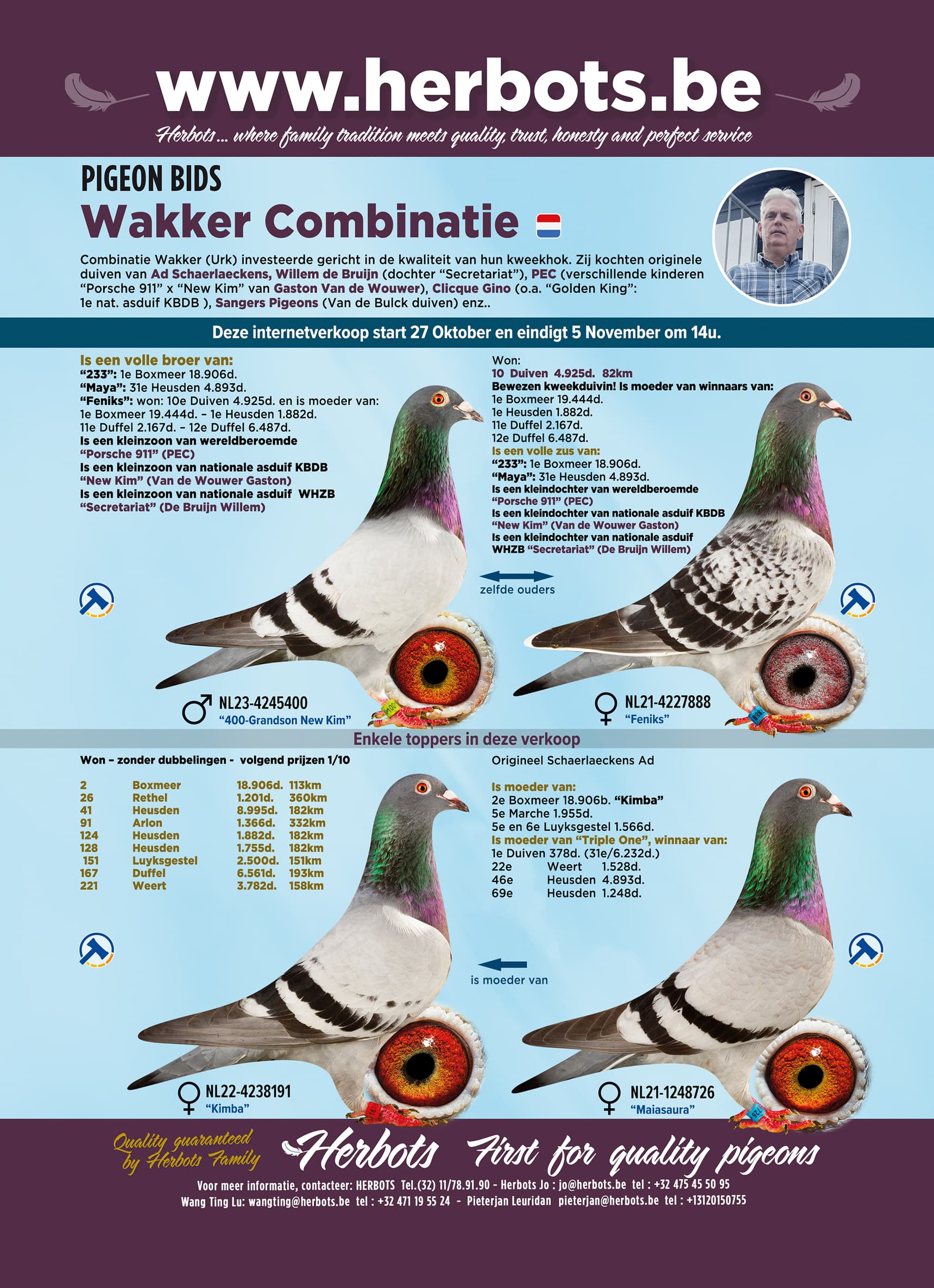 Een verkoop waar we toch graag jullie aandacht willen voor vragen is deze van Combinatie Wakker uit Urk (Nederland). Gerrit Wakker investeerde de laatste jaren heel veel geld in het allerbeste wat de internationale duivensport te bieden heeft en uit deze sterke basis biedt Gerrit duiven aan.